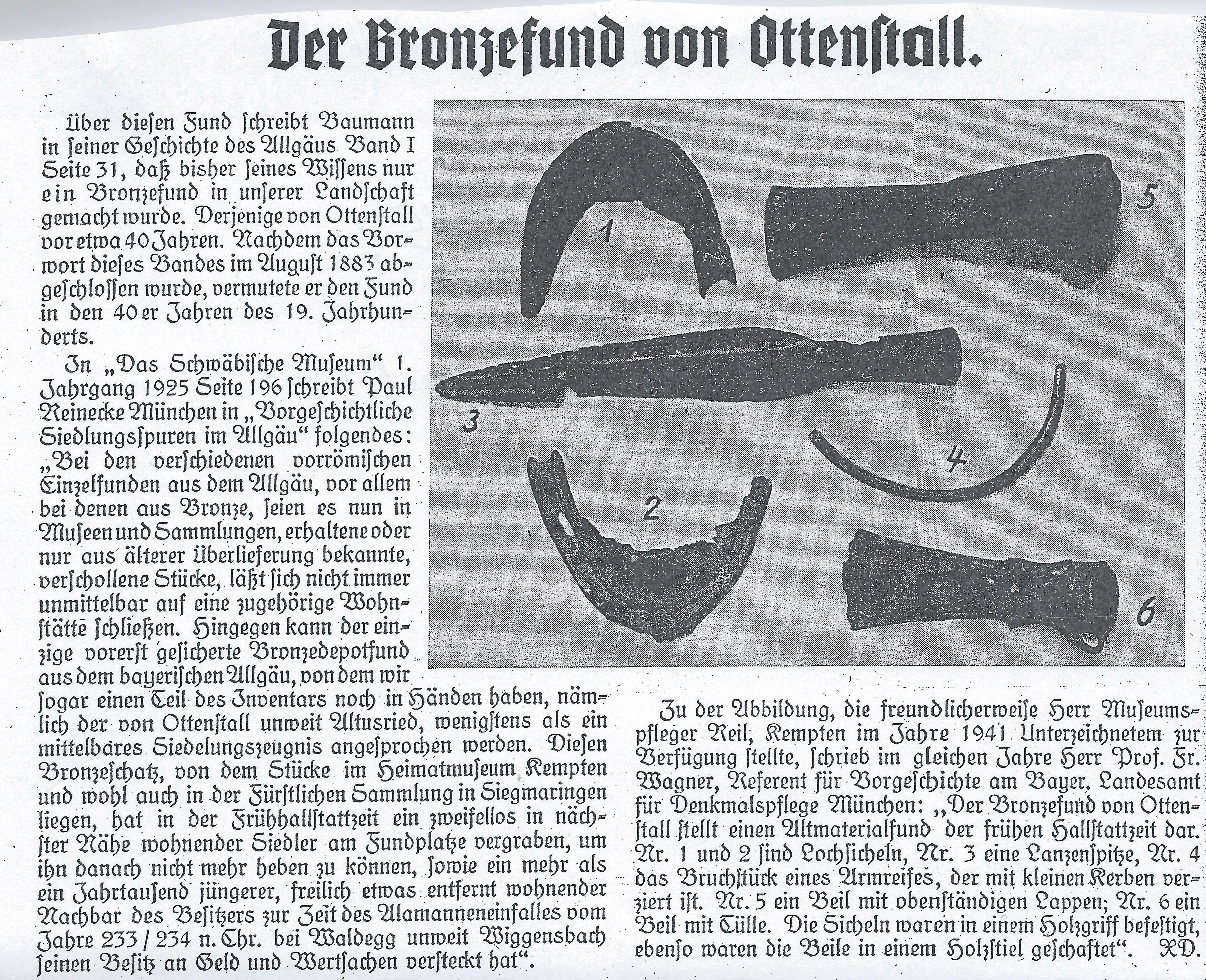 Vom archäologischen Standpunkt aus ist der kleine Weiler Ottenstall ein bedeutender Ort . Geschützt und geborgen in dem schmalen Rohrachtal gab es hier schon in frühester Zeit eine Siedlung. Als unsichere Zeiten kamen, versteckte ein Einwohner seinen wertvollsten Besitz in der Erde. Es waren Waffen, Geräte und Schmuck aus Bronze. Dreitausend Jahre später wurden sie wieder gefunden. Leider wurde der Bronzeschatz nicht gewissenhaft aufbewahrt und ist heute verschollen.