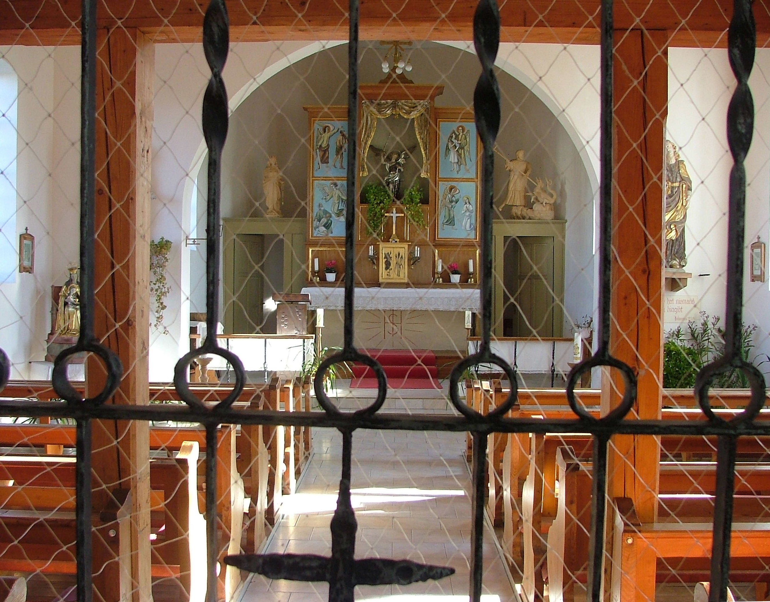 - Erbaut 1952, Saalbau mit eingezogenem Chor , Dachreiter und Zwiebelhaube, historische Ausstattung , Diesenbach 4