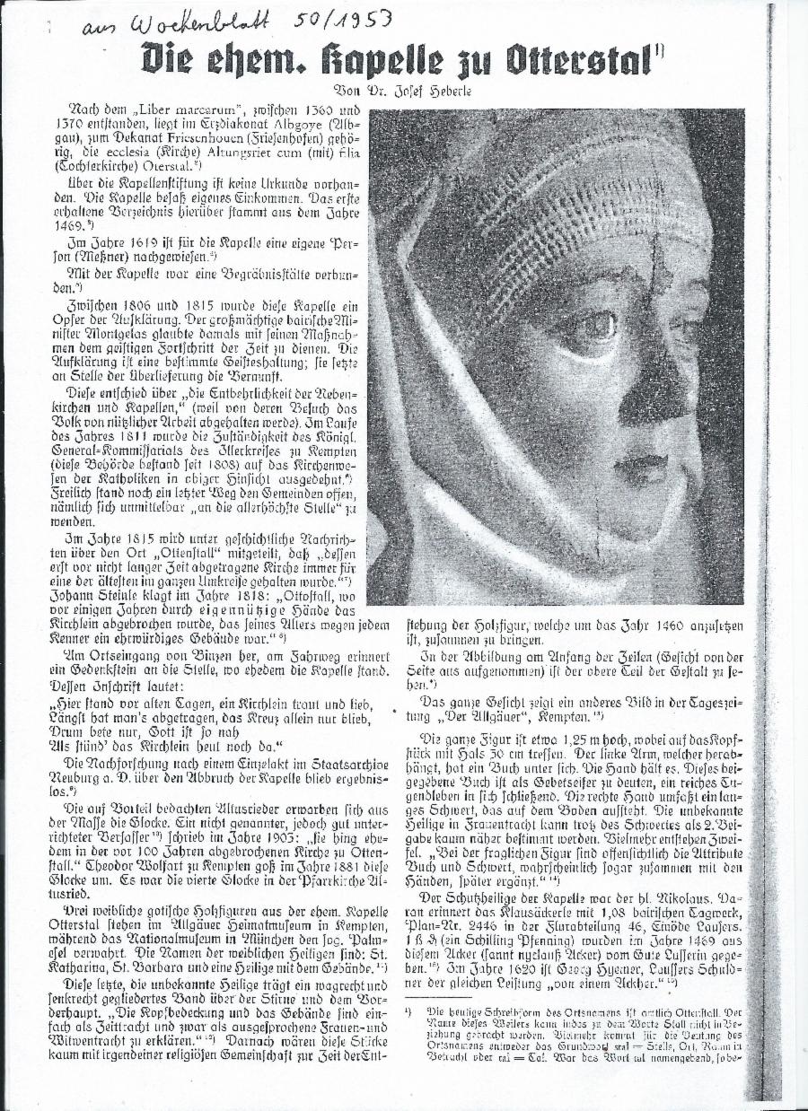 Im Wochenblatt 50/1953 veröffentlicht Dr. Heberle einen Bericht über die ehemalige Kapelle zu Otterstal (Ottenstall). Auf der alten Postkarte von 1920 noch eine Variation zum Namen des Ortes Ottenstall, Dr.Heberle entscheidet sich für Otterstal, der Kartendrucker für Ottostall.