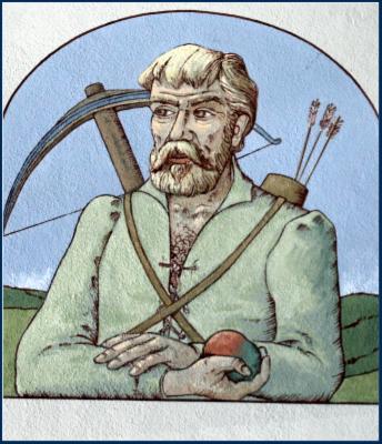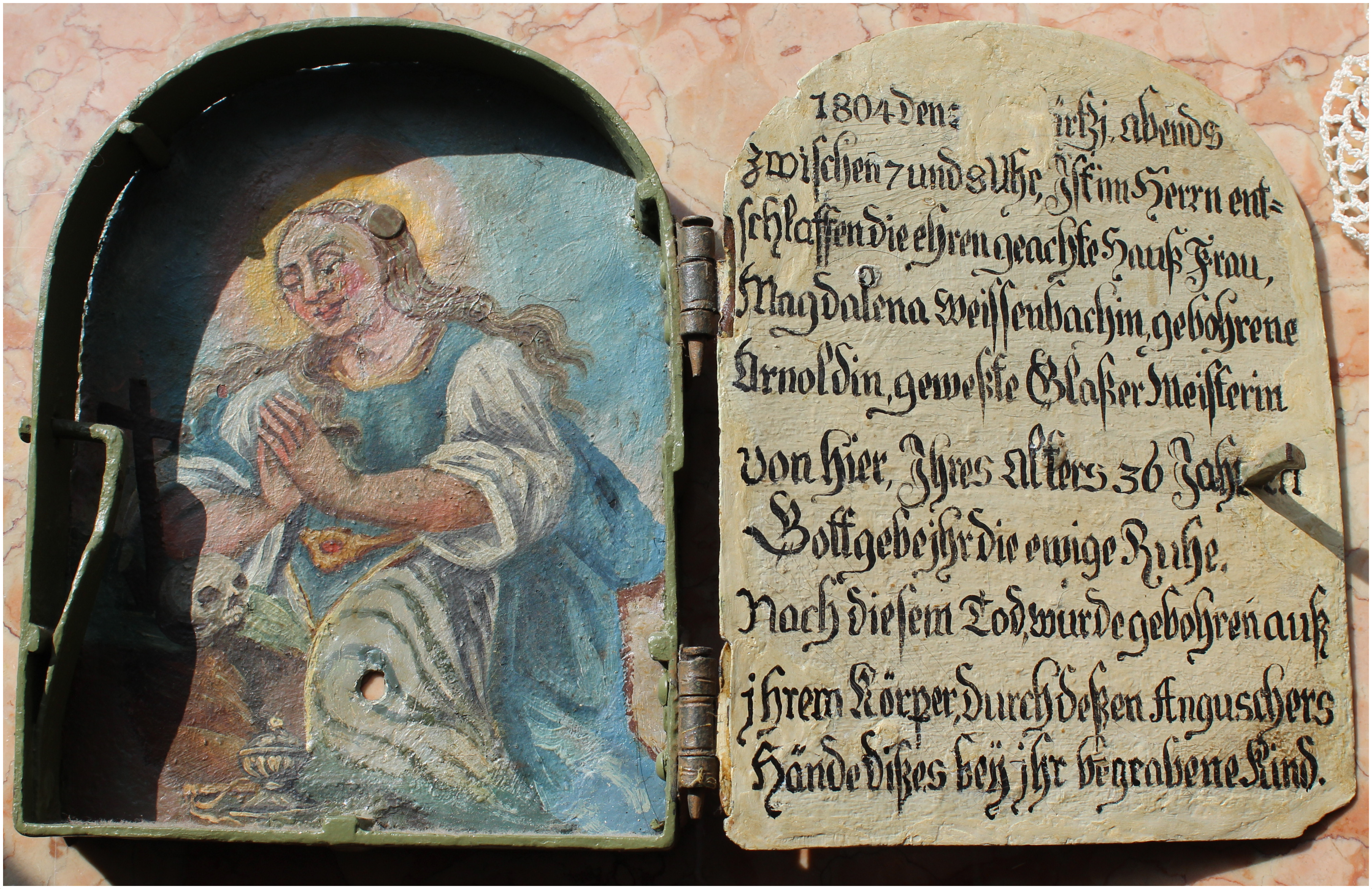 Willhelm Haslinger steht am Botenweg. In dem Dachboten seines Hauses am Botenweg fand sich ein bemaltes Blechschild. Alfons Natterer hat es restauriert. Text der Inschrift: 1804 ...... abends zwischen 7 und 8 Uhr ist im Herrn entschlafen die ehrengeachtete Hausfrau, Magdalena Weißenbachin, geborene Arnoldin, geweste Glasermeisterin von hier, ihres Alters 36 Jahre. Gott gebe ihr die ewige Ruhe. Nach diesem Tod wurde geboren aus ihrem Körper, durch dessen Anguschers Hände dieses bei ihr begrabene Kind.