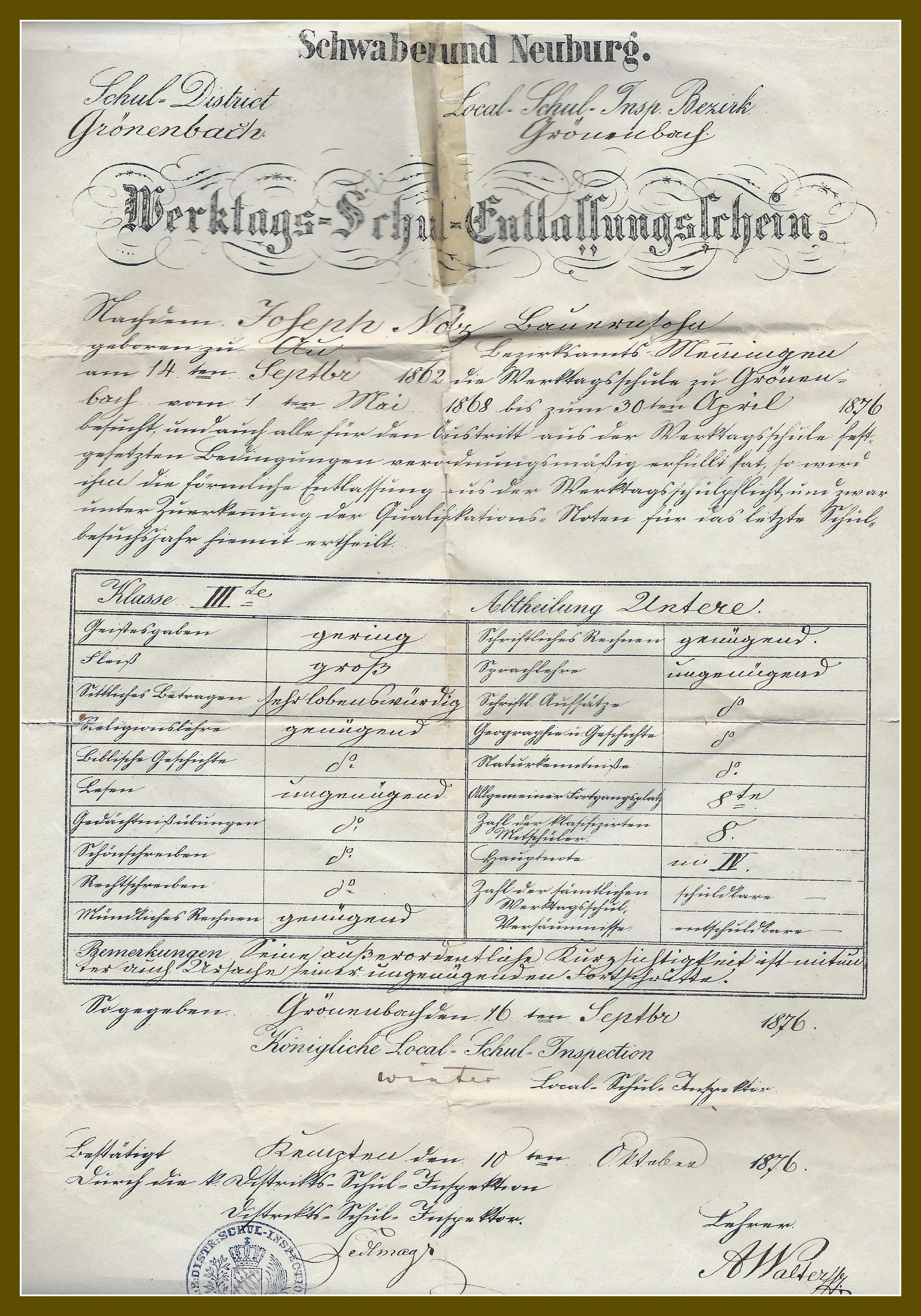 Beim Ausräumen eines alten Schrankes in einem Altusrieder Bauernhauses wurde ein Zeugnis aus dem Jahre 1876 gefunden. Eine Beurteilung erfolgte nach folgenden vierzehn Kategorien.