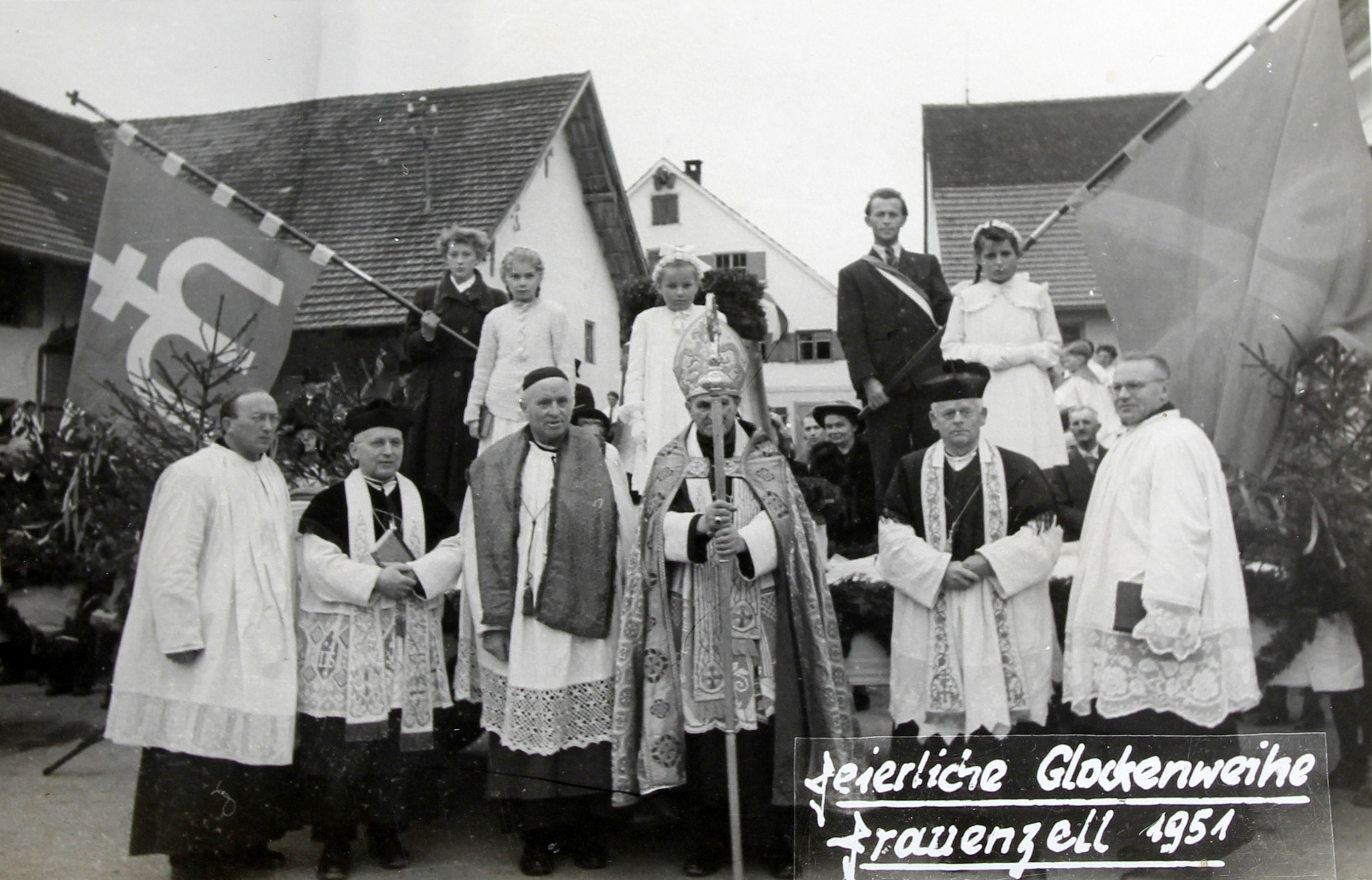 Feierliche Glockenweihe in Frauenzell an 1951. In der Kutsche sitzen die Gemeinderäte Flechtzig, Kienzelmann, Schönmetzler und Bürgermeister Völk. Auf dem mittleren Bild Abt Josef Maria Einsiedler und zweiter von links Ludwig Dorn Pfarrer und Heimatforscher.