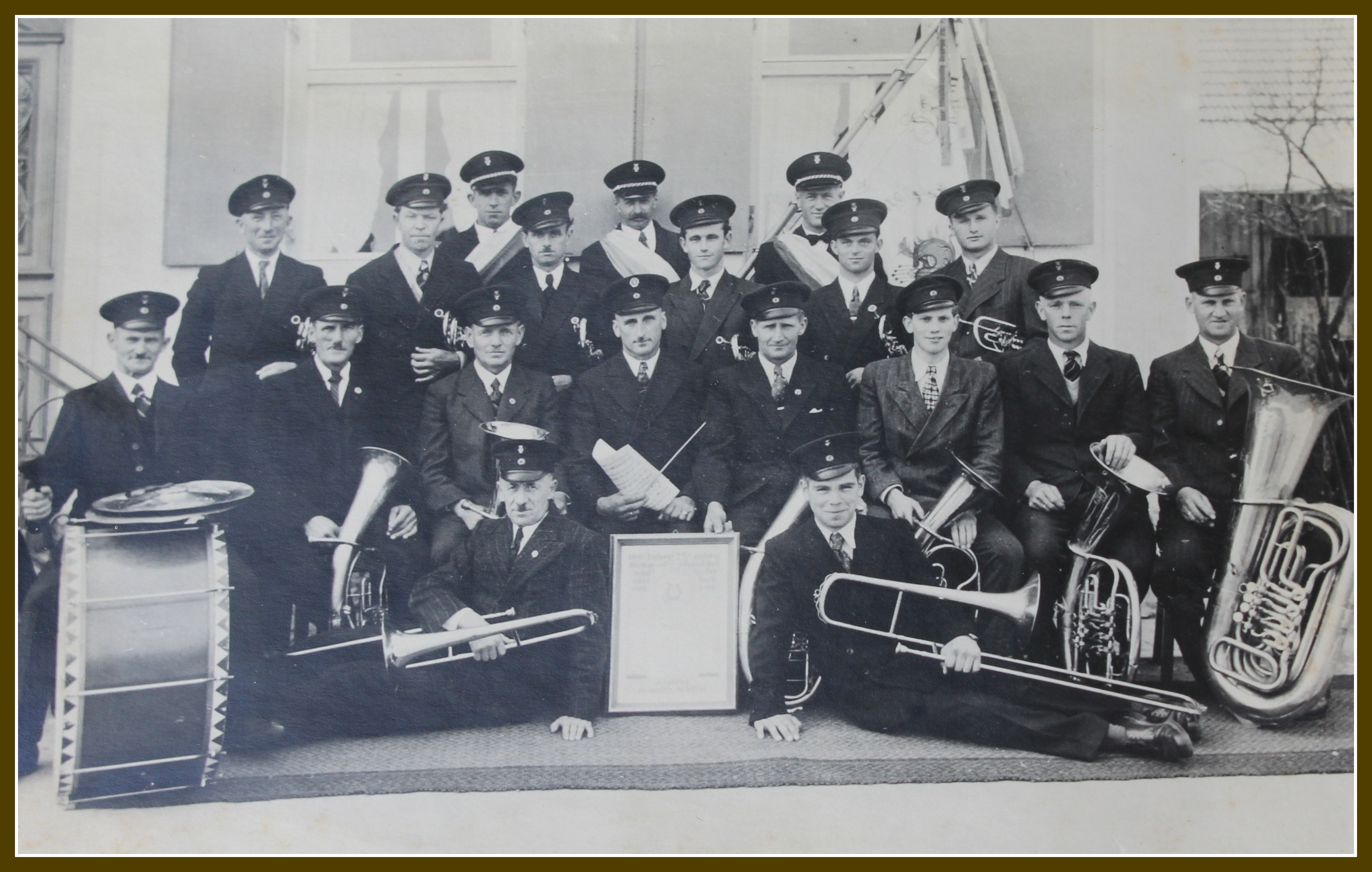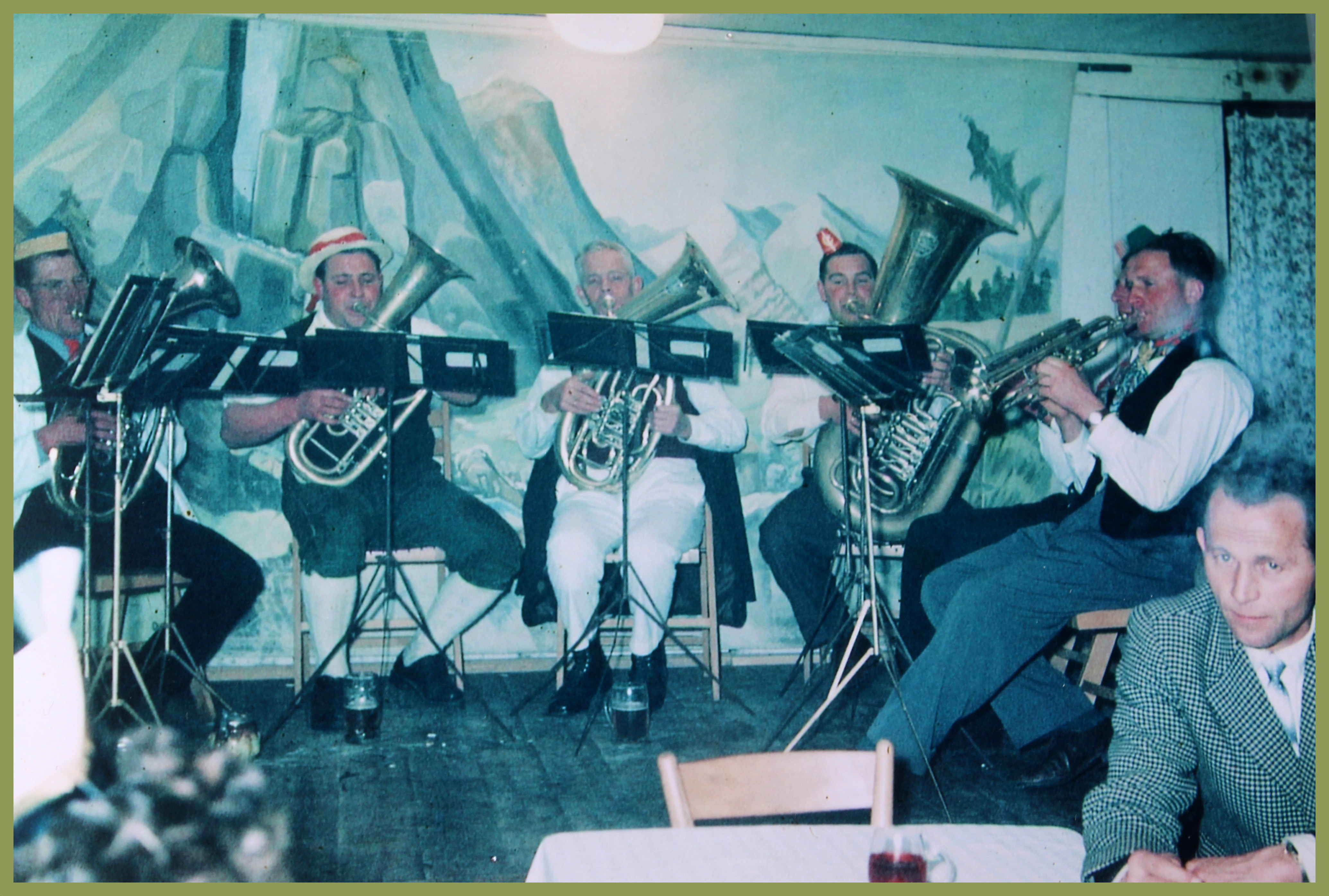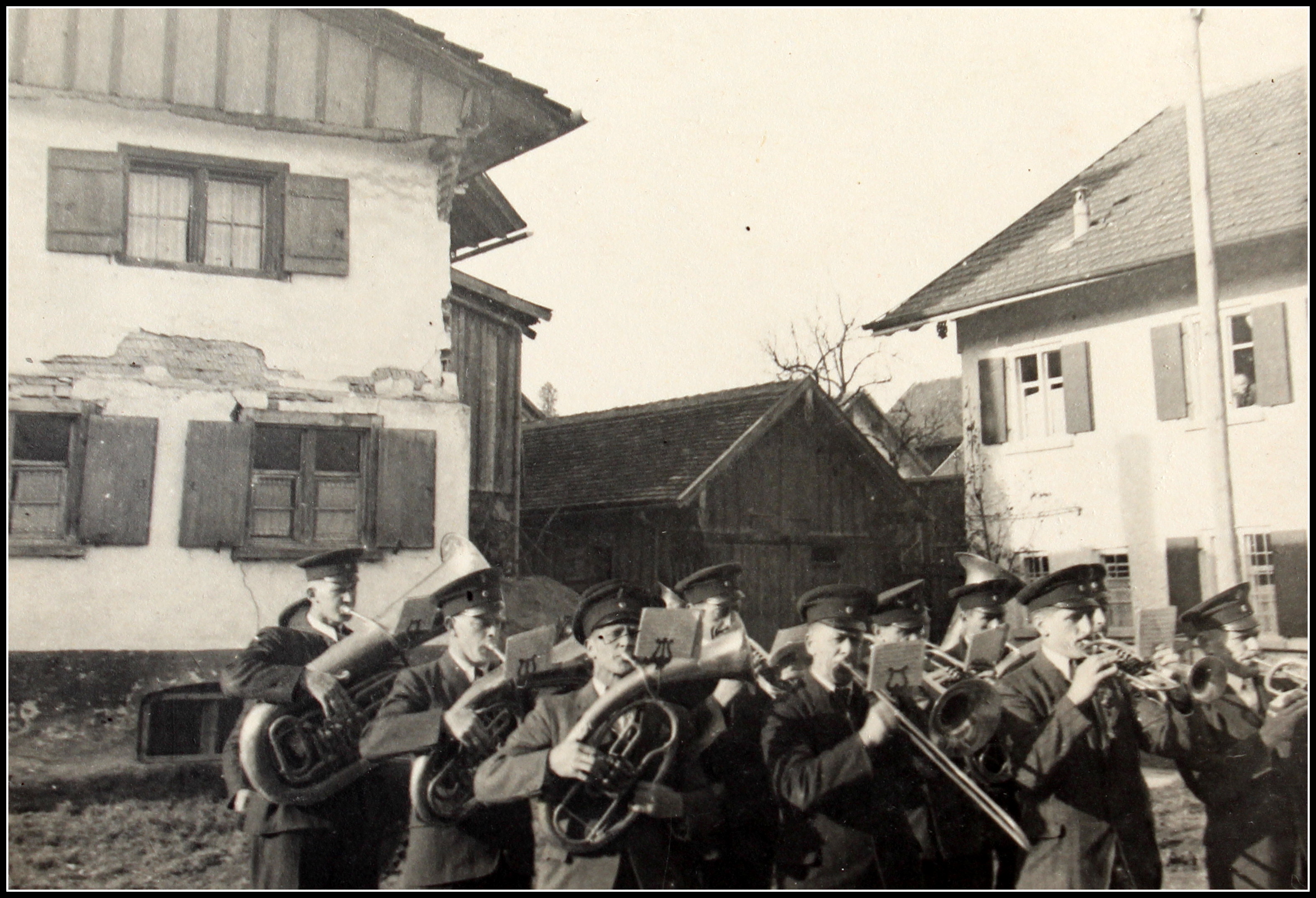 Zwei Bilder von der Musikkapelle Frauenzell aus dem Jahre 1951. Die Musikanten tragen Zivilkleidung mit einer Schildkappe. Das neue Gewand in der erneuerten Tracht wird erst später eingeführt