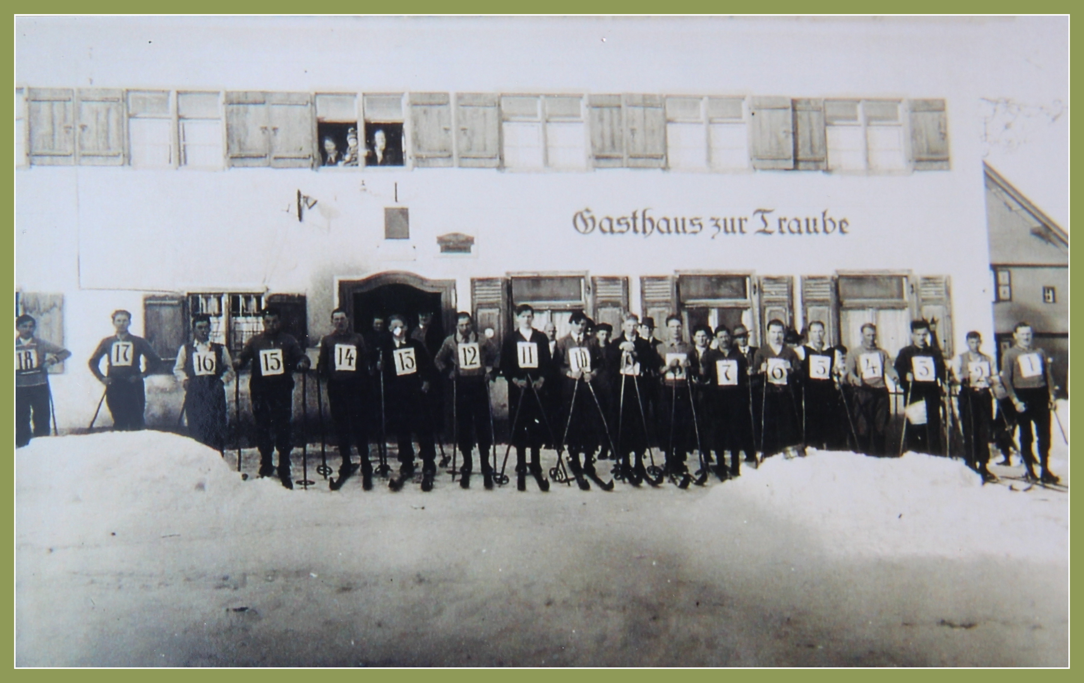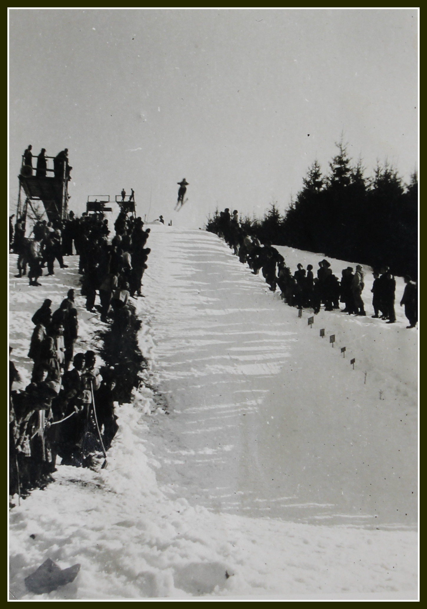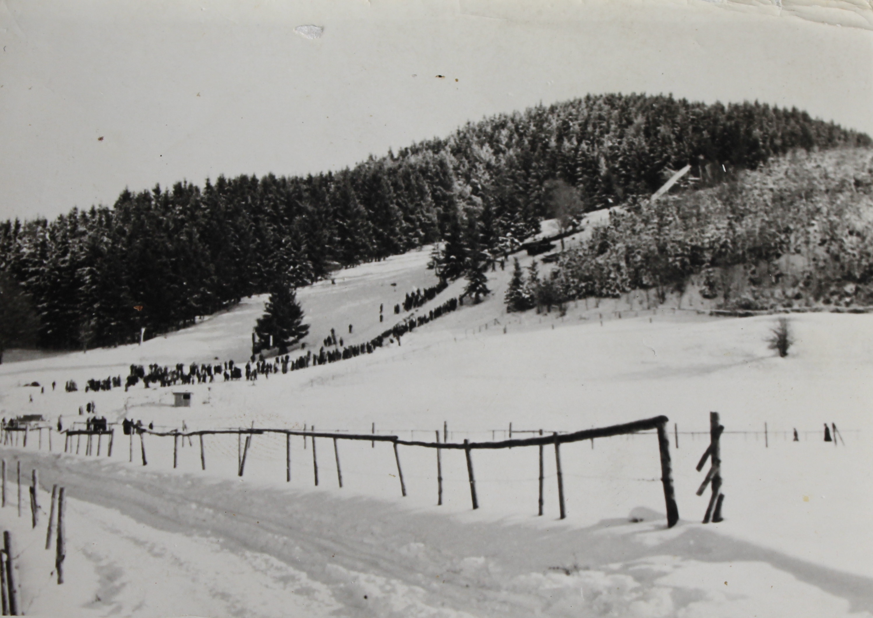 Grenzlandschanze am 30. Dezember 1950 in Winterstetten.Die Landesgrenze geht quer durch das Gelände. Die Springer starteten in Bayern und landeten in Württemberg.