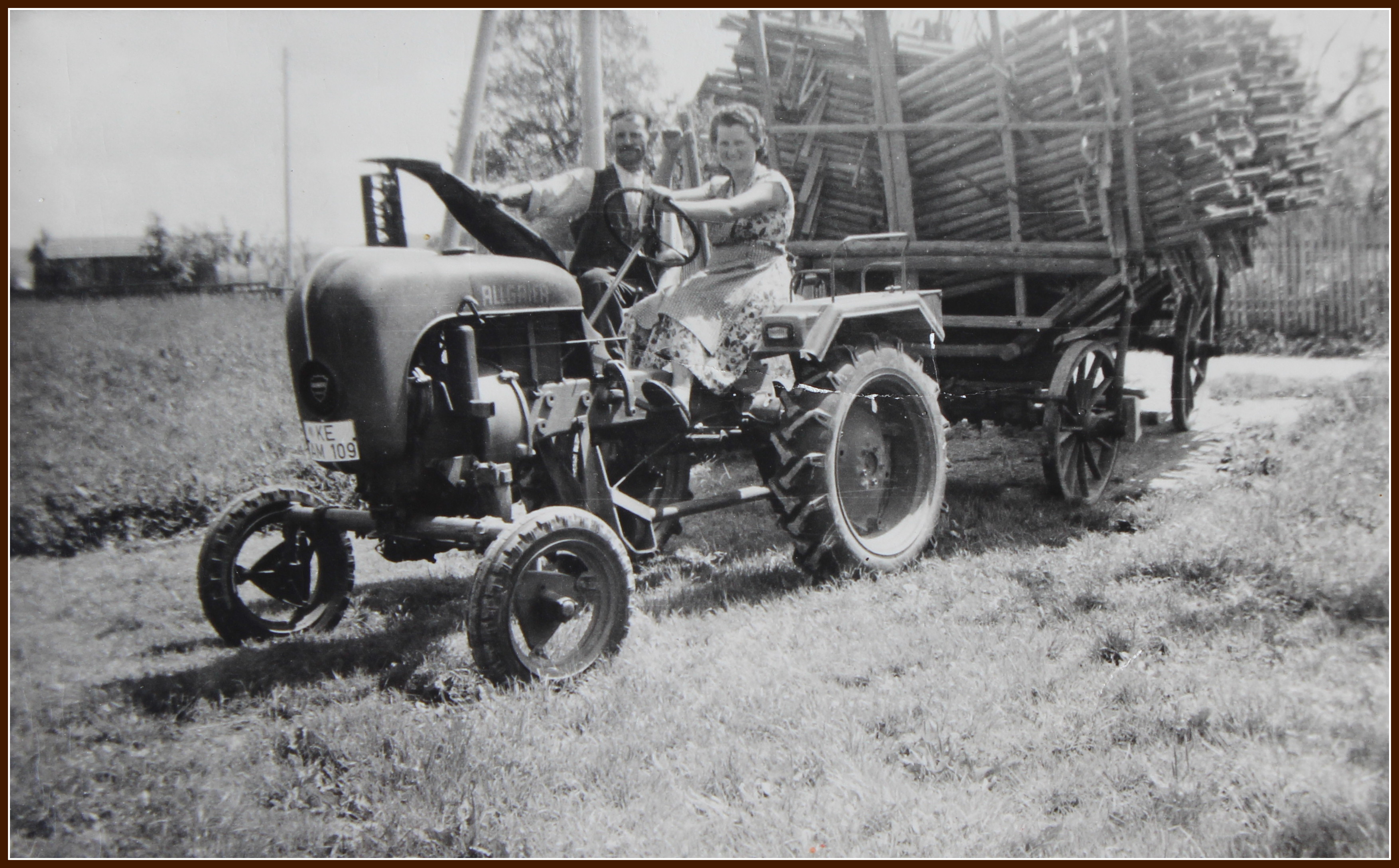 1957 Viele Arbeitsschritte waren früher notwendig, bis ein Büschel Heu in das Maul der Kuh gelangte. Der Bulldog,ein Allgaier, zieht den Leiterwagen, der mit Heinzen beladen ist. Der Traktor hat noch das Kemptener Kennzeichen KE . Auf dem Bulldog sitzen Hanni Hegele und ihr Vater.
