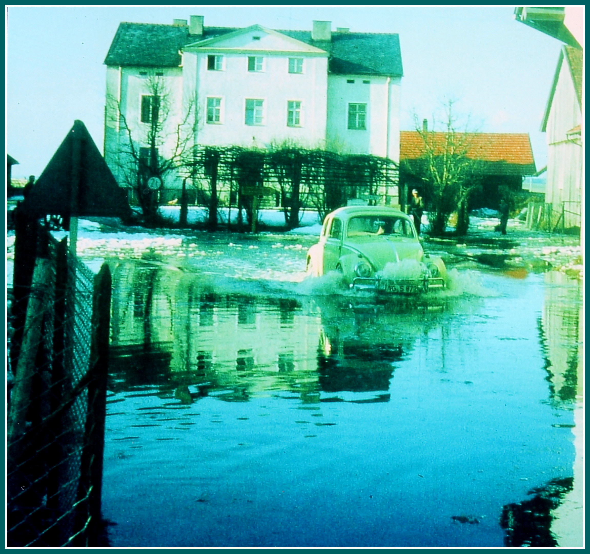 1957 Ein VW Käfer fährt durch das Hochwasser, im Hintergrund das Armenhaus.