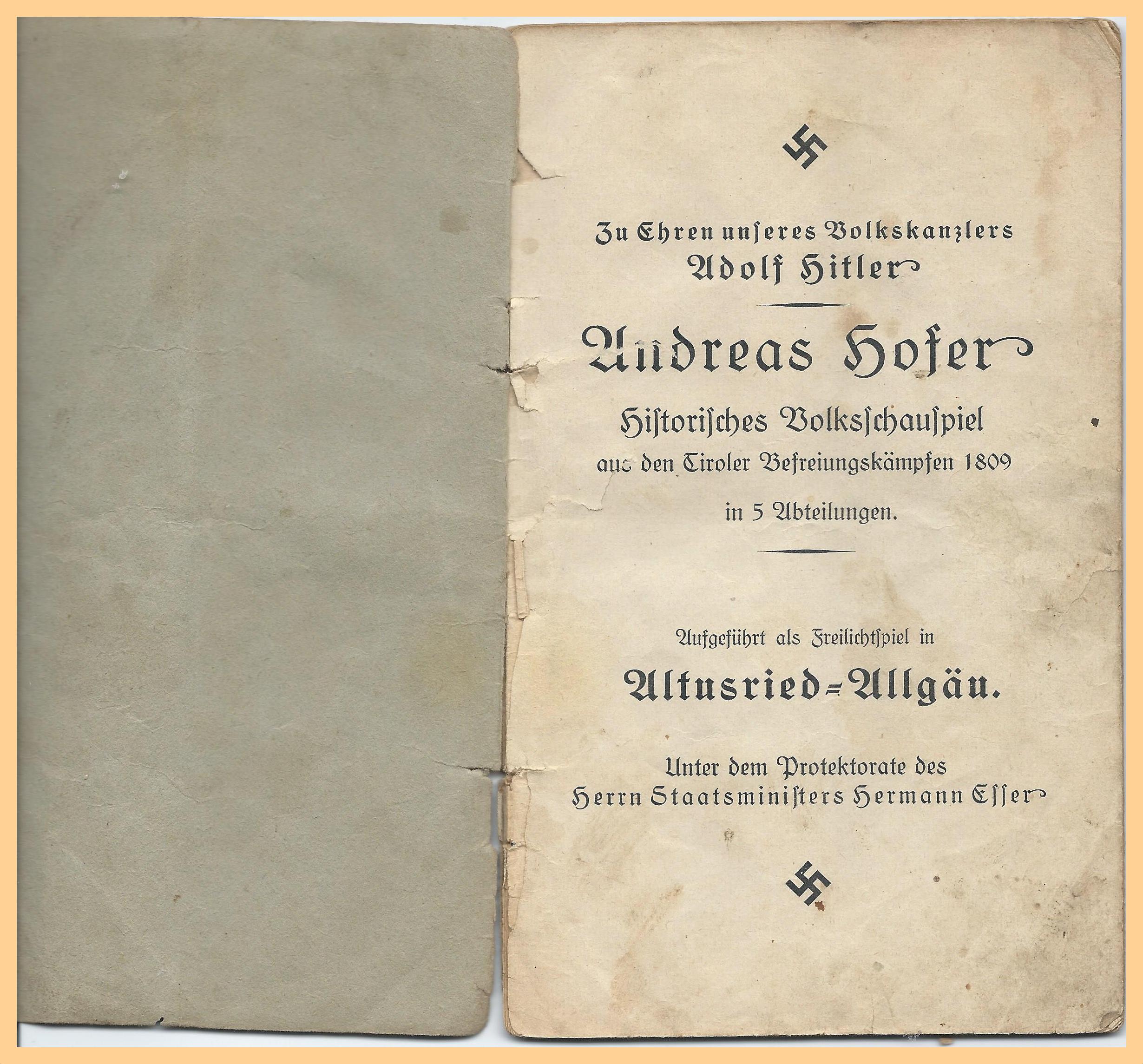 Am 30. Januar fand die Machtergreifung der NSDAP statt. Im Laufe des Jahres wurden alle Bereiche in der Politik und der Wirtschaft gleichgeschaltet. Auch die Freilichtspiele konnten sich dem nicht entziehen und wurden Teil der Propaganda. Ab dem 27. August 1933 wurde Andreas Hofer unter dem Protektorat von Staatsminister Esser gespielt. Das Spiel fand in der Höll statt. Auf dem Plakat wird vermerkt, dass das Schlachtgelände 1 qkm misst. Der beste Platz kostete 3,00 RM, entferntere 50 Pf .