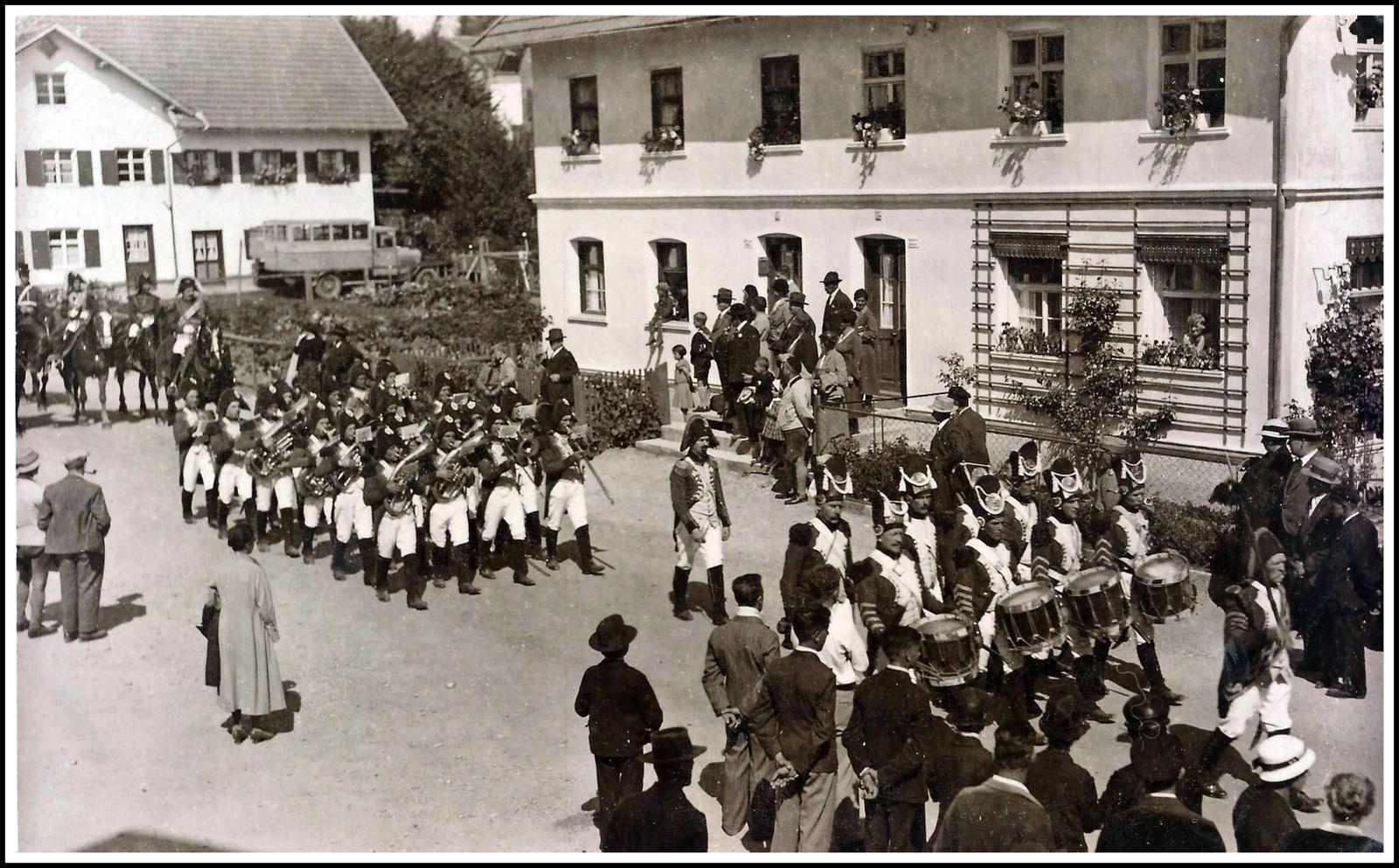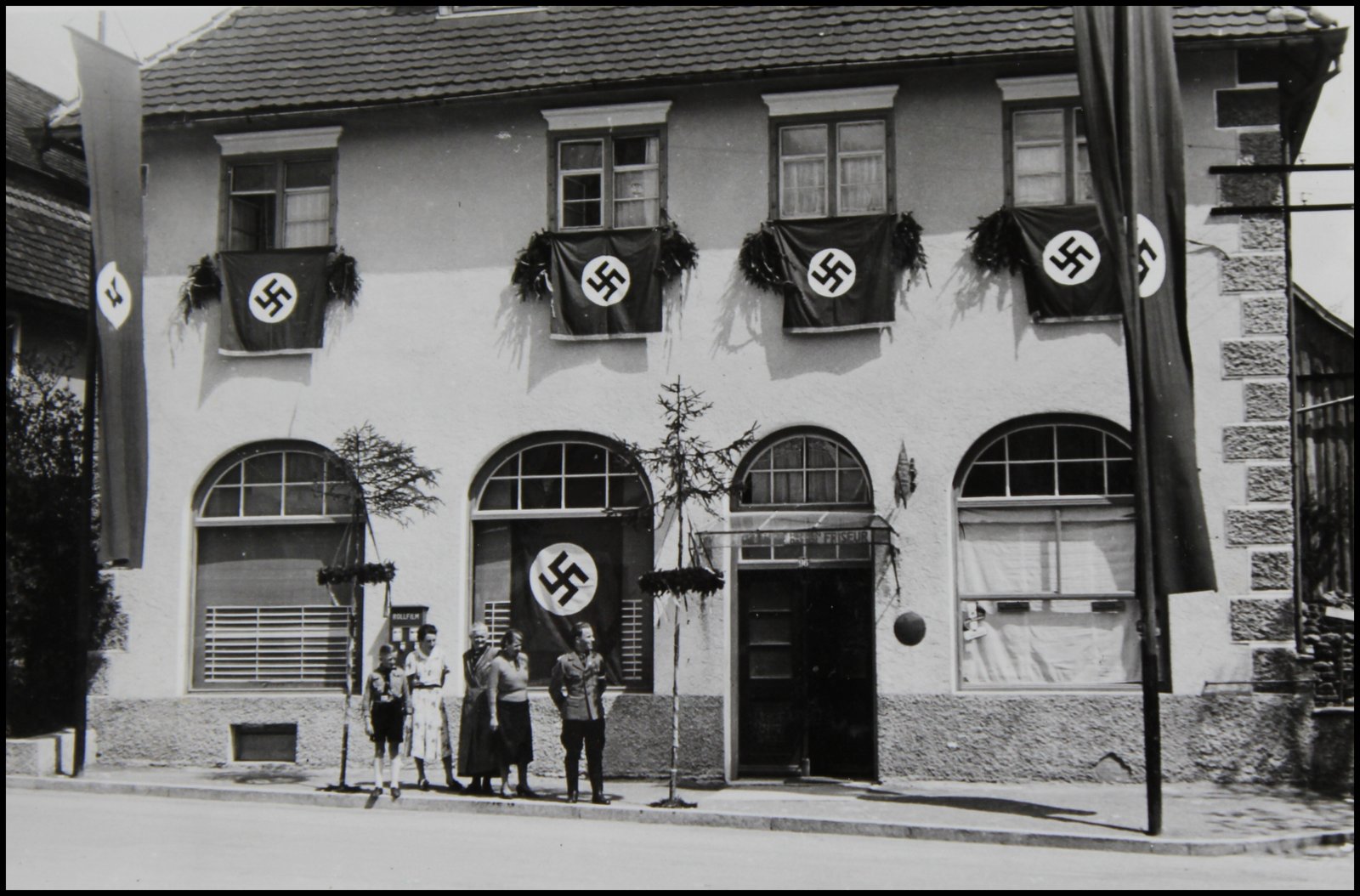 Der deutsche Gruß war ein sichtbares aber oft doch erzwungenes Bekenntnis zur Politik der Nationalsozialistischen Deutschen Arbeiter Partei. Aufnahme in den Höllwiesen.