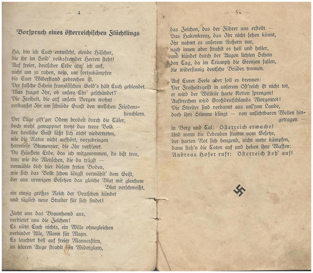 Dem Andreas Hofer Spiel wurde der Vortrag eines österreichischen "Flüchtlings" vorangestellt. Mit großem Pathos wird darin die Politik der Partei vorgetragen, gefüllt mit den damals gängigen Schlagwörtern. Das Thema Österreich und Andreas Hofer passt gut zu den Absichten der NSDAP, die Landkarte Europas zu verändern. Das erste Ziel soll der Anschluss Österreichs an Deutschland sein.
