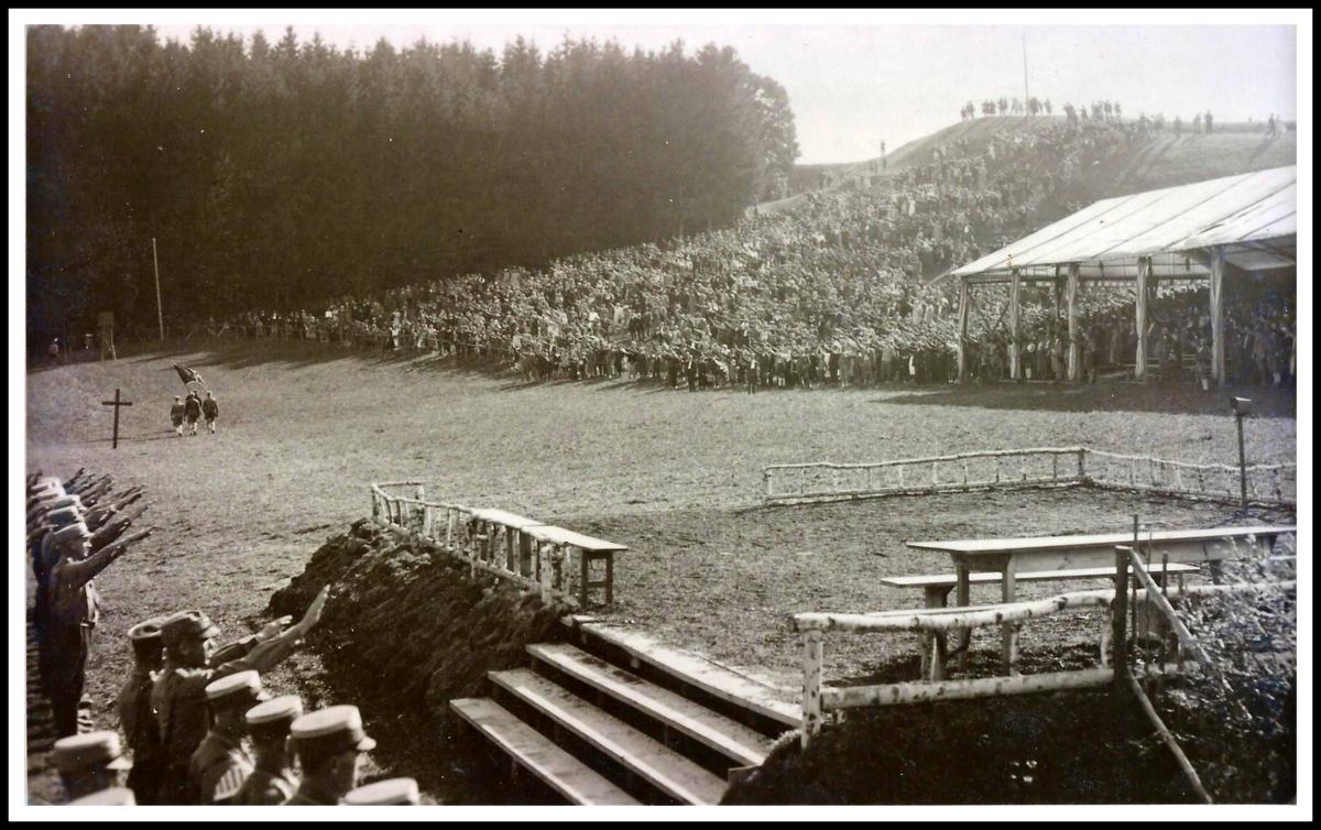 Die Spiele fanden bei Tageslicht statt, hier die Franzosengruppe beim Aufzug des Hoferspiels 1933.