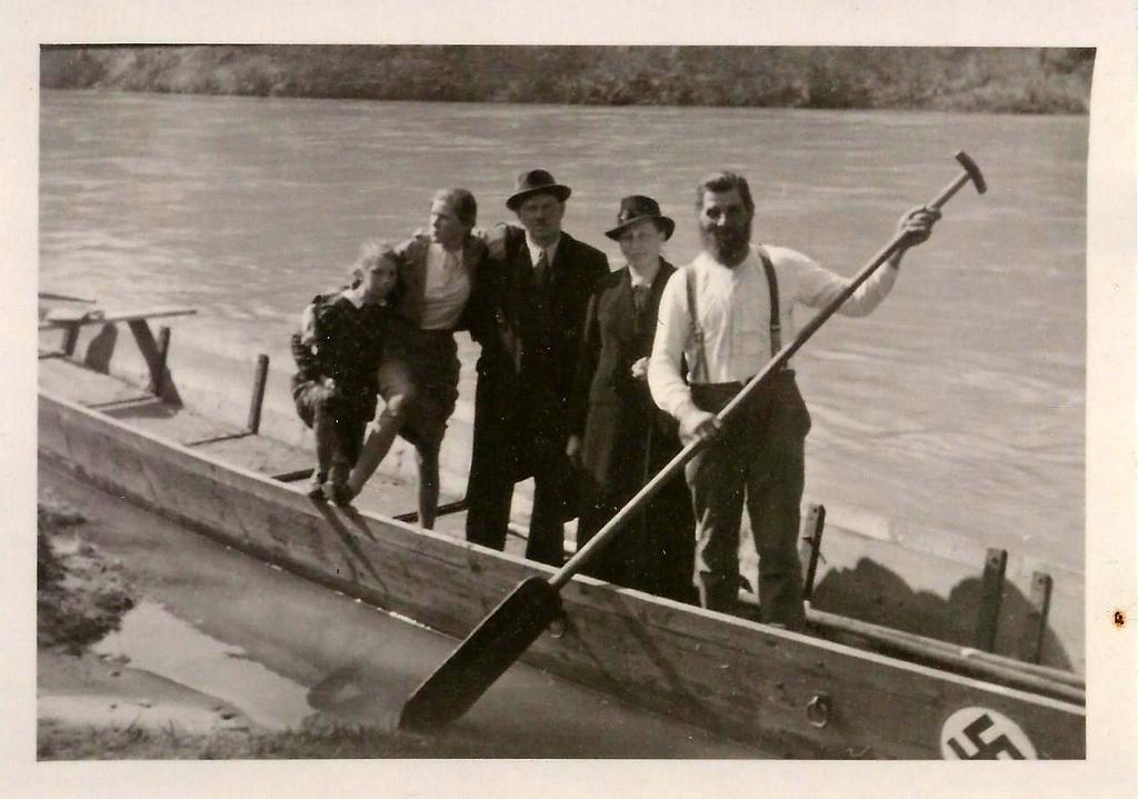 Viele Dinge des täglichen Lebens wurden mit dem Hitlerzeichen markiert, so auch die Fähre. Eine Ausflugsgesellschaft setzt über. Auch bei Festen und Ereignissen hatte man mit Anstecknadeln seine Gesinnung zu offenbaren.