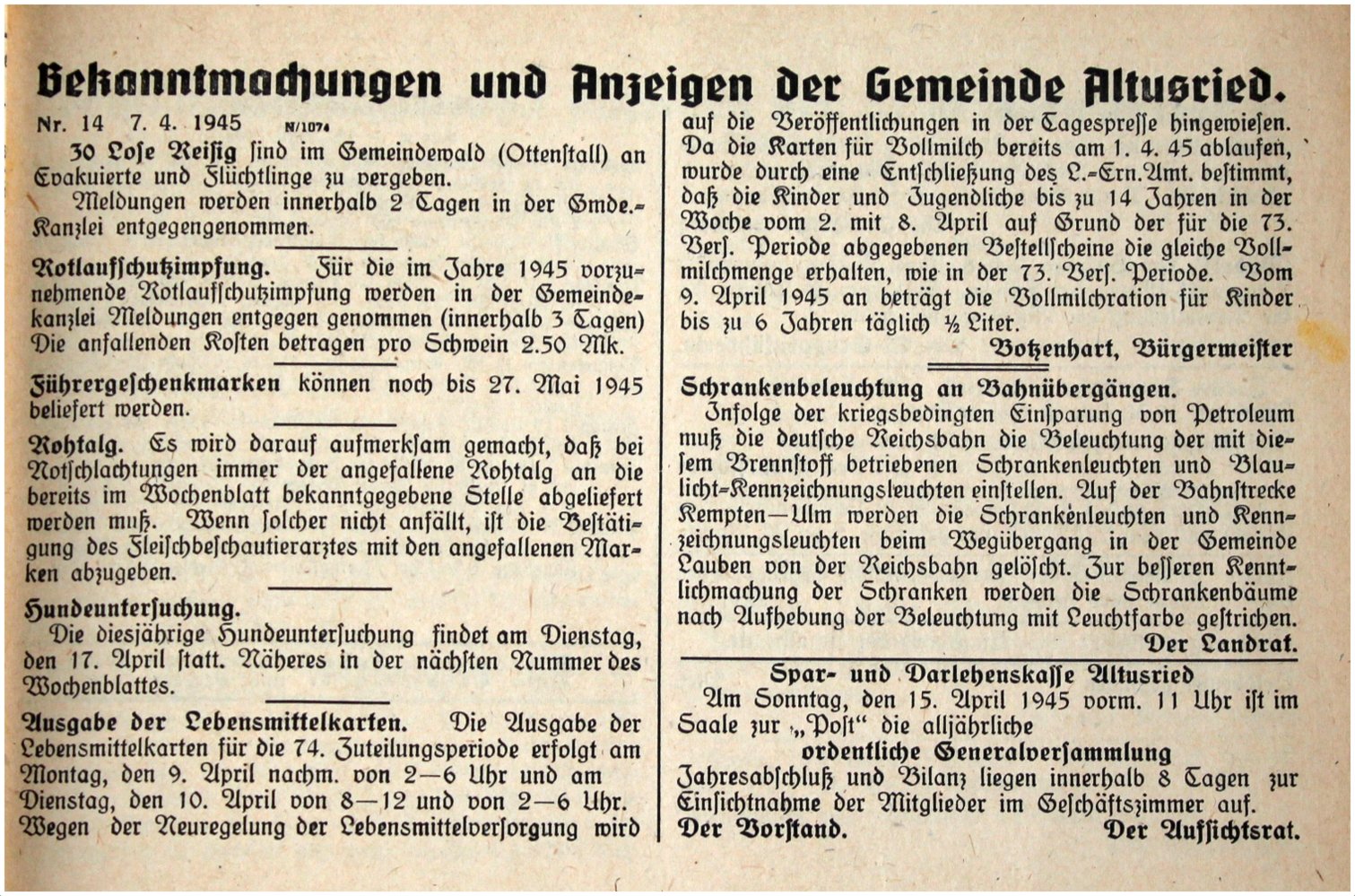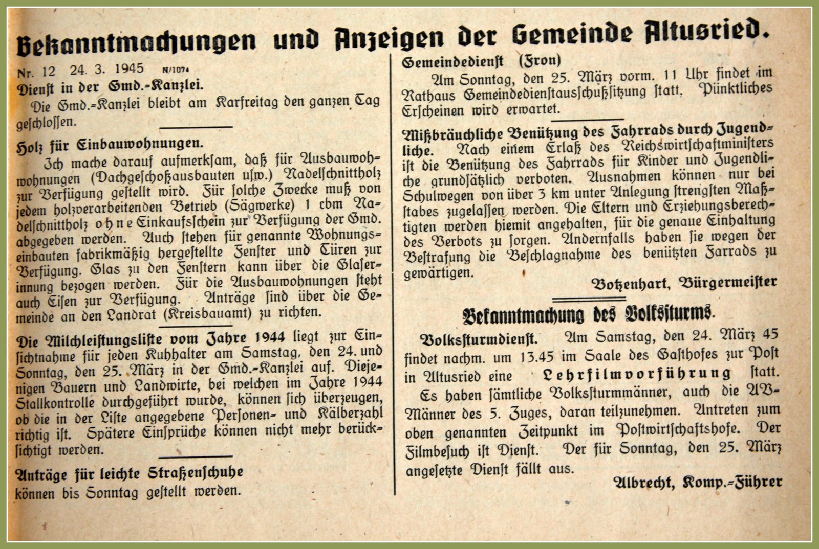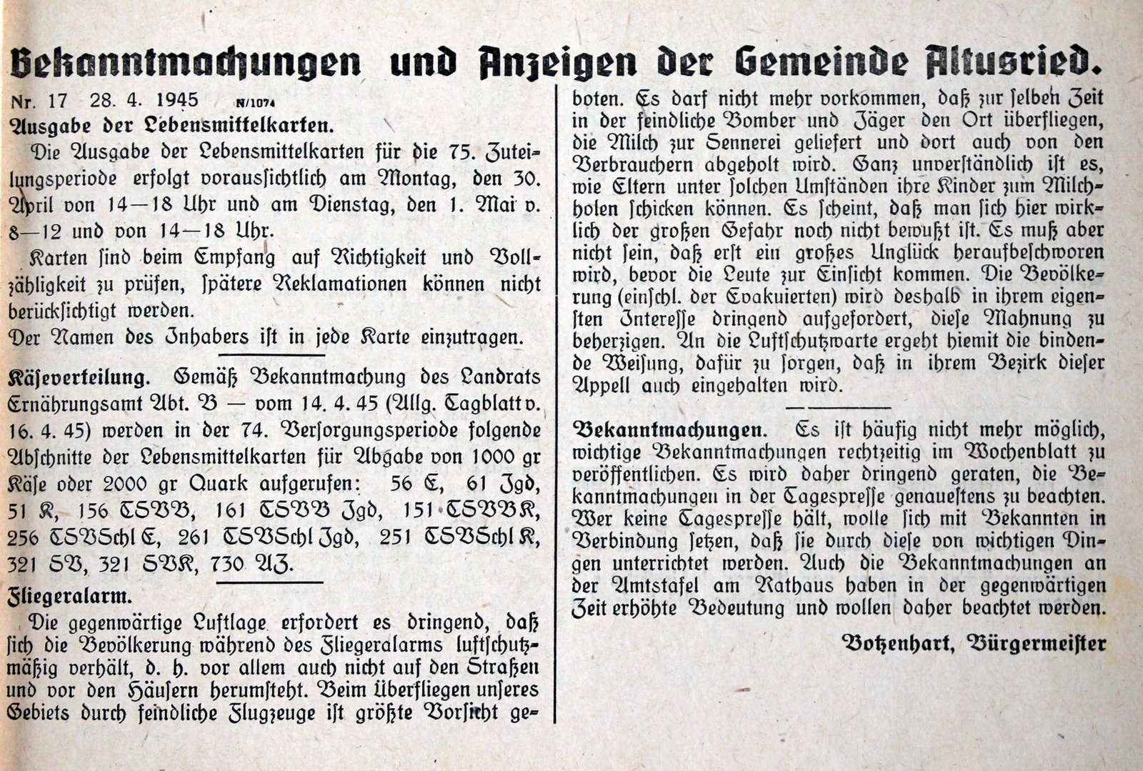 Auch in der Heimat gab es Tote, vor allem zum Ende des Krieges. In Ausübung ihres Berufes verstarb am 23.02.1945 eine Rot-Kreuz Helferin, beim Postfahren wurde in Binzen ein Postfahrer durch feindliche Flieger am 29. 04.1945 tödlich verwundet, zwei Bürger verzweifelten bei Kriegsende am Leben, ein zwölfjähriger Junge verunglückte am 28.04.1945 nach Geschoßberührung und ein Altusrieder verstarb am 20.o4.1945 bei einem Fliegerangriff in Kressborn.