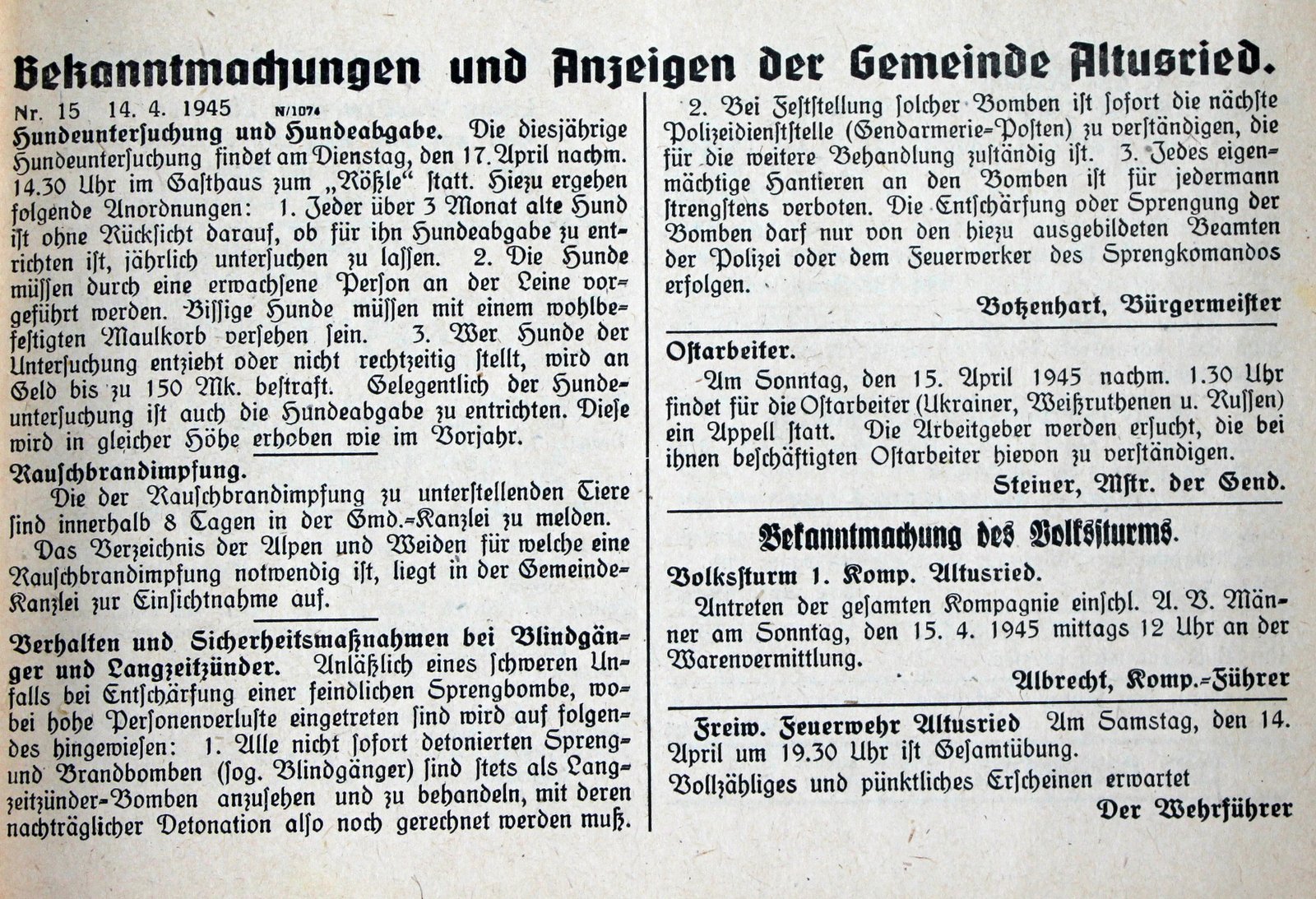 - Ostarbeiter ( Ukrainer,Weißruthenen und Russen ) haben sich am 15. April zum Apell einzufinden.