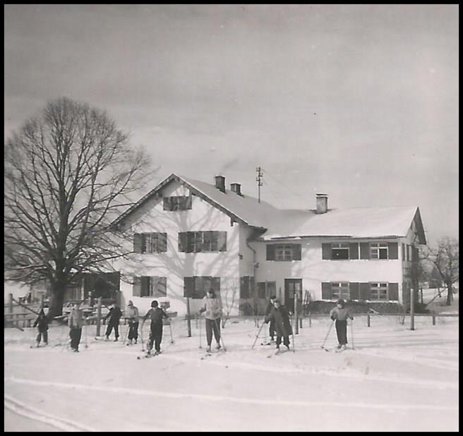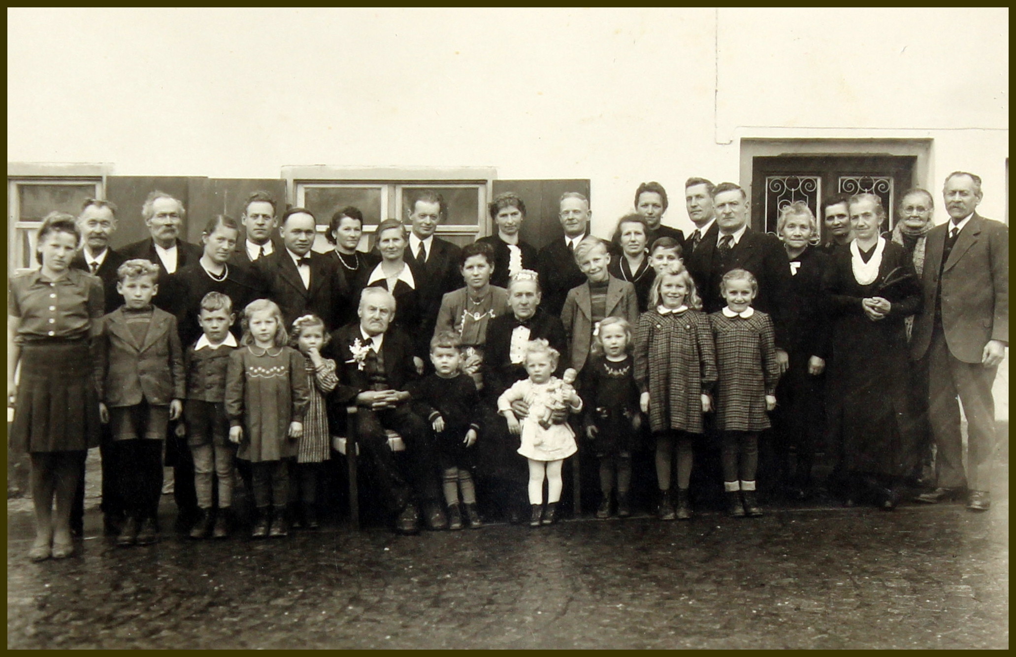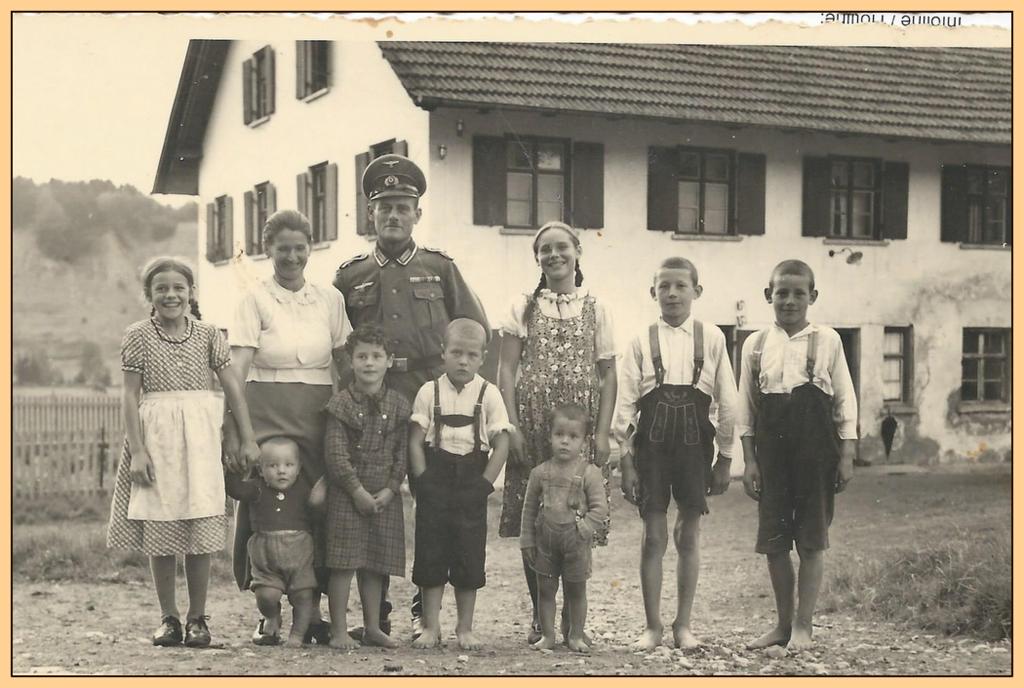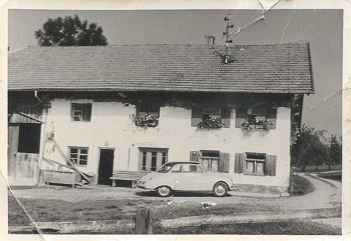 Der Hof in der Leutkircher Straße hat seit 1956 sein Aussehen nur wenig verändert. Im Hof parkt ein Käfer mit ovalem Fenster. Das Farbbild zeigt den Hof im Jahre 2014. Den Grundriss des Hofes hat Leonhard Guggenmos 1959 gezeichnet. Goldene Hochzeit: Im Hof hat sich die Großfamilie aufgestellt. Großeltern und Enkel. Die Guggenmos Sippe stammt aus dem Füssener Raum.Sie haben auch ein eigenes Wappen.