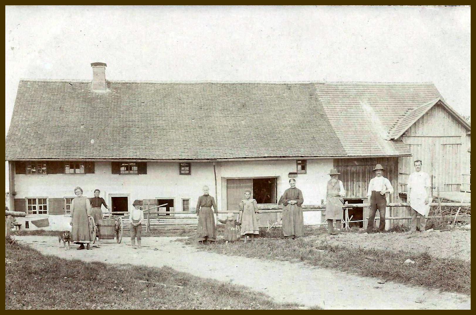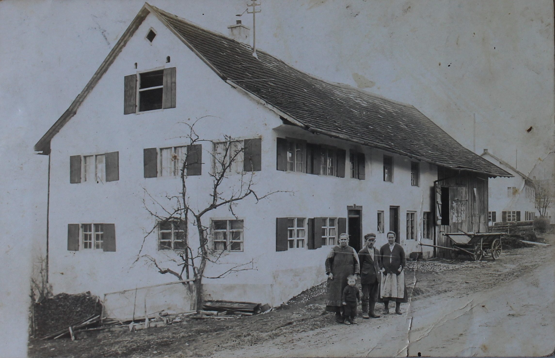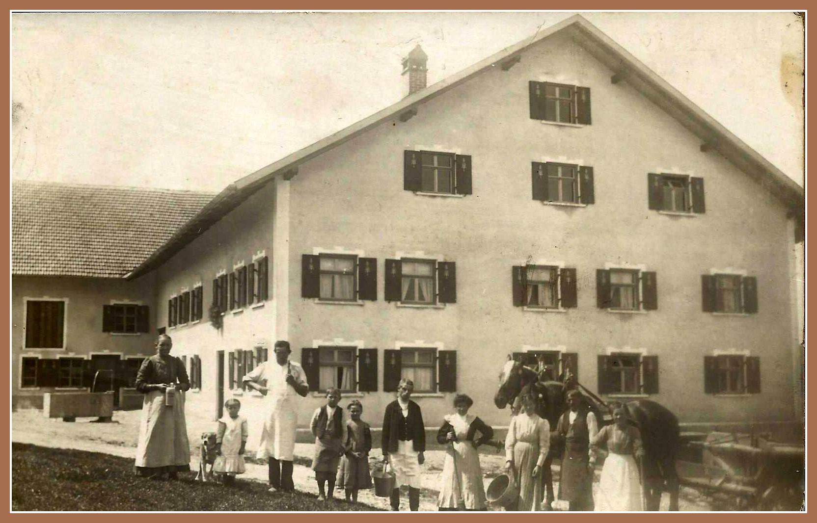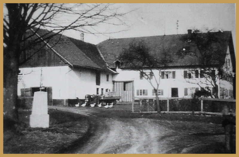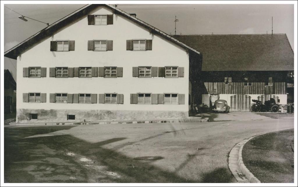 Vor dem Hof stehen die Männer mit Joppen und weißen Schürzen, die Frauen in langen Röcken. Die Fototechnik war noch nicht so weit entwickelt. Bei der Aufnahme musste man lange still stehen. Am besten gelang das der Bäuerin auf der rechten Seite, deshalb ist sie am deutlichsten abgebildet. Das Farbfoto zeigt den Hof im Jahre 2014. Er ist gerade mitten im Umbau. Die Giebelseite zeigte ursprünglich nach Osten, so wie bei allen alten Höfen. Sie wurde gedreht und weist nun nach Süden.Bild 3 zeigt die Illerstraße. Sie ist noch ungeteert und führt nach Norden. Ganz in der Ferne sieht man im Hintergrund den Hiemer Hof auf der Kuppel.