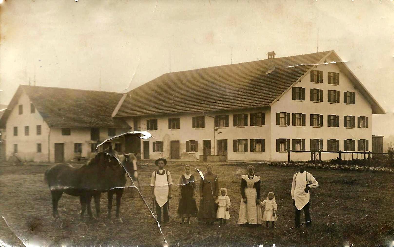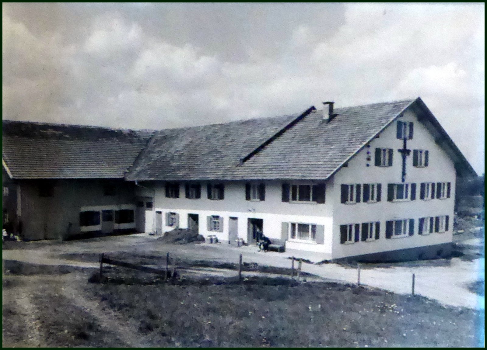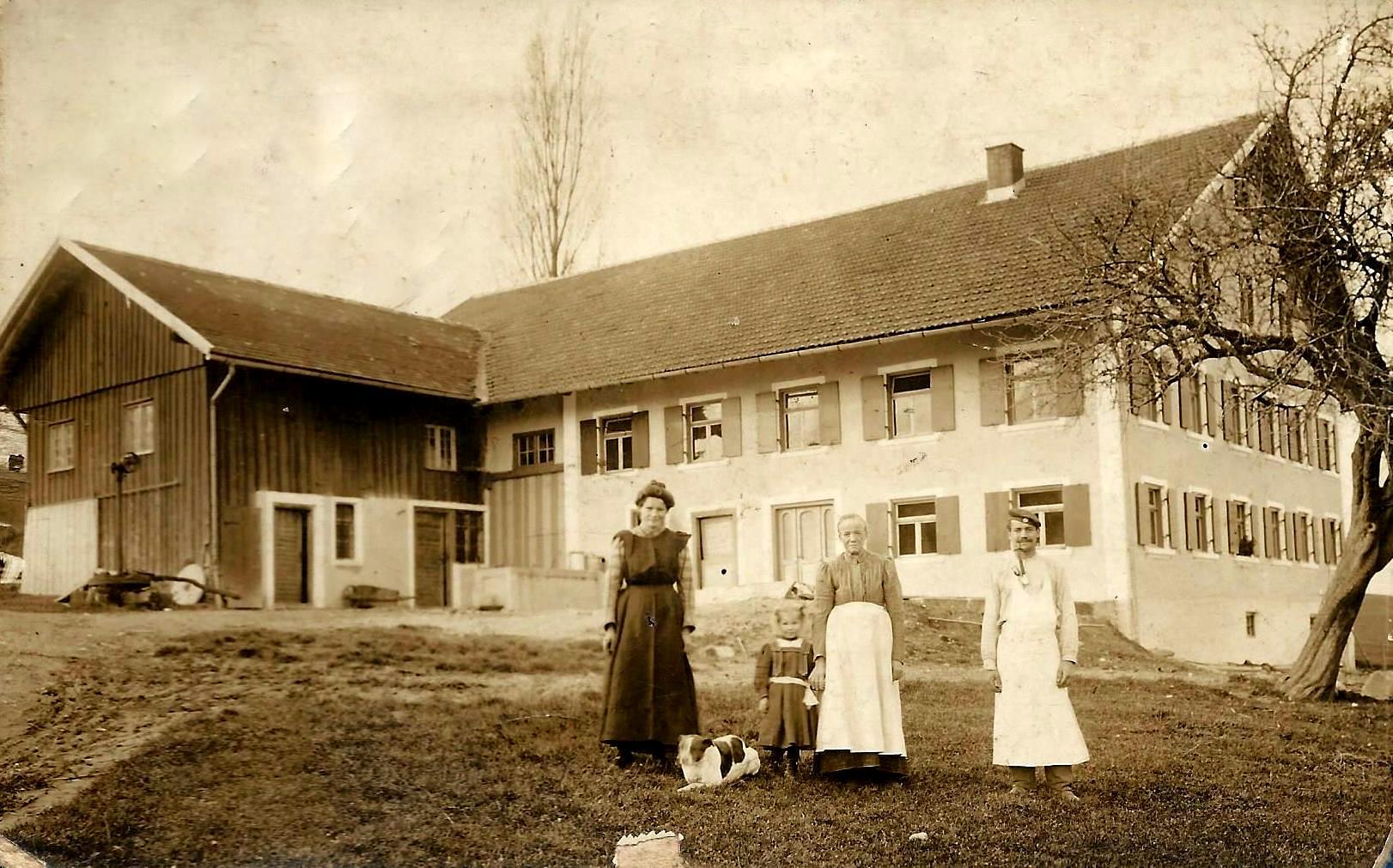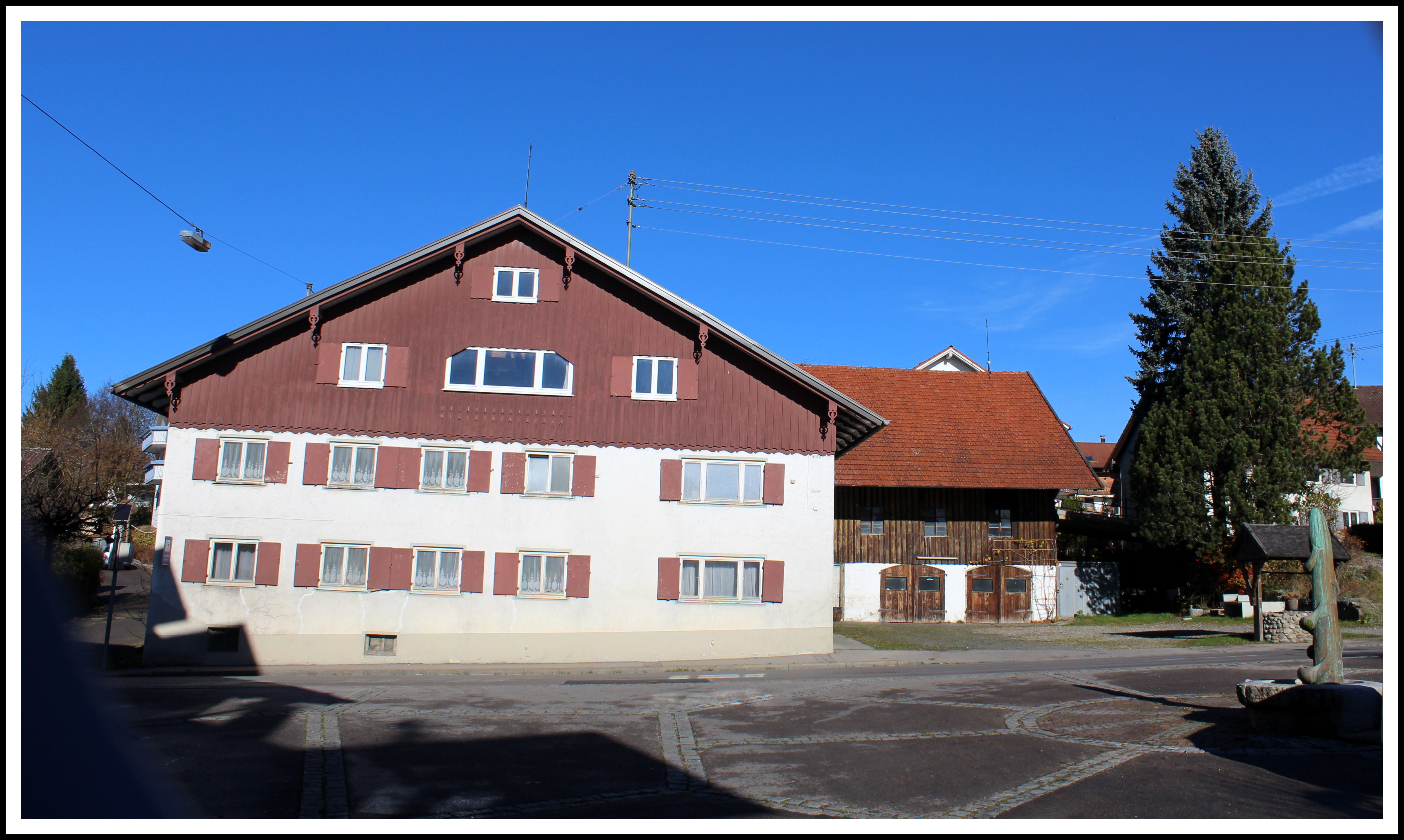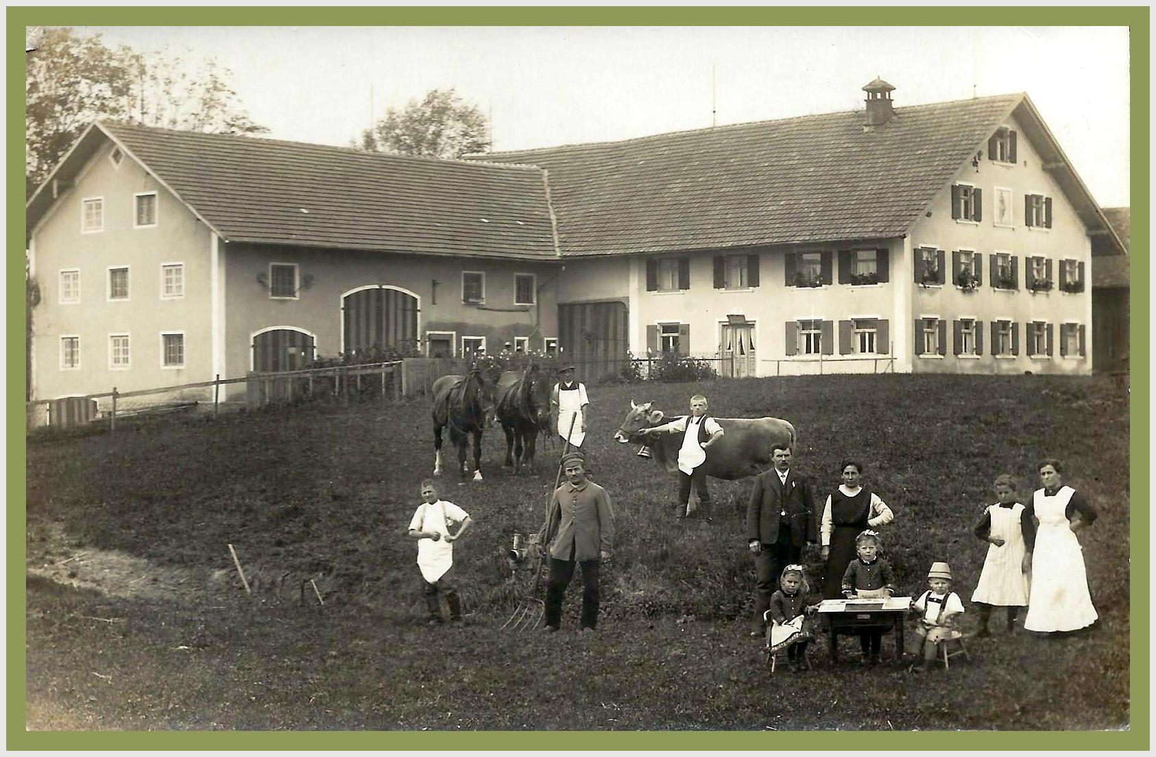 Vor dem Hof stehen die Männer mit Joppen und weißen Schürzen, die Frauen in langen Röcken. Die Fototechnik war noch nicht so weit entwickelt. Bei der Aufnahme musste man lange still stehen. Am besten gelang das der Bäuerin auf der rechten Seite, deshalb ist sie am deutlichsten abgebildet. Das Farbfoto zeigt den Hof im Jahre 2014. Er ist gerade mitten im Umbau. Die Giebelseite zeigte ursprünglich nach Osten, so wie bei allen alten Höfen. Sie wurde gedreht und weist nun nach Süden.Bild 3 zeigt die Illerstraße. Sie ist noch ungeteert und führt nach Norden. Ganz in der Ferne sieht man im Hintergrund den Hiemer Hof auf der Kuppel.
