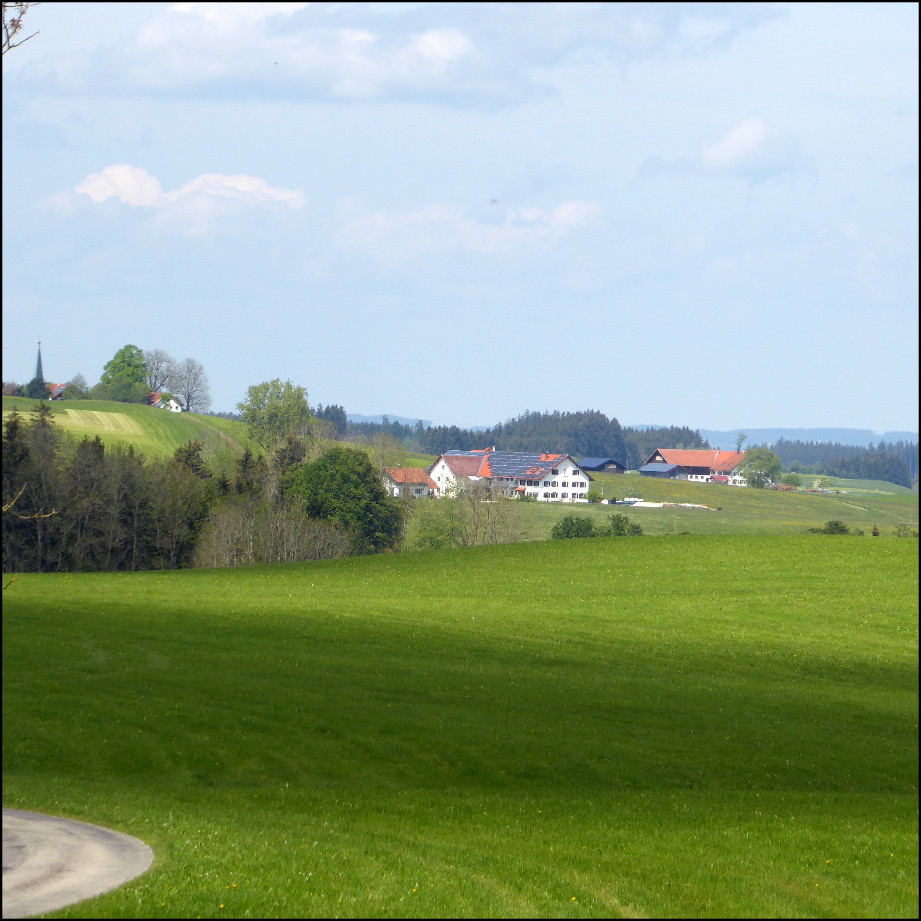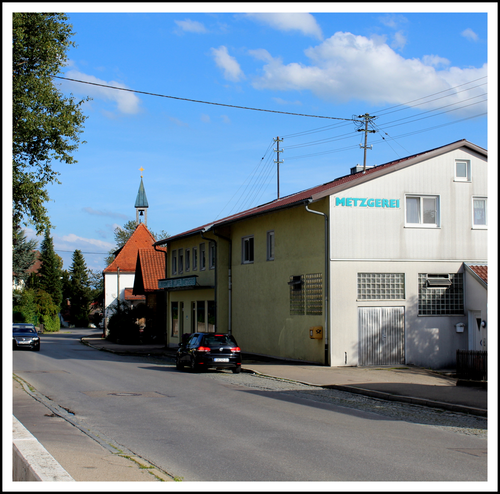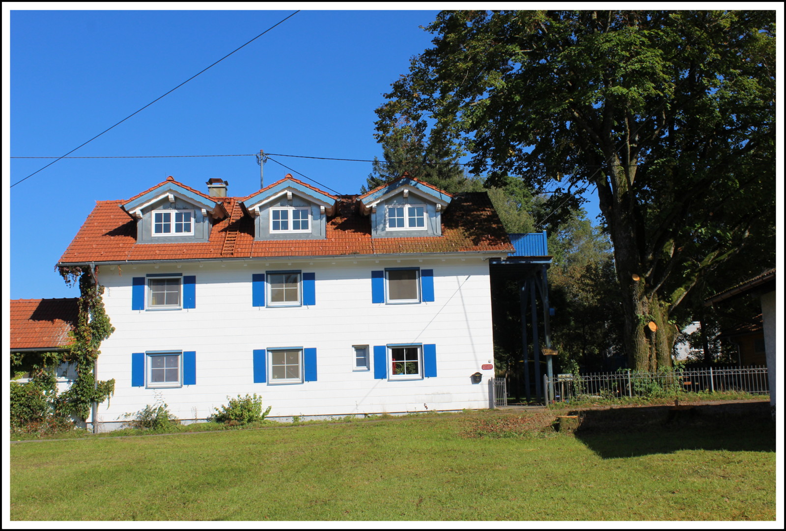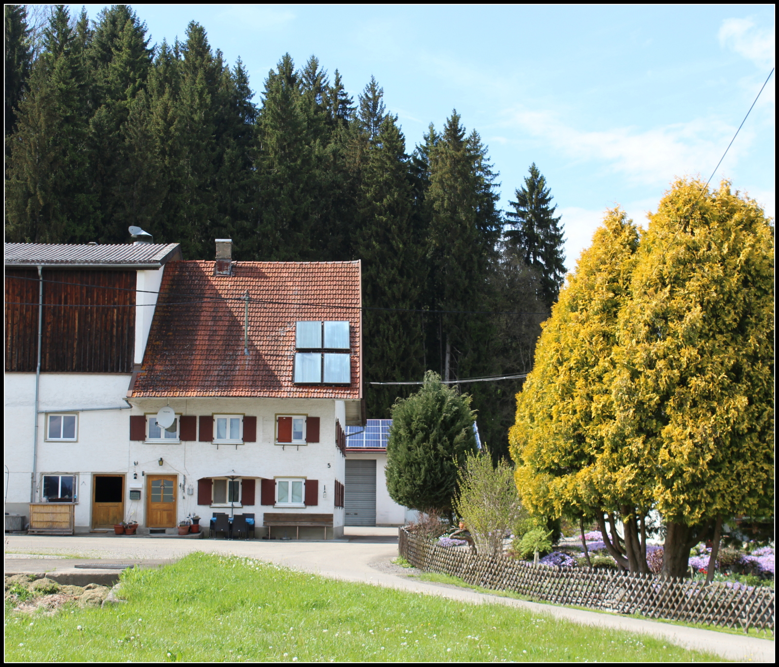 Vor dem Hof stehen die Männer mit Joppen und weißen Schürzen, die Frauen in langen Röcken. Die Fototechnik war noch nicht so weit entwickelt. Bei der Aufnahme musste man lange still stehen. Am besten gelang das der Bäuerin auf der rechten Seite, deshalb ist sie am deutlichsten abgebildet. Das Farbfoto zeigt den Hof im Jahre 2014. Er ist gerade mitten im Umbau. Die Giebelseite zeigte ursprünglich nach Osten, so wie bei allen alten Höfen. Sie wurde gedreht und weist nun nach Süden.Bild 3 zeigt die Illerstraße. Sie ist noch ungeteert und führt nach Norden. Ganz in der Ferne sieht man im Hintergrund den Hiemer Hof auf der Kuppel.