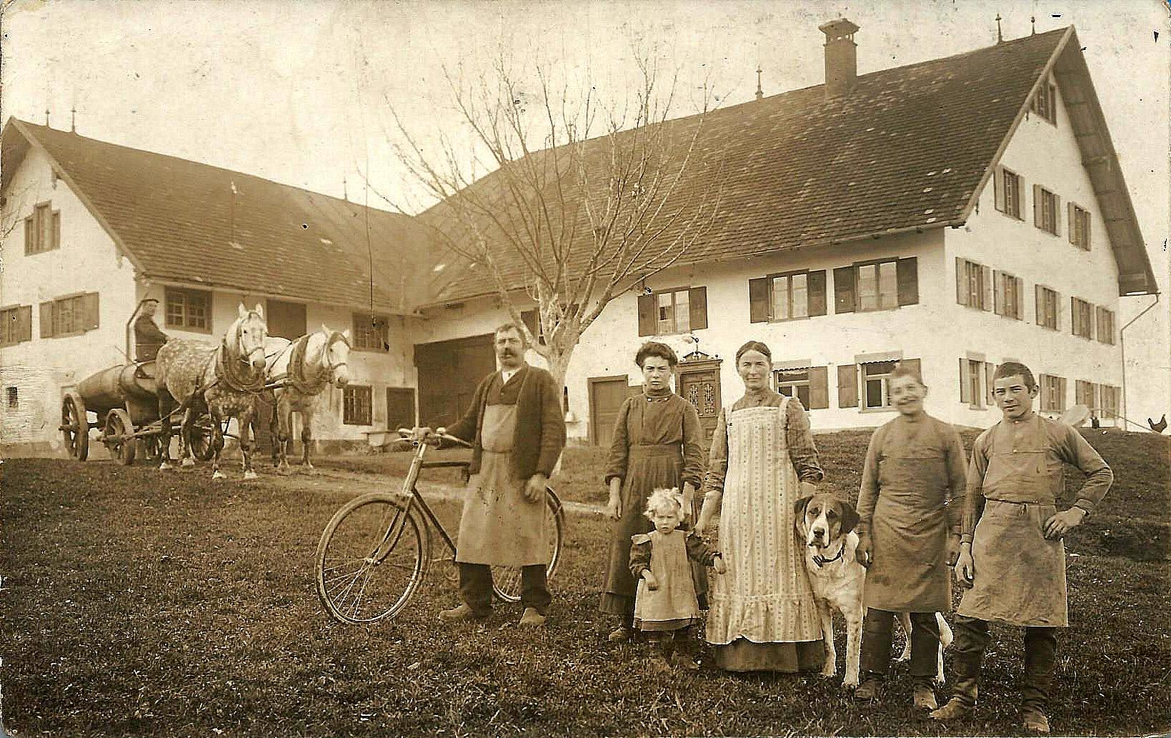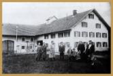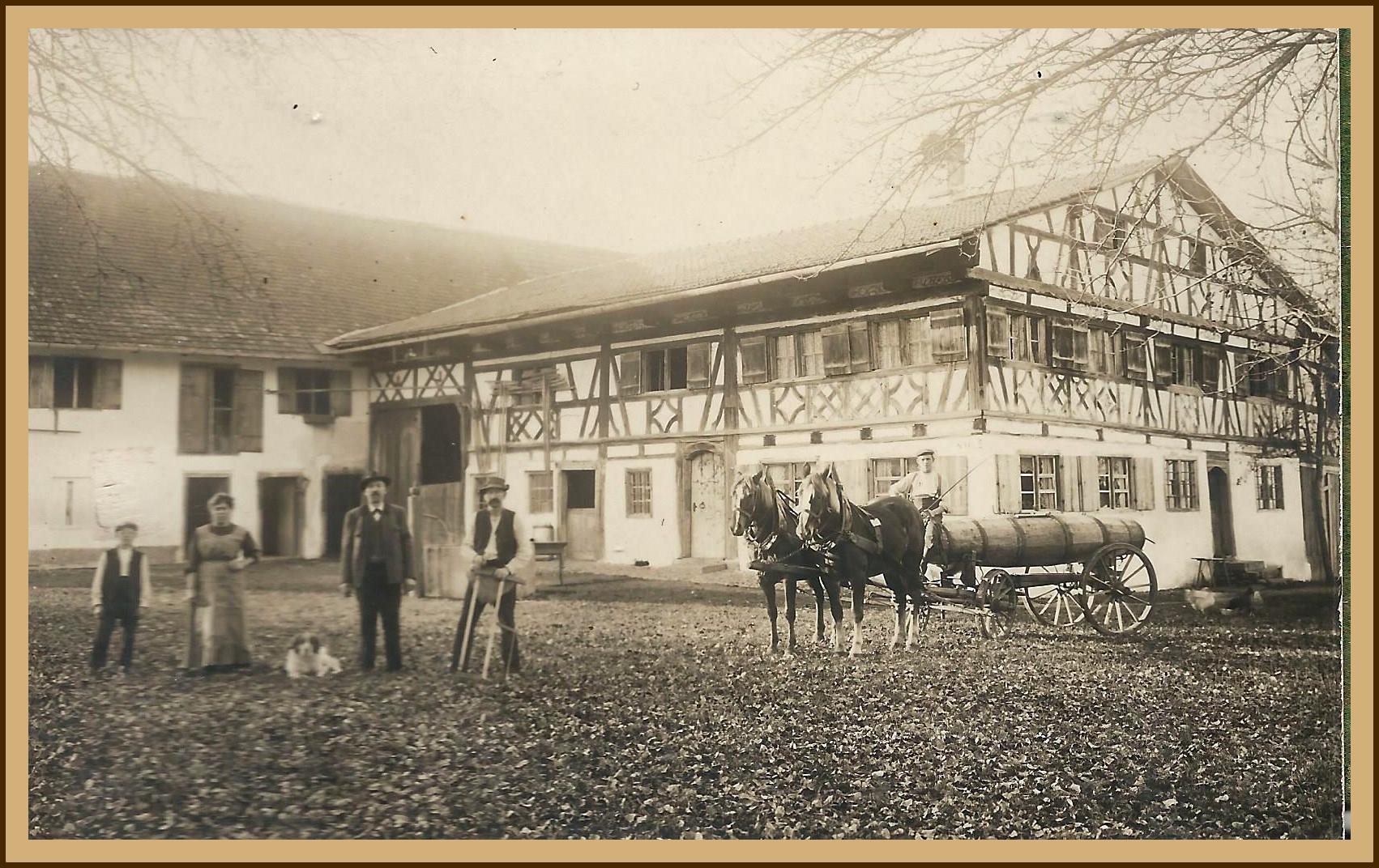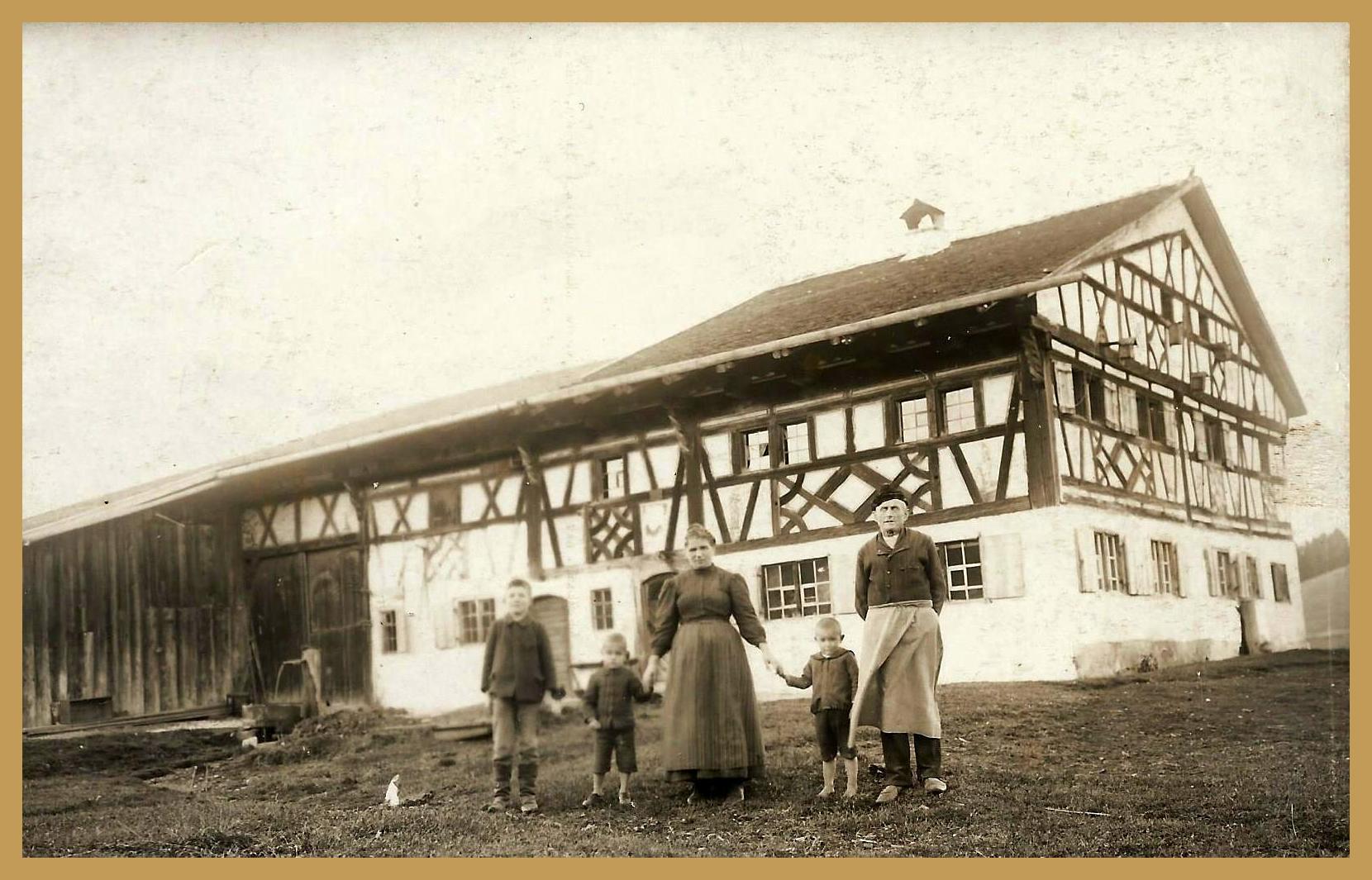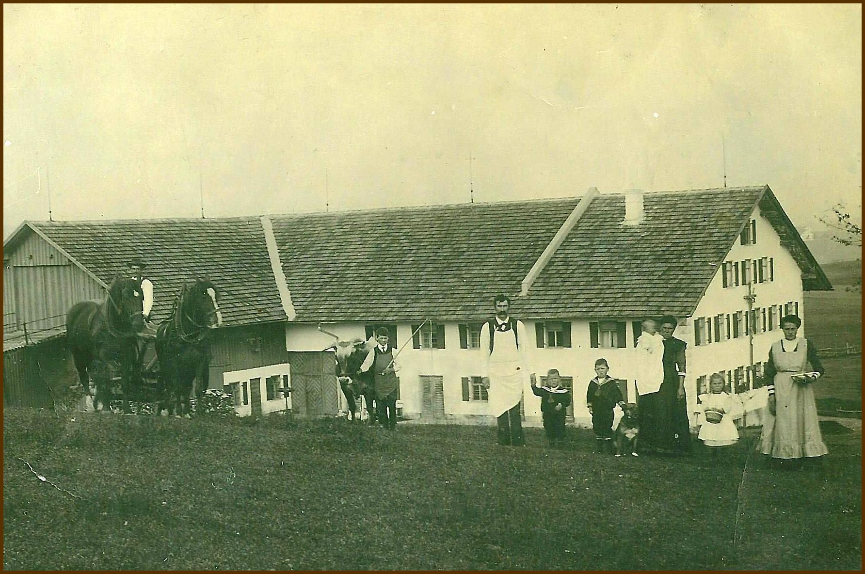 1897 Vier Bauernhöfe Der Fotograf fotografiert Hab und Gut, den stattlichen Hof mit dem Wiederkehr, den Knecht auf dem Gespann, den Bauer mit seinem Fahrrad, die Mutter mit den Kindern, den treuen Hund, die Rösser, den Brunnen im Hof, die weißen Sonntagschürzen, den Apfelbaum und den Garten .Der Hauptschmuck der Höfe sind die schönen gleichmäßig aneinander gereihten Fenster mit den Fensterläden.