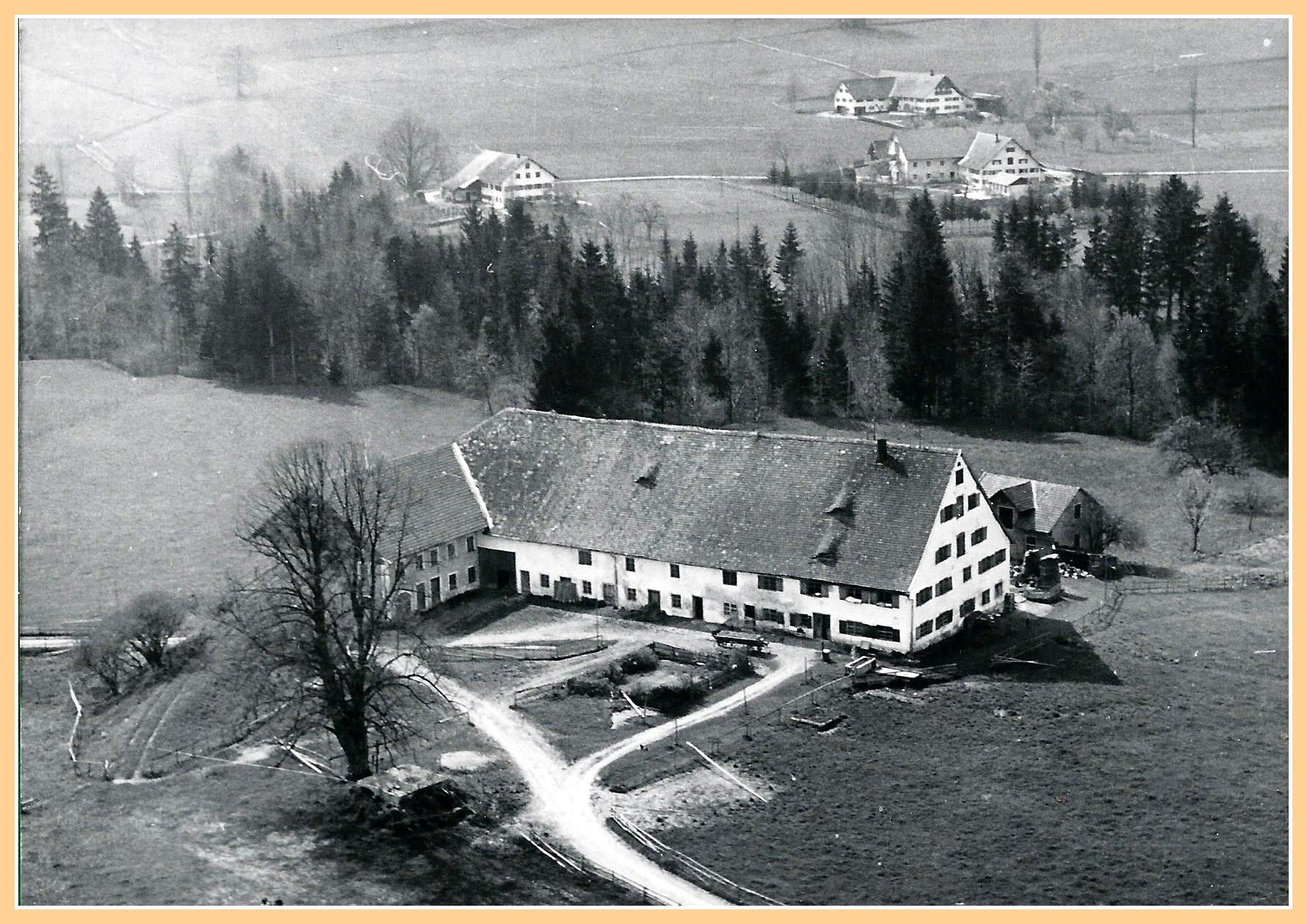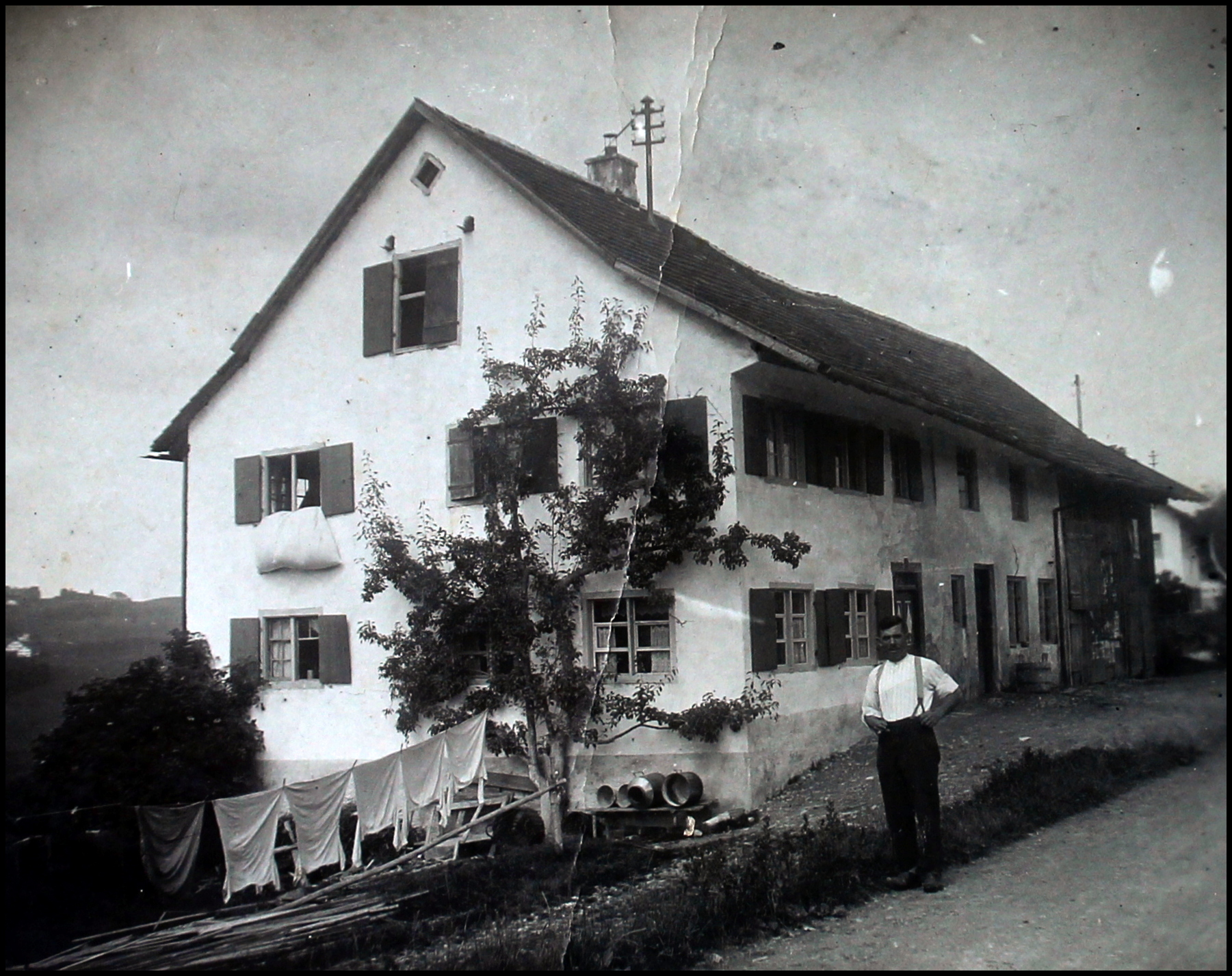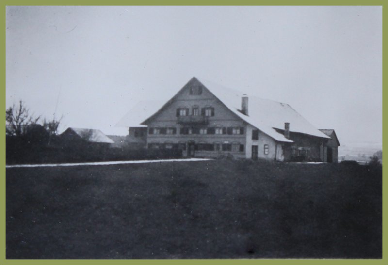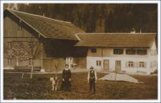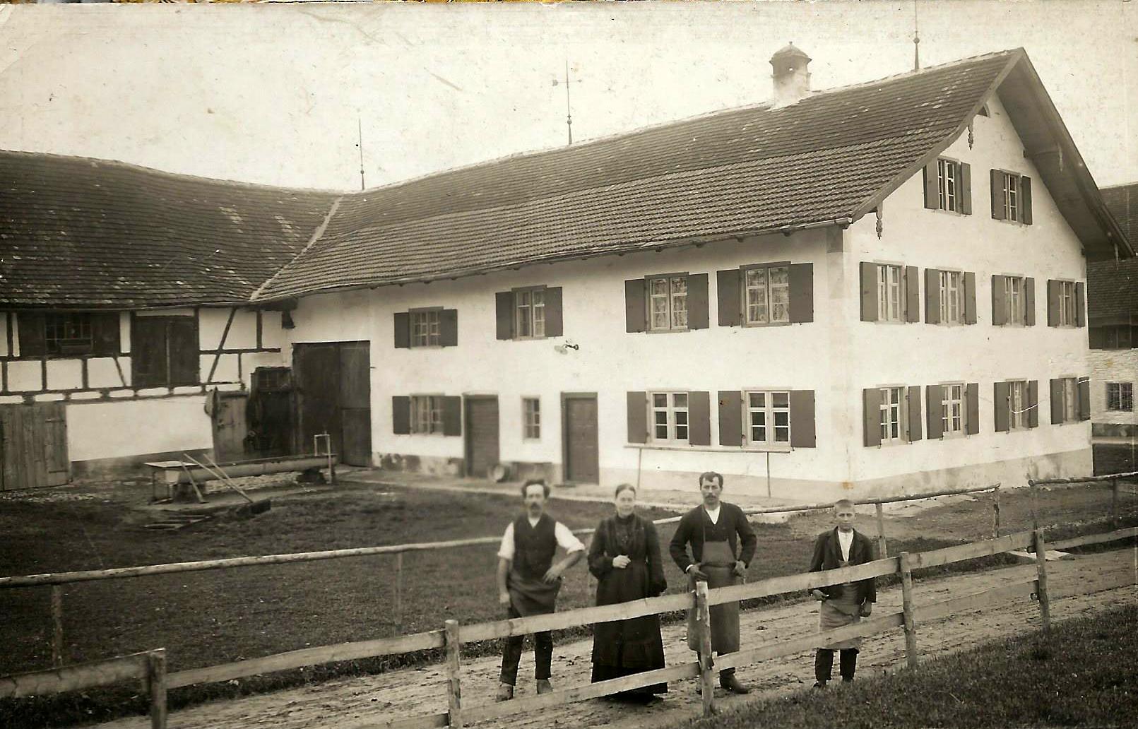 1897 Vier Bauernhöfe Der Fotograf fotografiert Hab und Gut, den stattlichen Hof mit dem Wiederkehr, den Knecht auf dem Gespann, den Bauer mit seinem Fahrrad, die Mutter mit den Kindern, den treuen Hund, die Rösser, den Brunnen im Hof, die weißen Sonntagschürzen, den Apfelbaum und den Garten .Der Hauptschmuck der Höfe sind die schönen gleichmäßig aneinander gereihten Fenster mit den Fensterläden.