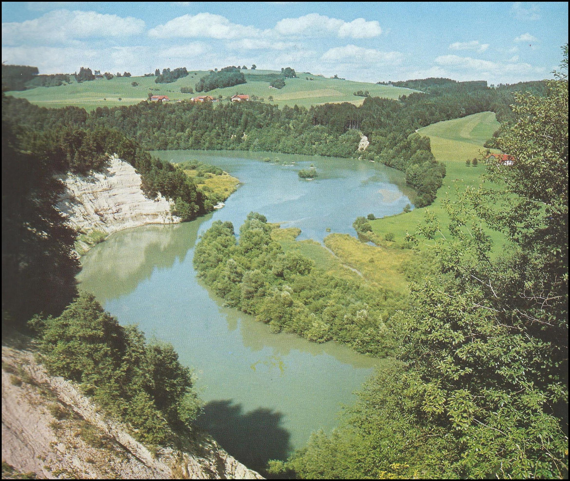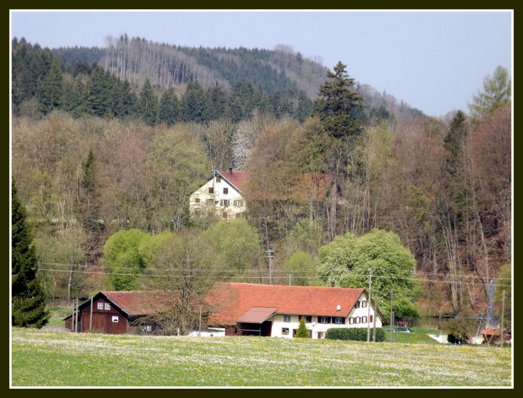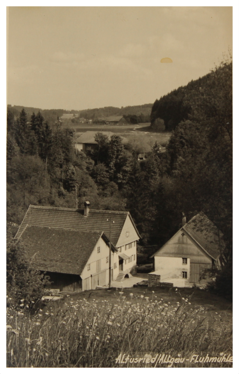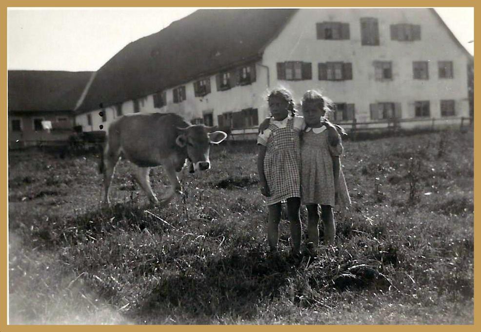 Pfosen liegt gegenüber von Fischers auf der rechten Illerseite. Das farbige Bild zeigt im Vordergrund Fischers, dahinter den Baldauf Hof, dazwischen fließt die Iller. Auf dem Schwarz-Weiß-Bild hat sich die Familie Baldauf vor dem Hof aufgestellt.