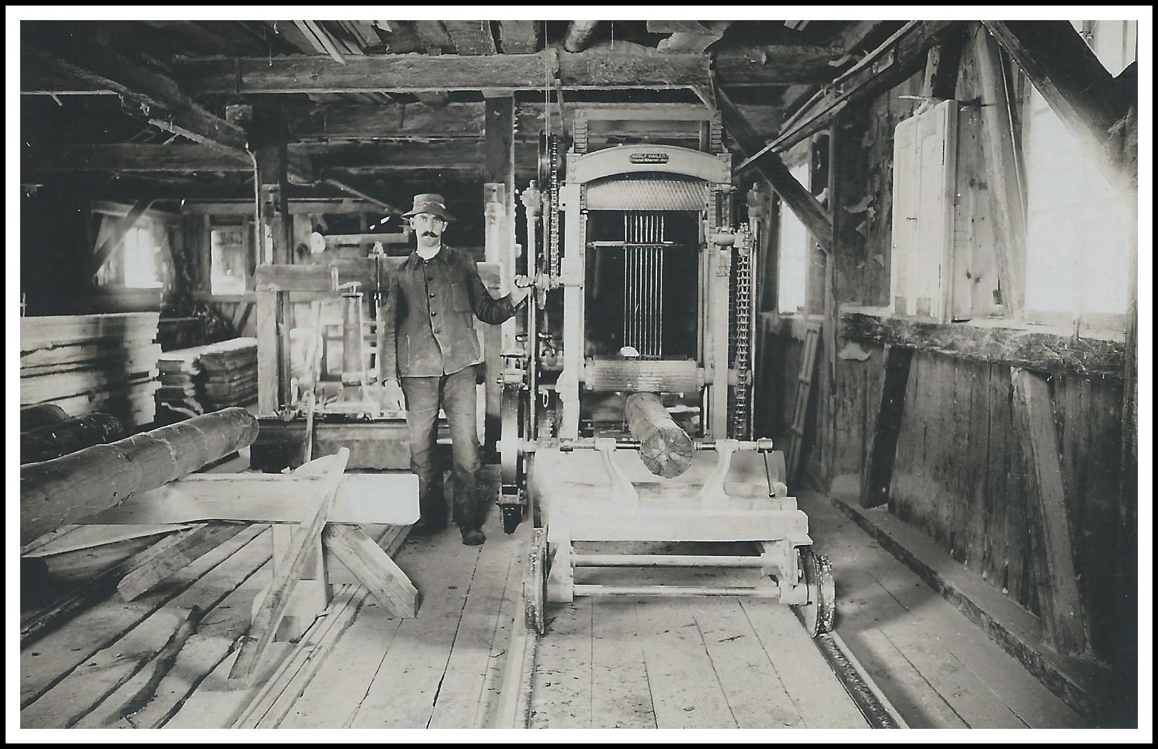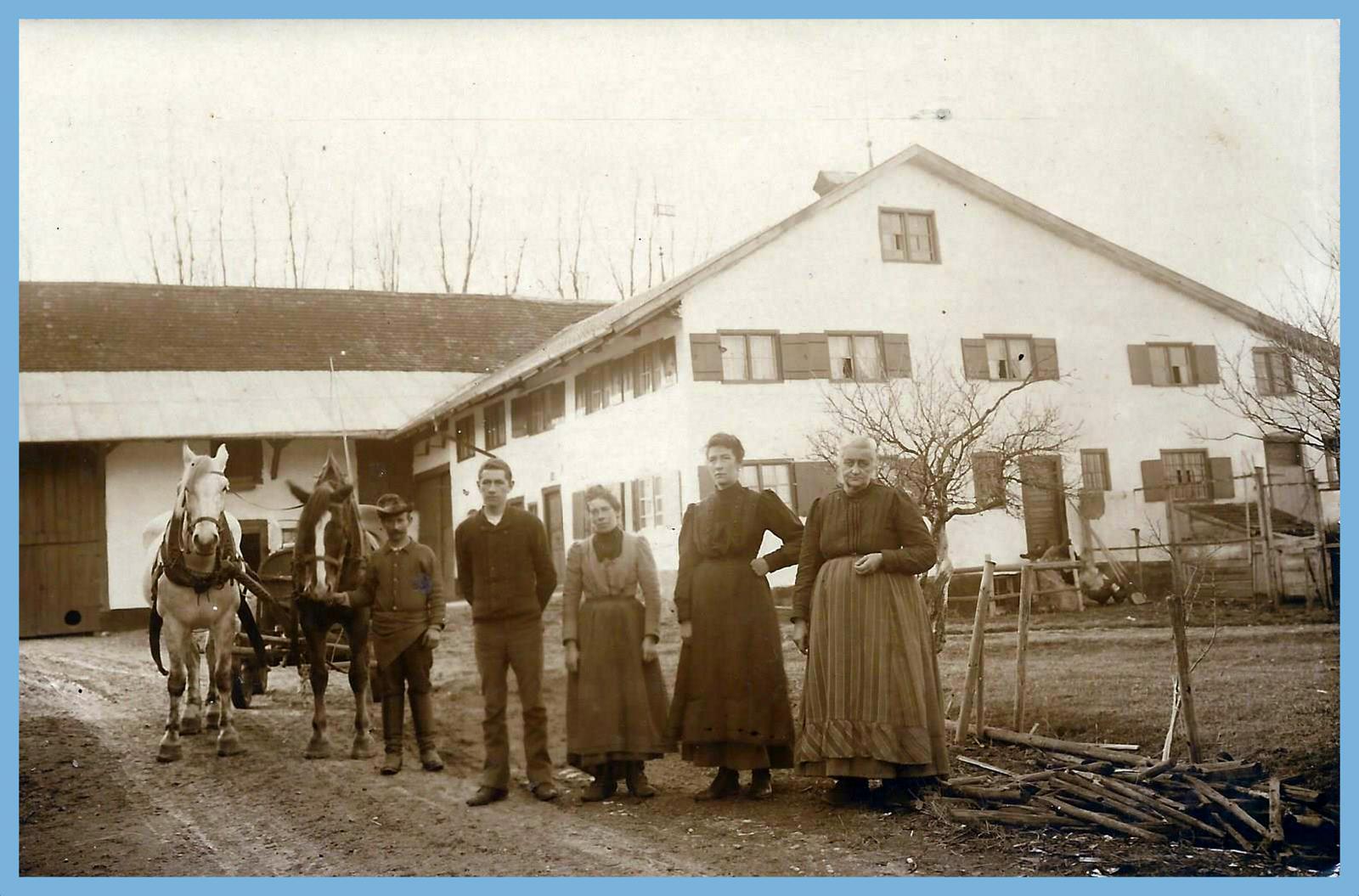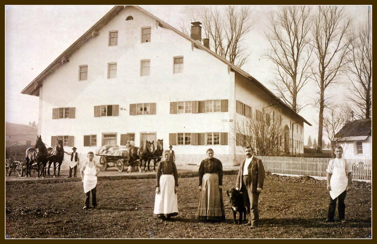 Sie war eine Sägemühle und eine Mahlmühle, angetrieben wurden die Mühlenräder von der Koppach. Alles was zum Hof gehört hat sich für den Fotografen aufgestellt. Im Vordergrund der Gutsbesitzer und Müller mit seiner Frau und der Großmutter, im kleinen Abstand die zwei Söhne, im Hintergrund der Knecht und die Magd mit den Pferden und Wagen. Auch der Hund darf bei seinem Herrn dabei sein.