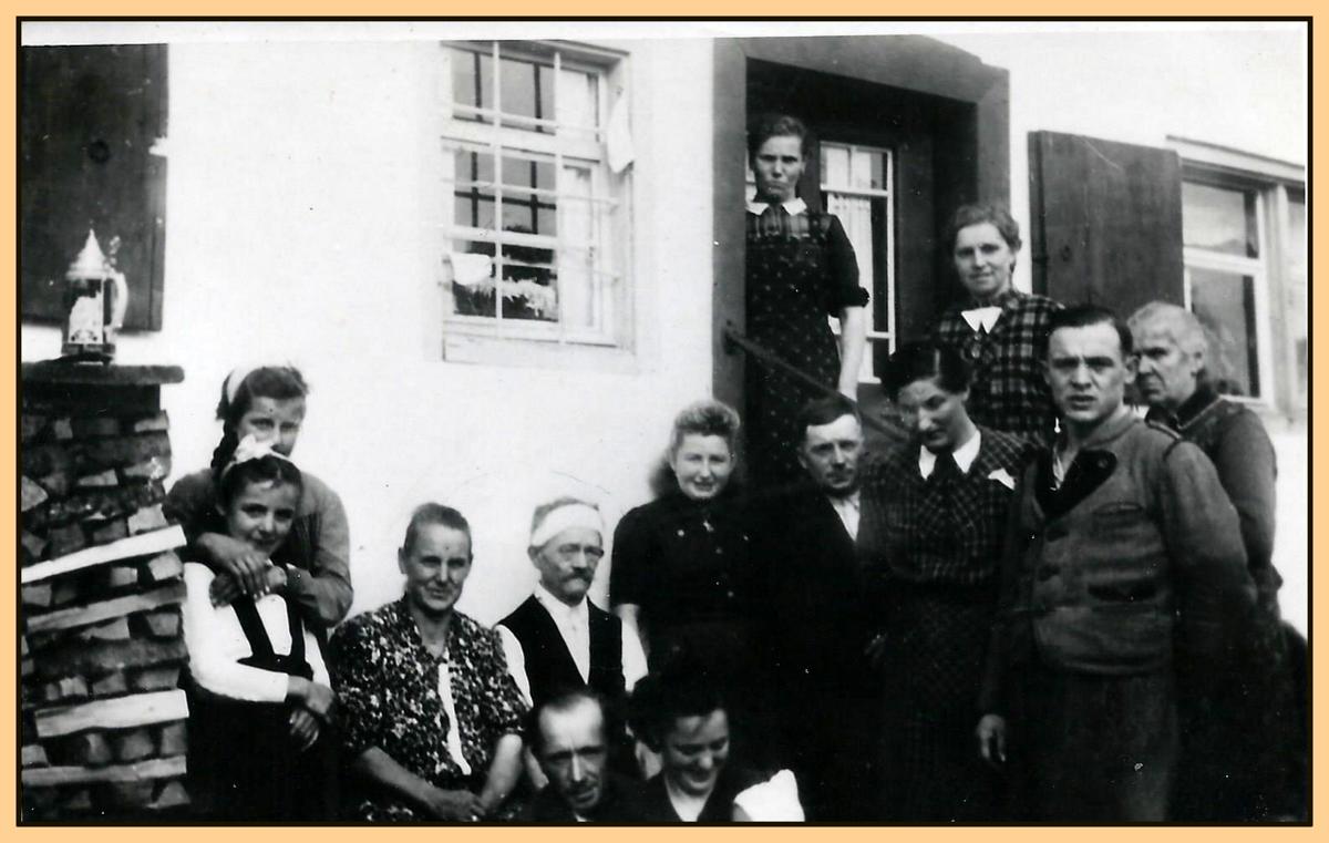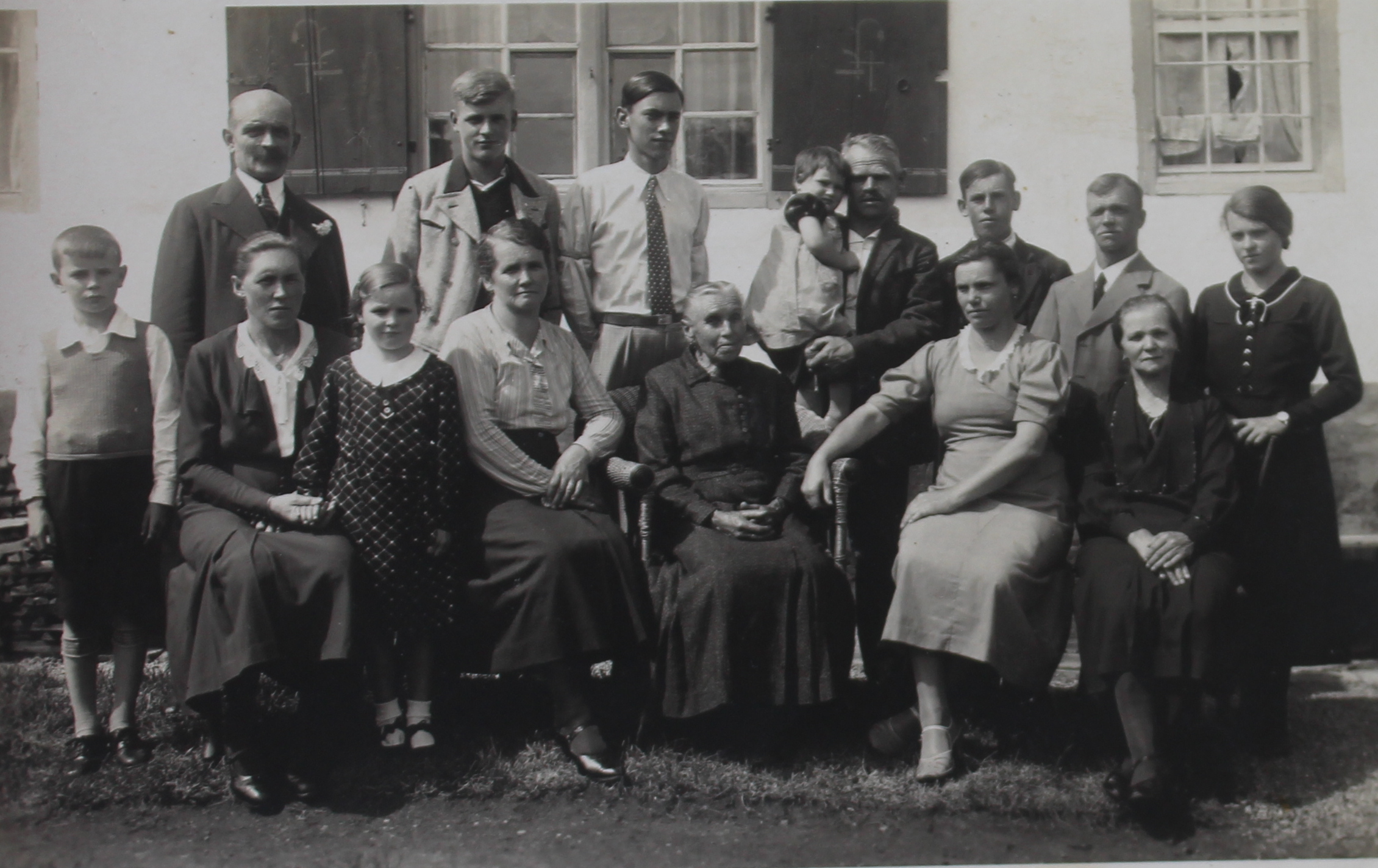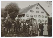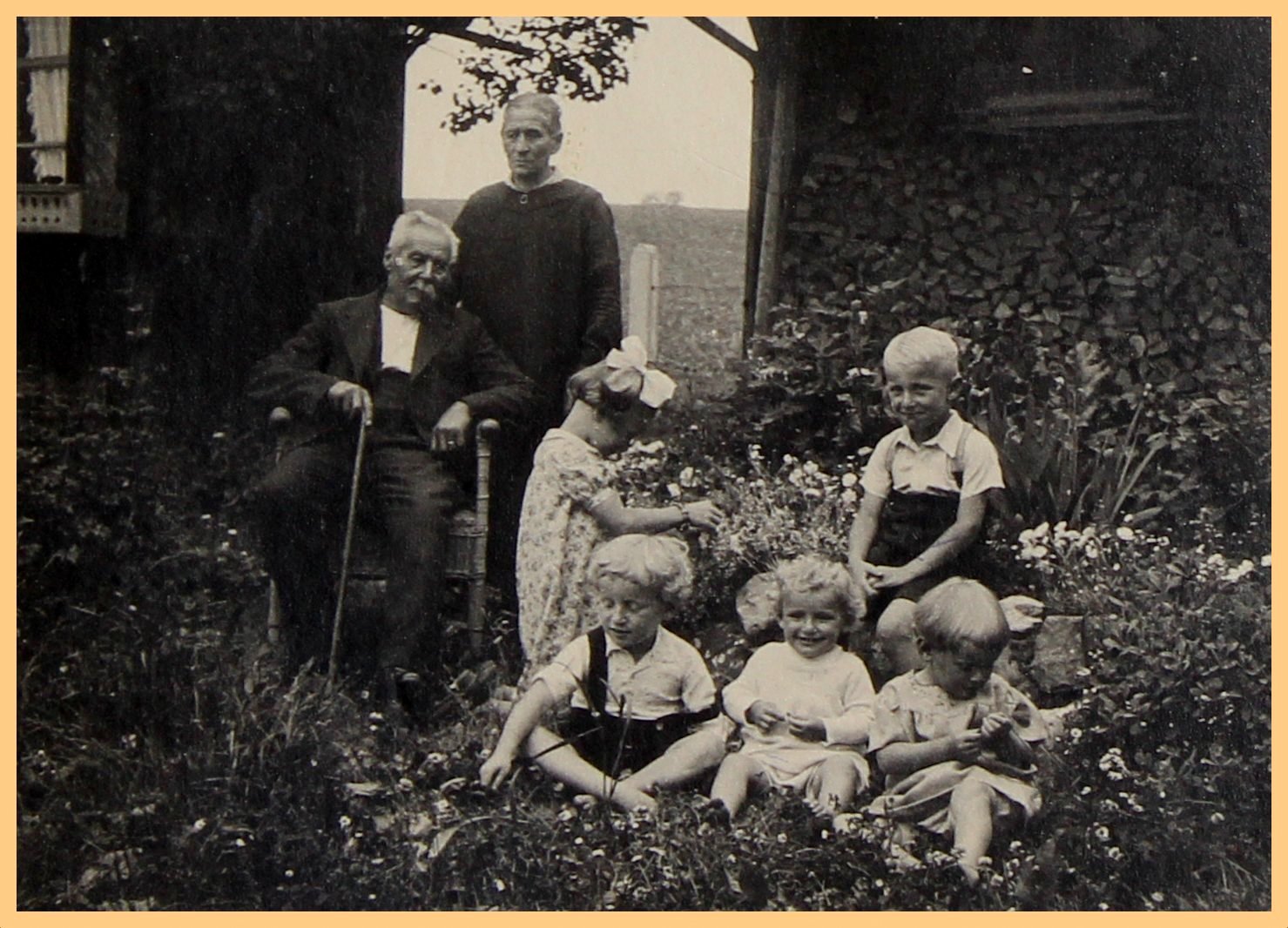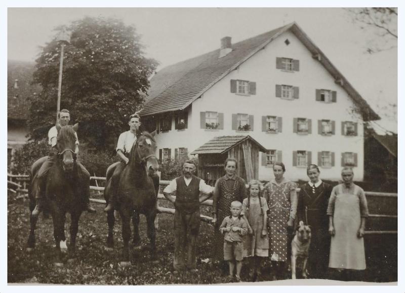 Personen auf dem zweiten Bild, von links: Franziska, Theresia, Magd Dora, Johann Georg, Maria, Franz Xaver, Anna Cäcilia, Mutter Maria Anna, Vater Franz Xaver mit Hund