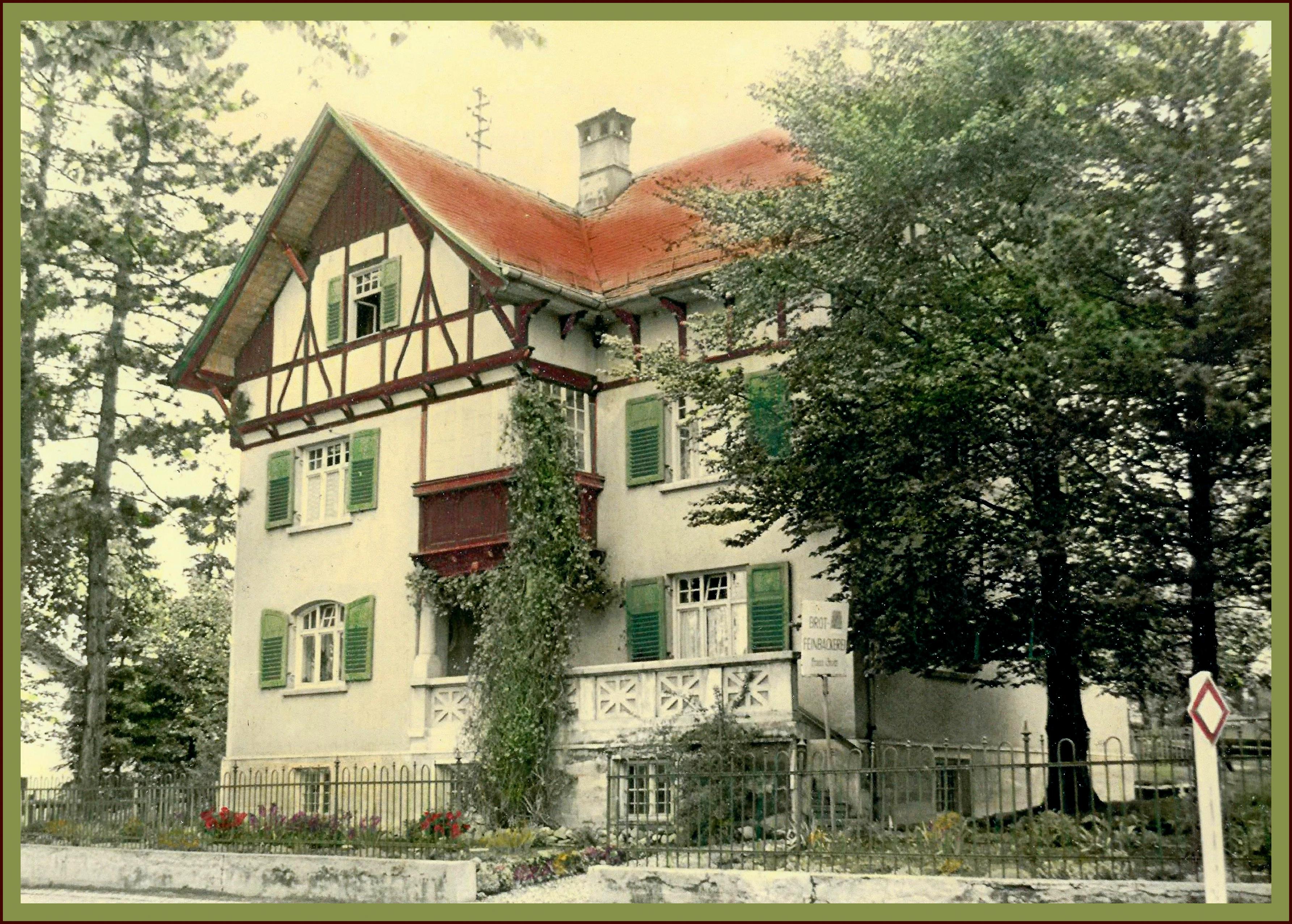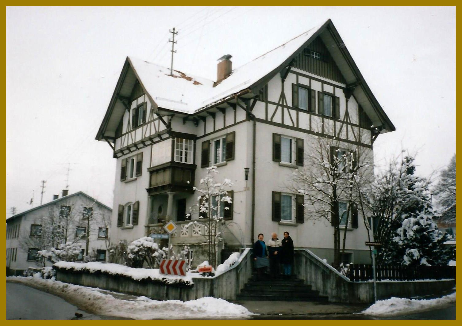 Noch längere Zeit gab es in der Illerstraße Wohnhäuser im Allgäuer Stil, hier das Doppelhaus Nr. 104 und 104 a. Im Bild Familie Lingenhöl, westliche Haushälfte, im Garten hängen an der Wäscheleine weiße Leinentücher. Bild 2. Aus der Haustüre des Hauses Nr.104 schaut die Hausbesitzerin Frau Konrad heraus, vor ihr die Hausbewohner. Bild 3. Am selben Ort aber zu einer anderen Zeit hat sich diese Gesellschaft eingefunden.