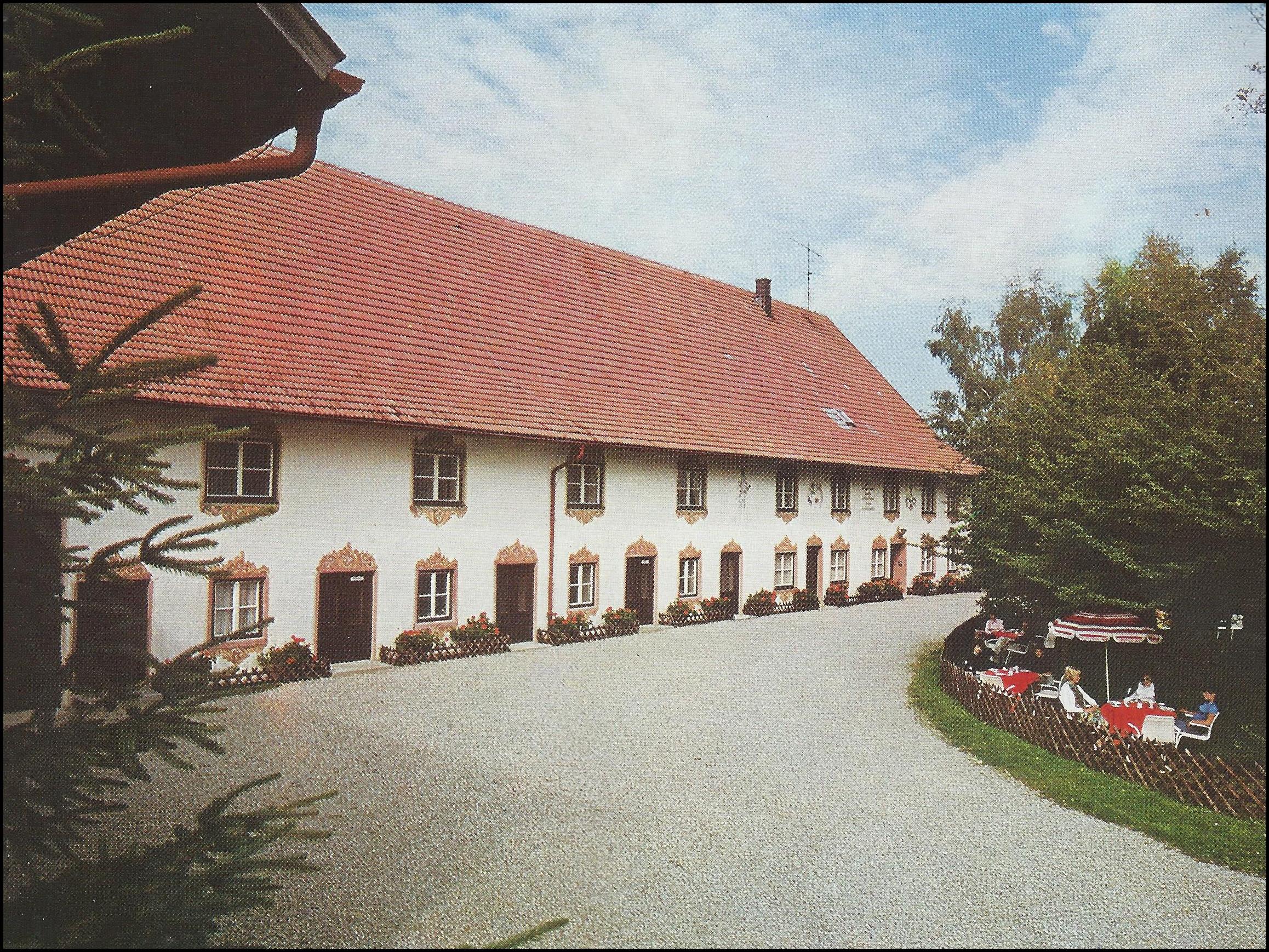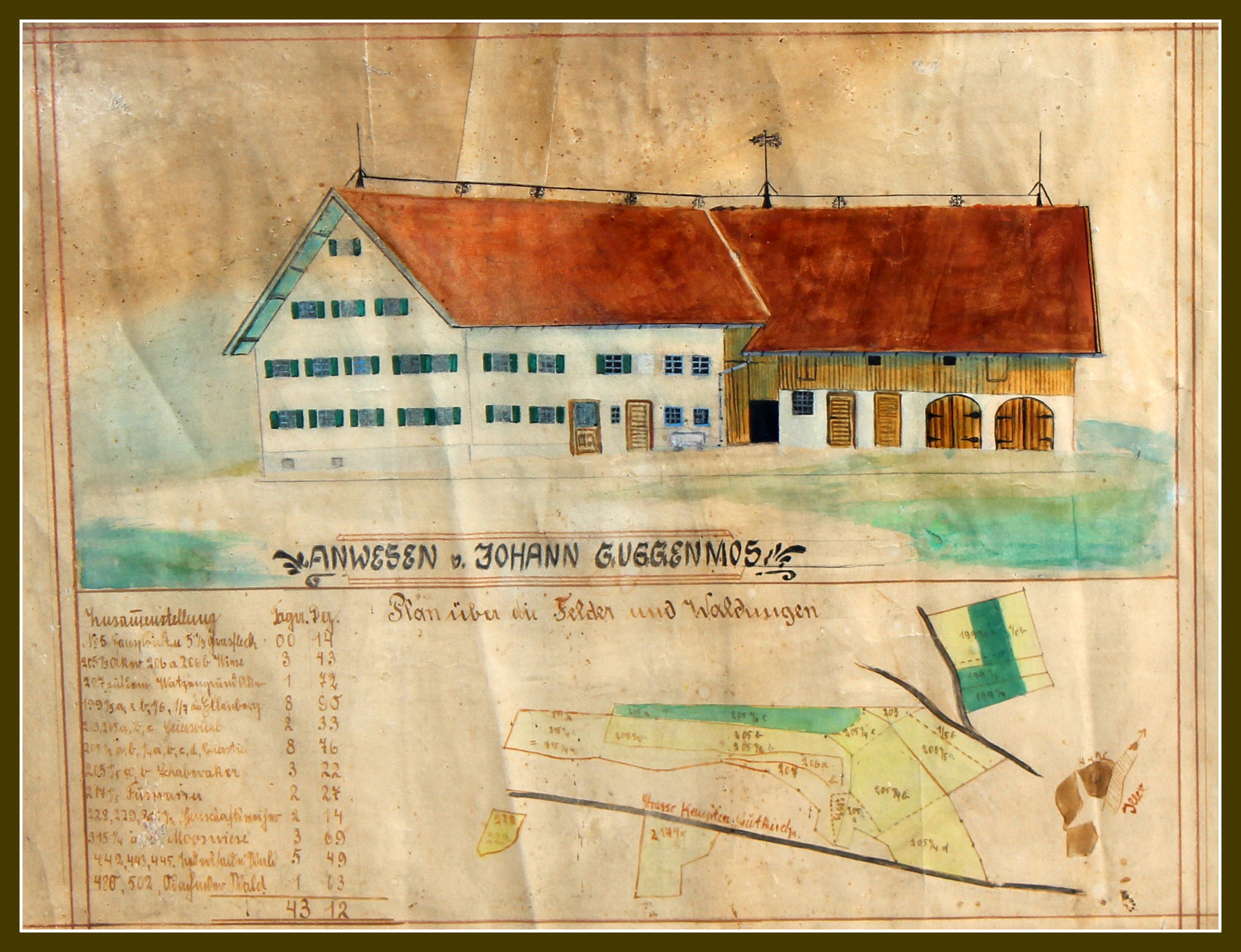 Im 19. Jahrhundert zogen Grafiker von Hof zu Hof durch das Land und boten ihre Dienste an. 1880 ließ Johann Guggenmos sich eine kolorierte Federzeichnung von seinem Anwesen erstellen. Auch eine Auflistung der Wiesen, Äcker und Wälder mit Angabe von Tagwerk und Dezimal fand Platz auf dem gerahmten Bild, dazu der Grundriss aller Flächen. Für seine Zeit war der Guggenmoshof eine Besonderheit. Denn normalerweise sind die drei Bauteile Wohnen, Stall und Schopf in einer Linie von Ost nach West aneinandergereiht. Der Guggenmoshof ist anders gegliedert. Der Wohnteil mit dem Giebel weist nach Süden, dahinter kommt der Stall, der Schopf zeigt als Widerkehr nach Osten. Auf dem Dach ist eine aufwendige Blitzableiteranlage montiert, dazu eine prächtige Wetterfahne.