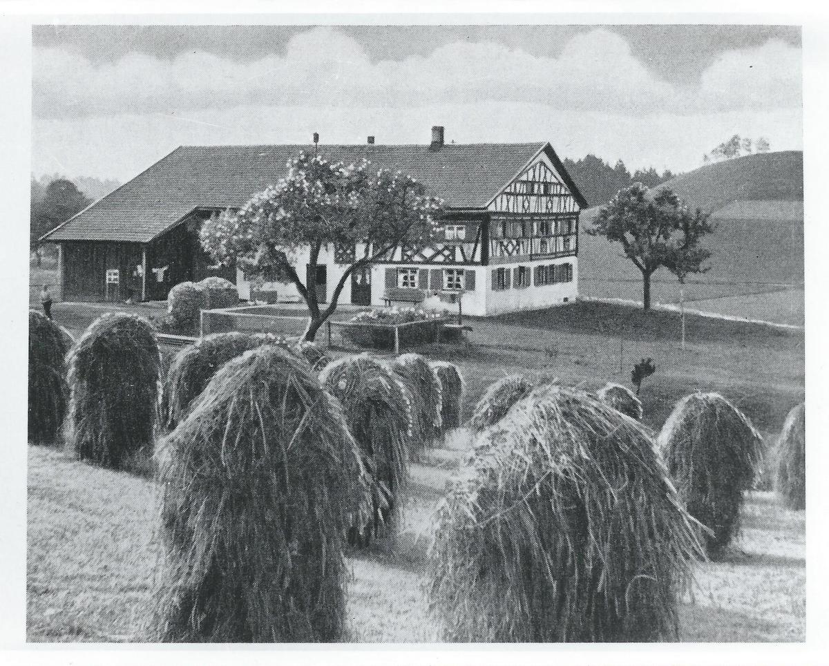 Im Vordergrund Heinzen mit Gras zum Trocknen, eine besonders arbeitsreiche Methode des Heumachens. Für das Heumachen gab es eine eigene Fachsprache. Der 1. Schnitt hieß Heuet, der 2. Schnitt Grummet, Birling waren Heuhaufen und Loreihen waren Heureihen. Unter Heinzen verstand man Pfähle mit Querstangen.