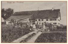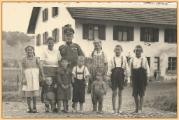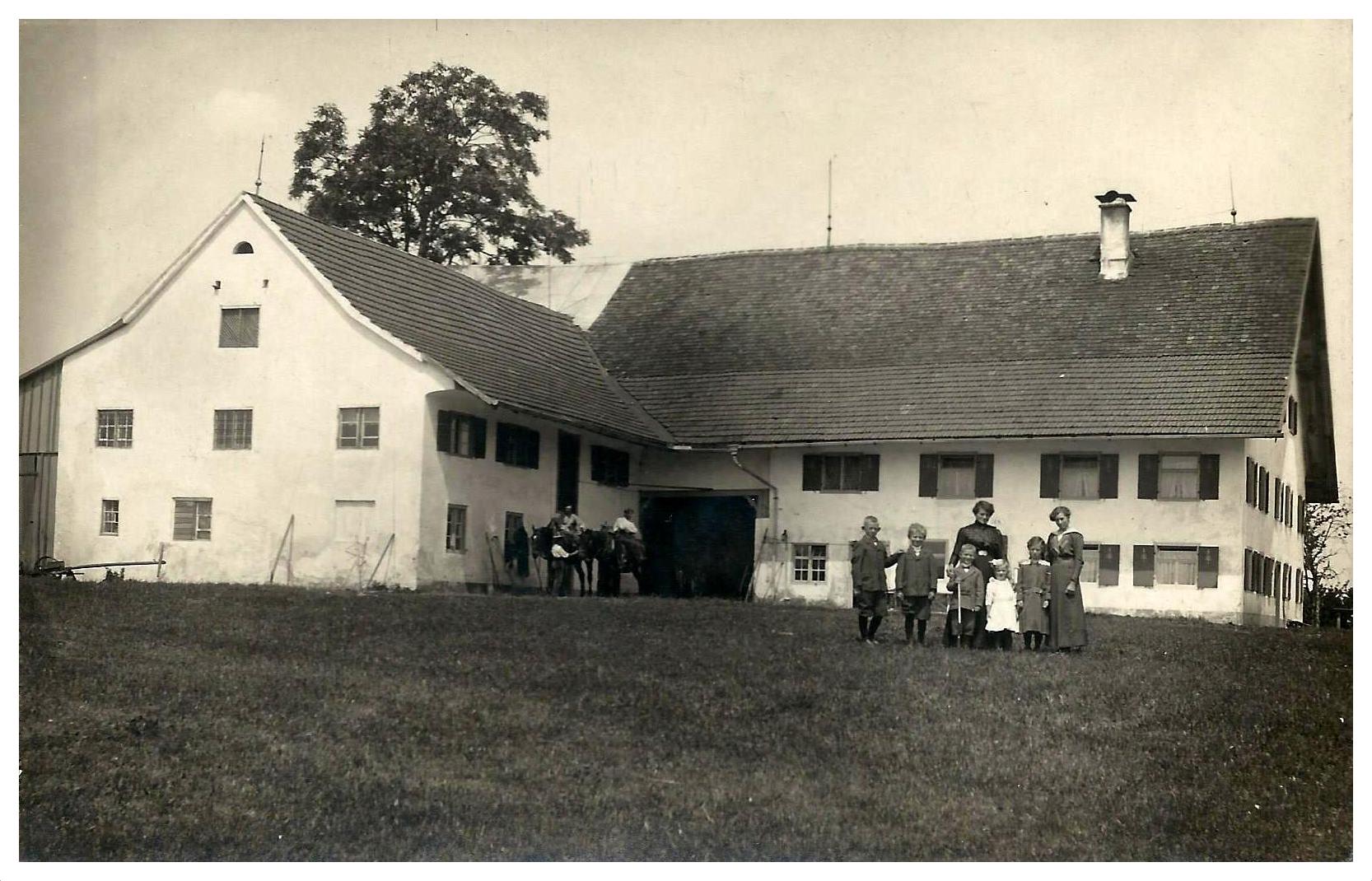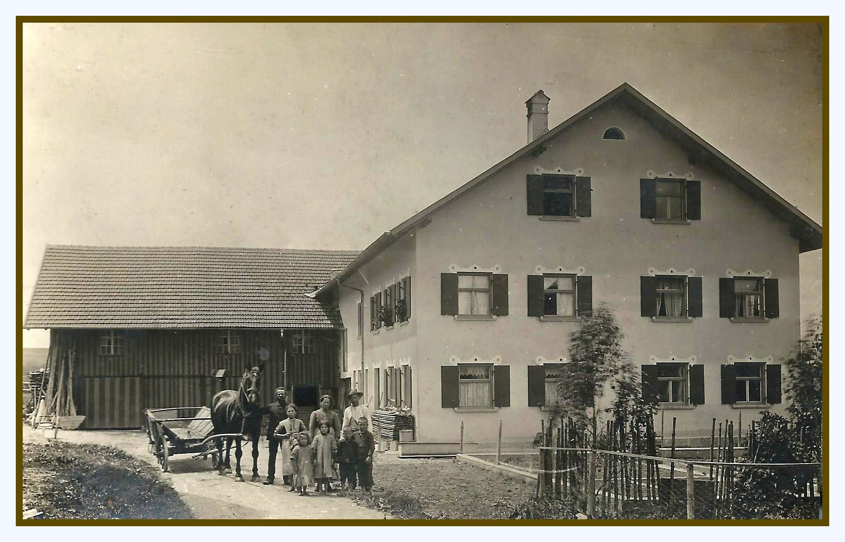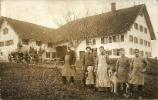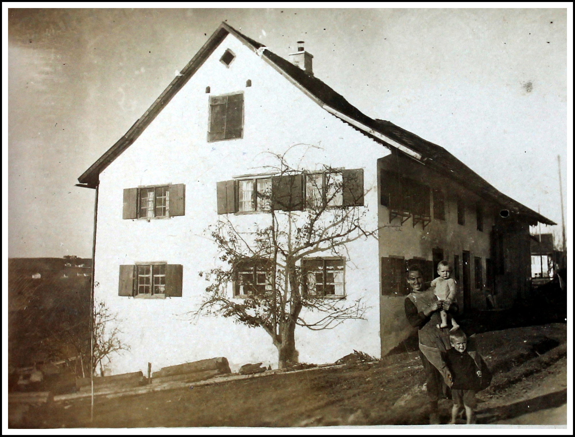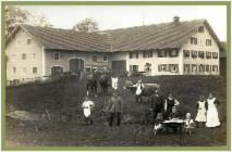 Hof Nr. 265. Familie Xaver Mayer, Hausname Schwägele. 1897 Neubau des Wirtschaftsgebäudes. 1910 Wohnhausumbau. Drei kleine Kinder sitzen am Kindertisch.