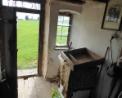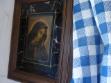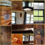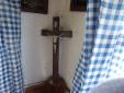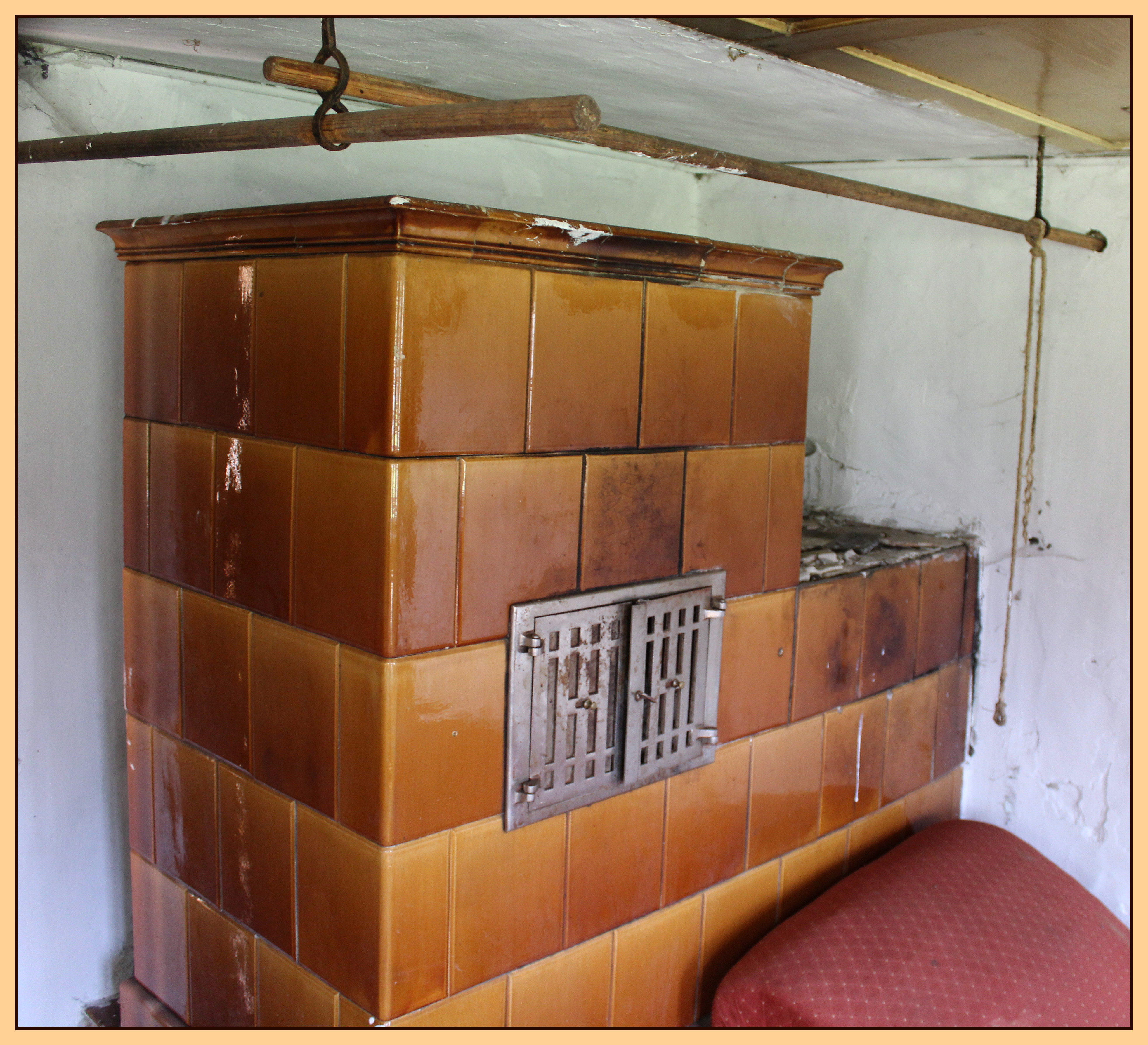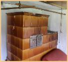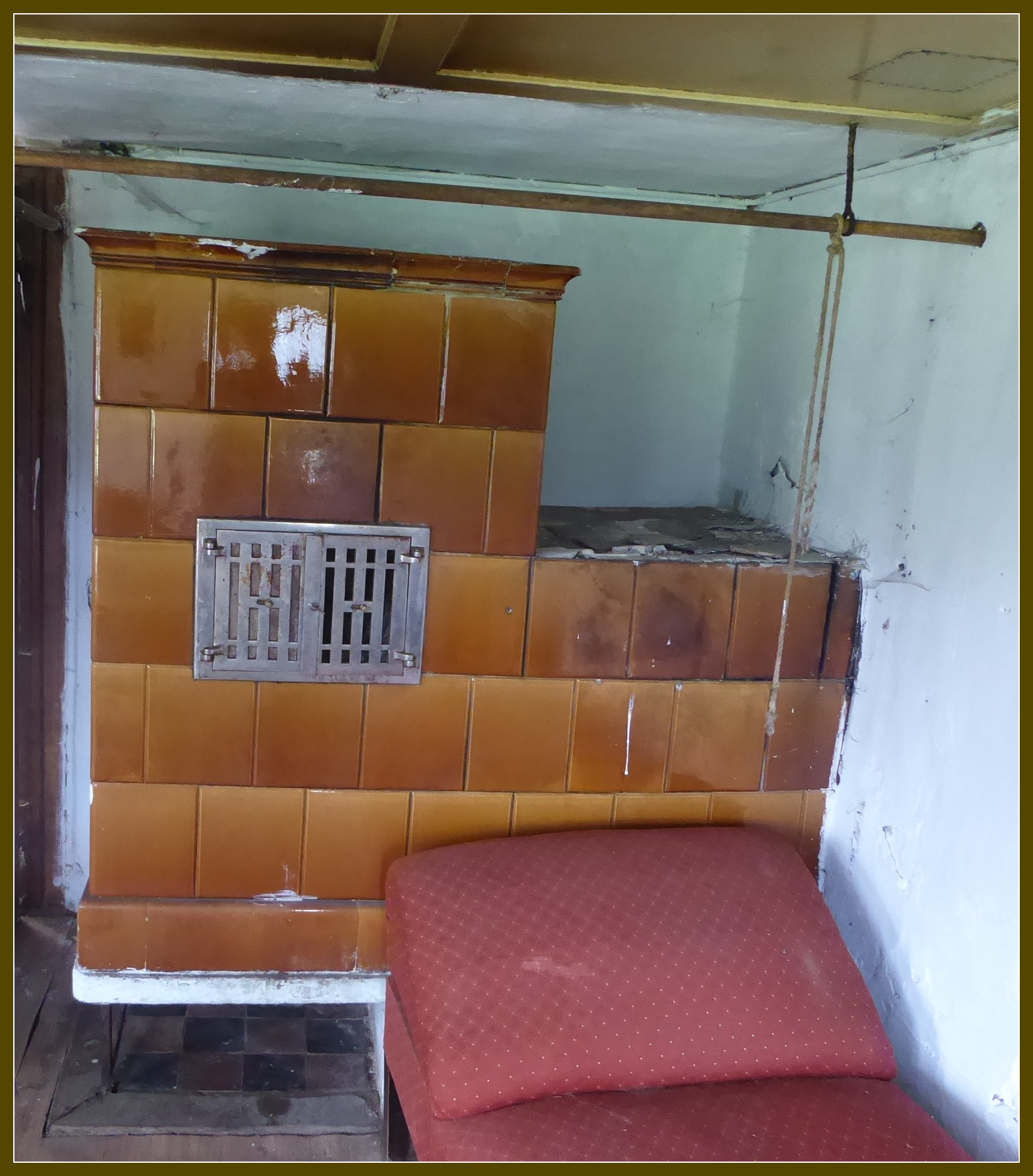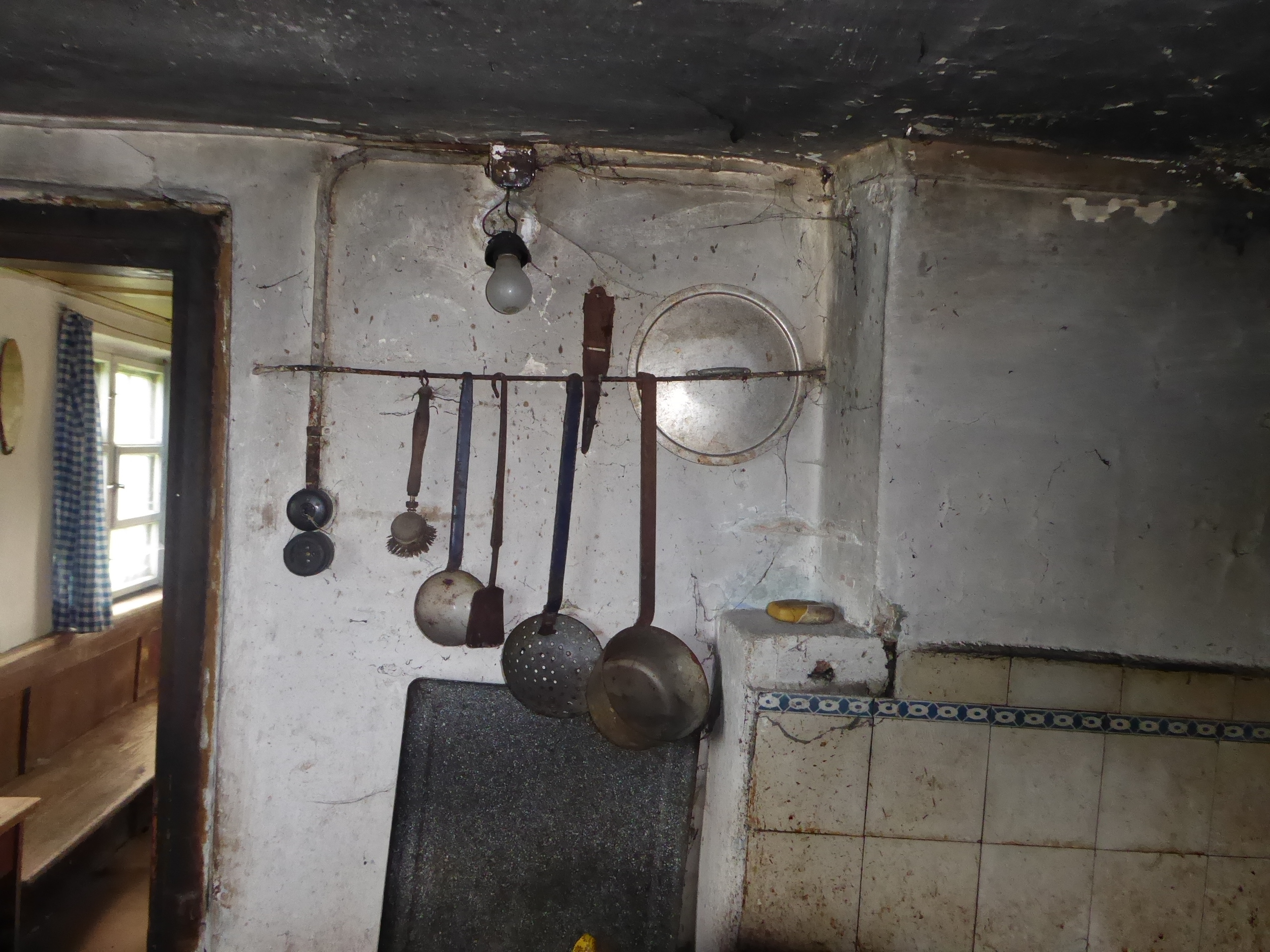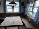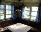 In der Wohnstube: Eckbank, quadratischer Tisch,Fensterbänke aus Holz, Holzdecke aus Kassetten, Hergottswinkel mit Jesus, Maria und Magdalena, kleinrahmige Doppelfenster, Hängelampe