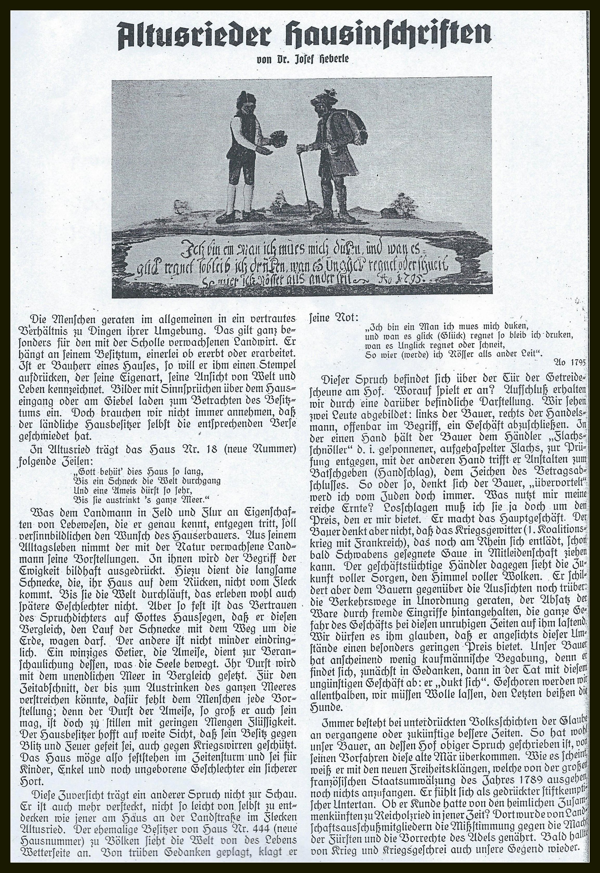 Im Wochenblatt Nr. 21/1950 beschreibt Dr. Joseph Heberle zwei Häuser mit Inschriften. Beim ersten Haus (Ort Hausnummer 18) ist allerdings der Spruch nicht mehr erkennbar. Das zweite Haus (Völken Hausnummer 444) hat aber sein schönes Aussehen mit samt der Malerei und Inschrift bewahrt.