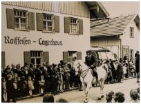 An der Kurve im Ort, wo die Hauptstraße zur Kemptener Straße wird. Ein Festzug zieht vorbei. An Stelle des Schaberhauses steht heute ein Neubau mit Sparkasse und Apotheke. Das ehemalige Krughaus links daneben ist schon abgerissen. An seine Stelle baute Feneberg einen Supermarkt. Es ist die Zeit, als die Autos noch vielfarbig waren.