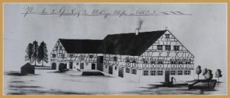 Zeichnung vom Hof in Streifen vor dem Brand 1848