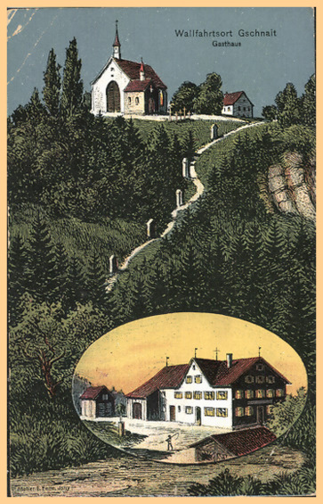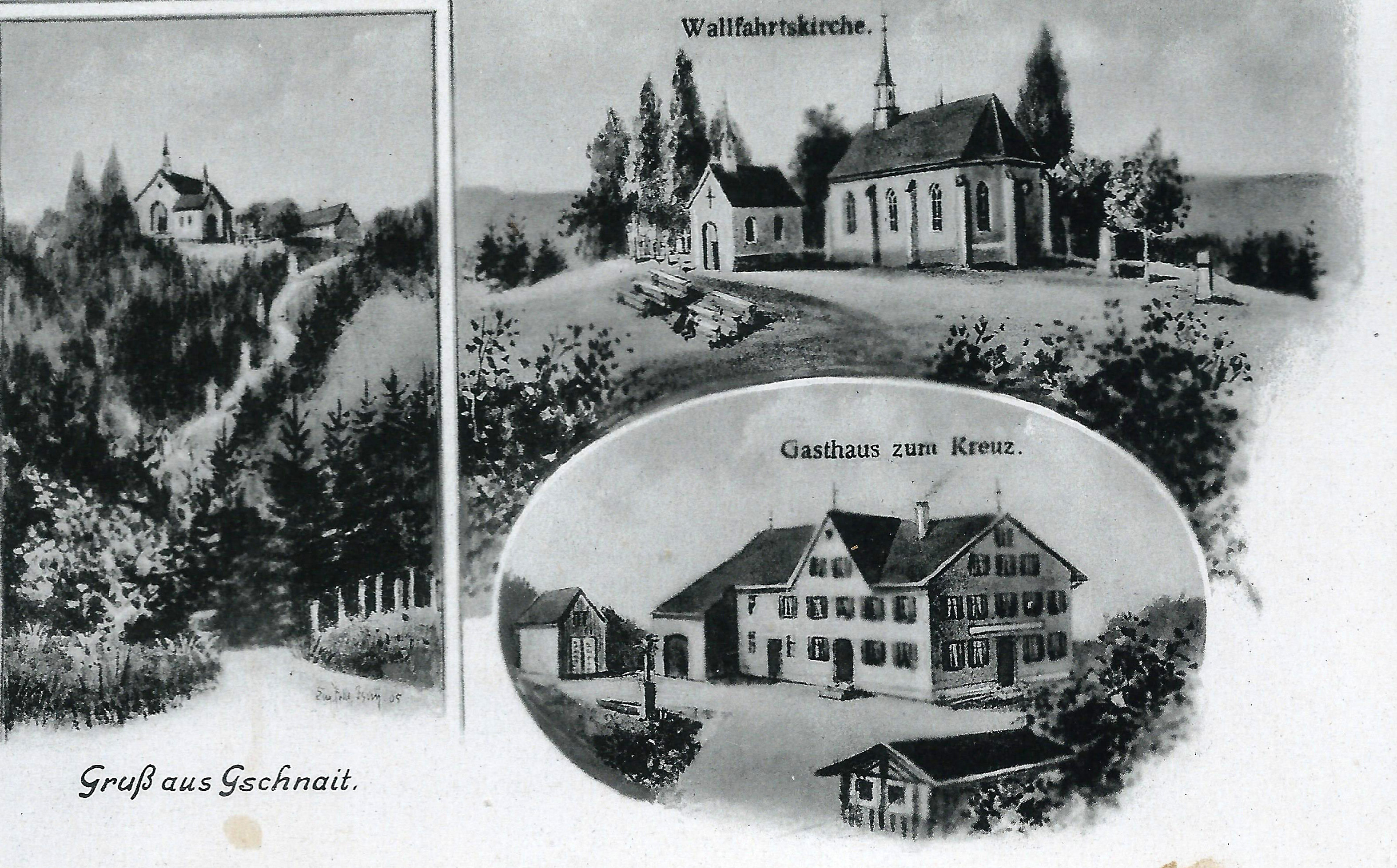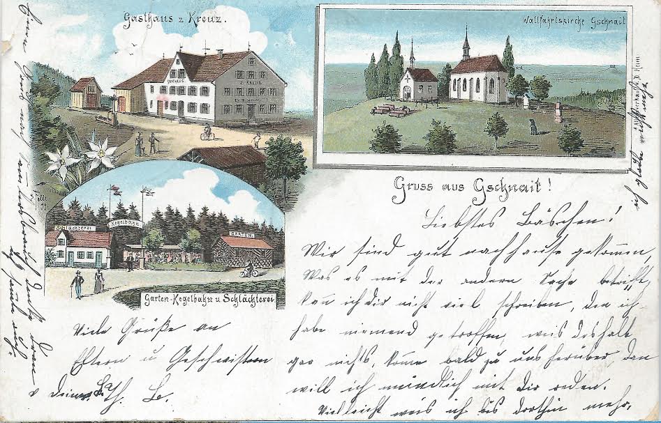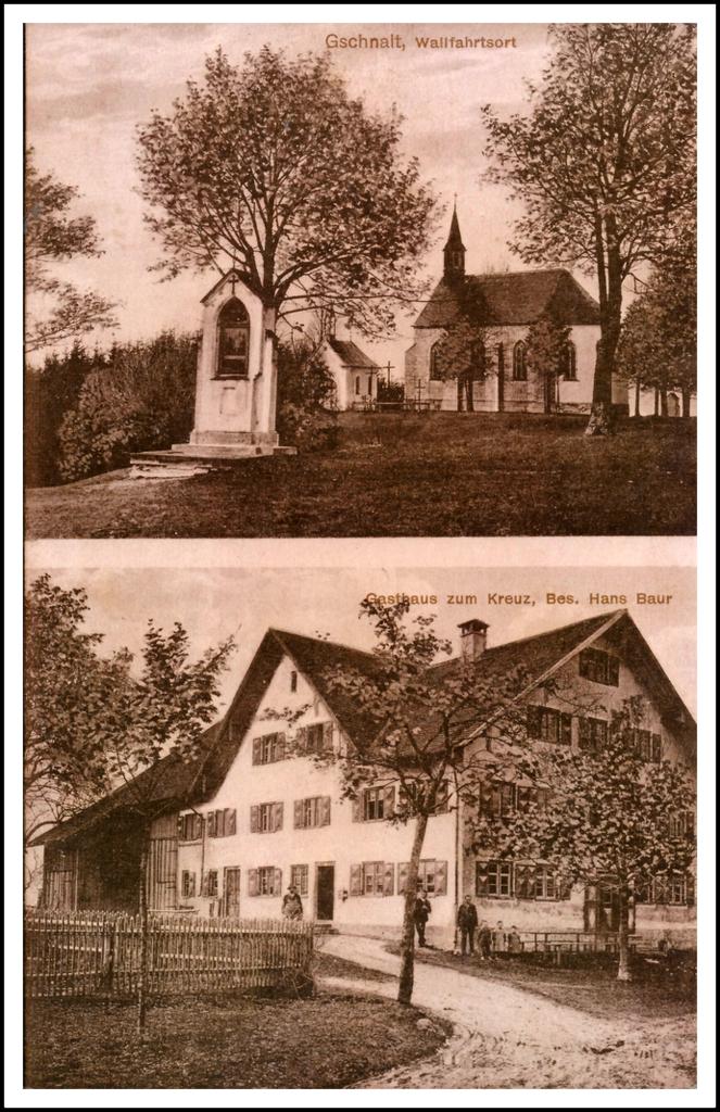 Die Postkarten von 1900 und 1908 erinnern daran, dass das Gschnaidt mit seinen Kapellen einerseits ein bekannter Wallfahrtsort war, andererseits dem Wallfahrer mit dem Gasthaus Zum Kreuz mit angeschlossener Metzgerei, Gartenlokal und Kegelbahn aber auch die entsprechende leibliche Versorgung bieten konnte. Die heutige Wirtsfamilie Baur ist seit 1905 auf dem Gschnaidt ansässig. Die Quelle mit dem heilkräftigen Wasser ist der Ausgangspunkt des Kreuzweges mit den stattlichen Bildstöcken. Text von Paul Prinz.