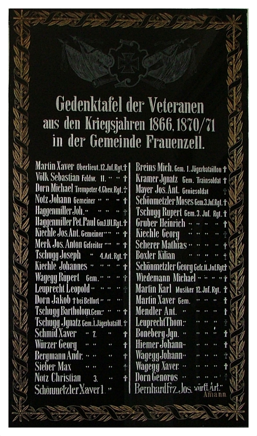 2. Gedenktafel der Veteranen aus den Kriegsjahren 1866, 1870/71 in der Gemeinde Frauenzell