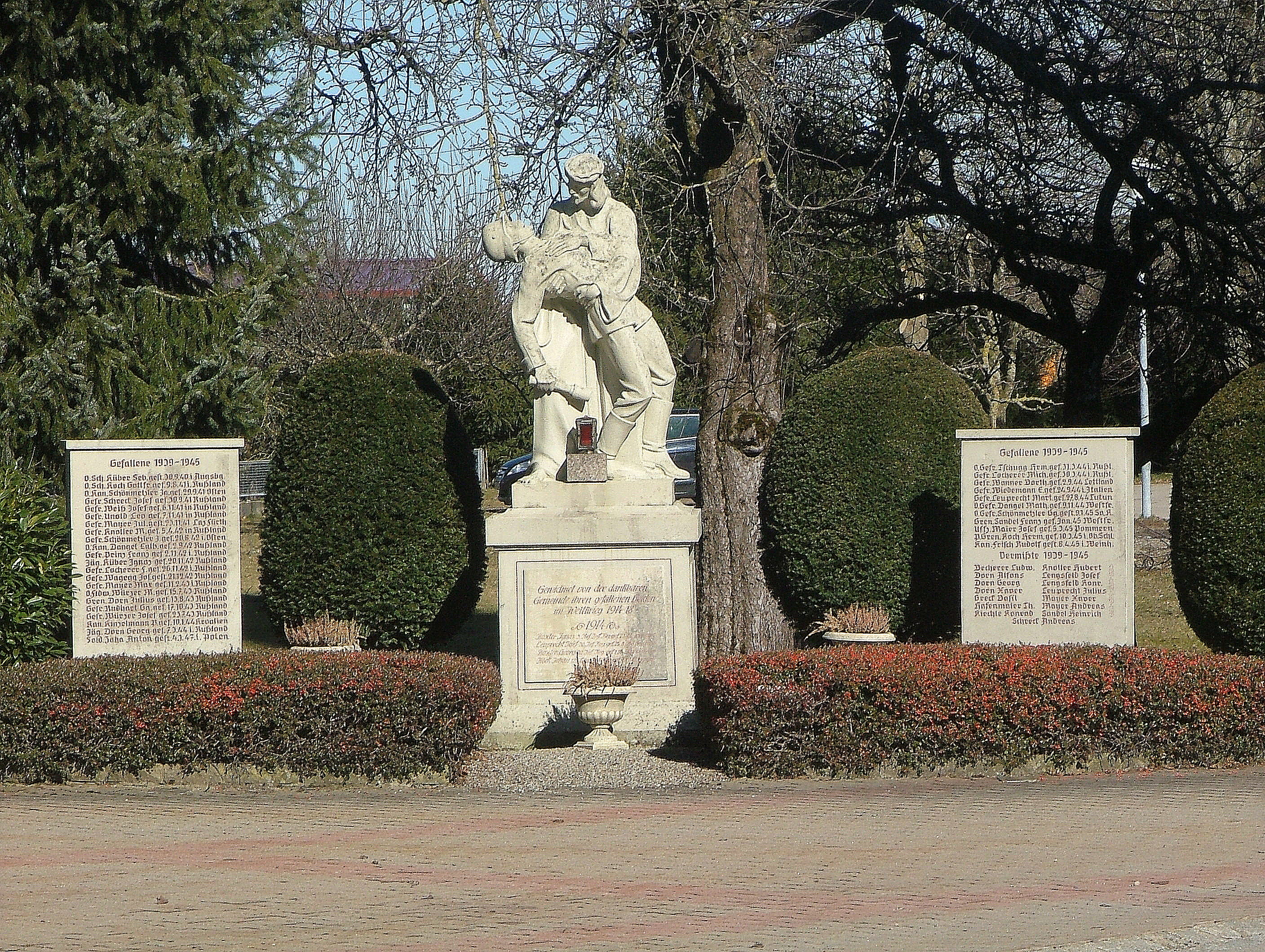 Im Kreuz die Namen von 41 Gefallenen, unter dem Kreuz 20 Vermisste. Links und rechts 128 Heimkehrer.