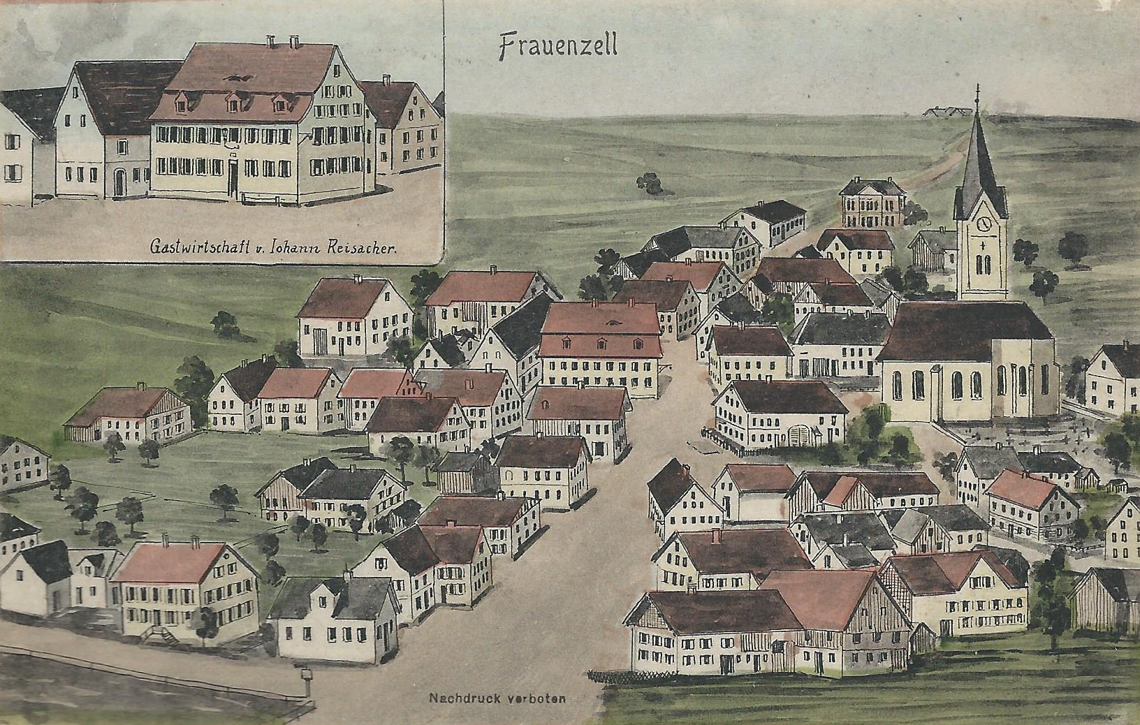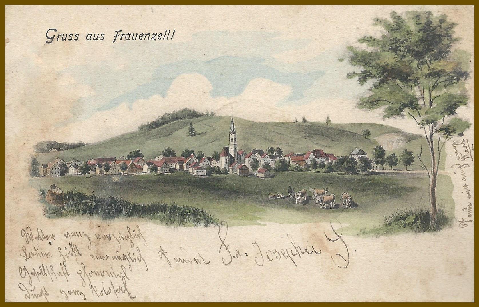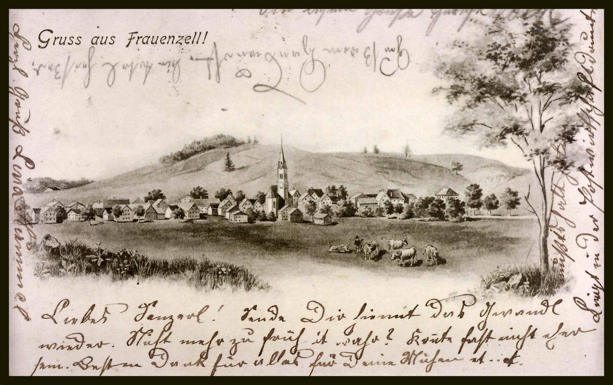 Die Karte wurde am 15. Februar 1901 nach Engelbolzhofen bei Leutkirch geschickt. Rechts im Vordergrund steht ein Mann mit hellem Hut, der mit erhobener Hand auf Frauenzell zeigt. Die Postkarte ist doppelt, einmal gelaufen, einmal ungebraucht,