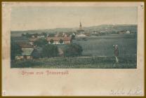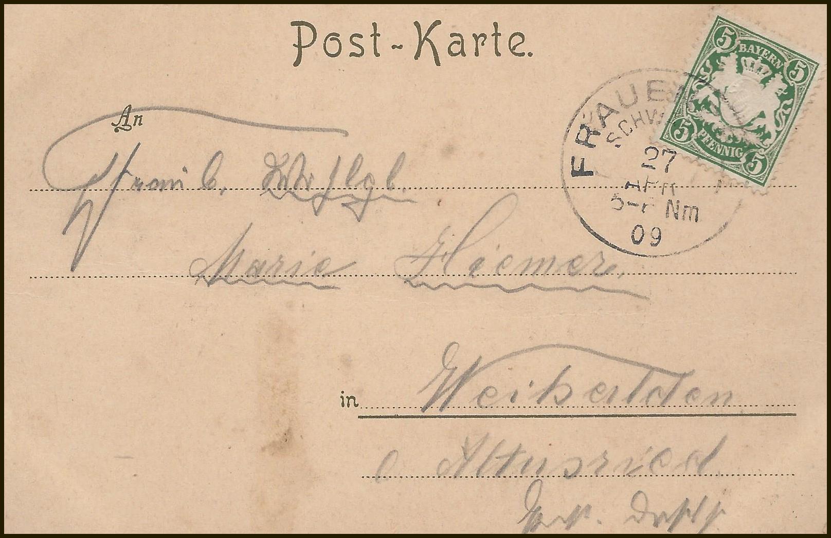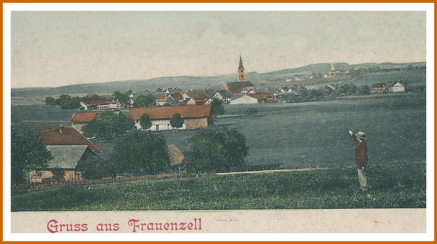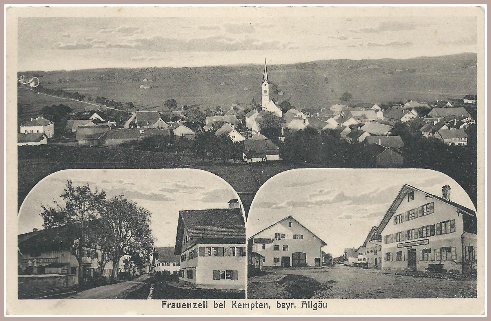 Die Karte wurde am 15. Februar 1901 nach Engelbolzhofen bei Leutkirch geschickt. Rechts im Vordergrund steht ein Mann mit hellem Hut, der mit erhobener Hand auf Frauenzell zeigt. Die Postkarte ist doppelt, einmal gelaufen, einmal ungebraucht,
