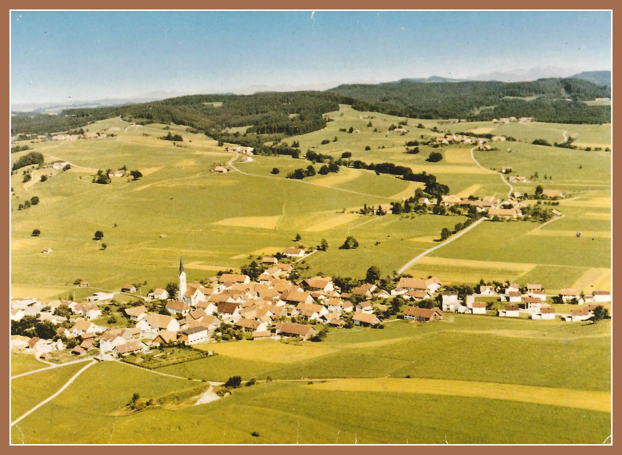 Im Vordergrund sehen wir Frauenzell, dahinter Rungatshofen. Von hier aus geht es rechts weiter zum Vorderbrennberg, links führt die Straße über Gaggen und Maggmannshofen zum Gschnaidt. Von den Höhen des Staatswaldes fließt der Brennberger Bach, von Bäumen eingesäumt, ins Tal. Rechts oben sieht man noch die Wiesenflächen von Walkenberg. Walkenberg ist der östlichste Ortsteil der Gemeinde Altusried und nur über württembergisches Gebiet erreichbar.