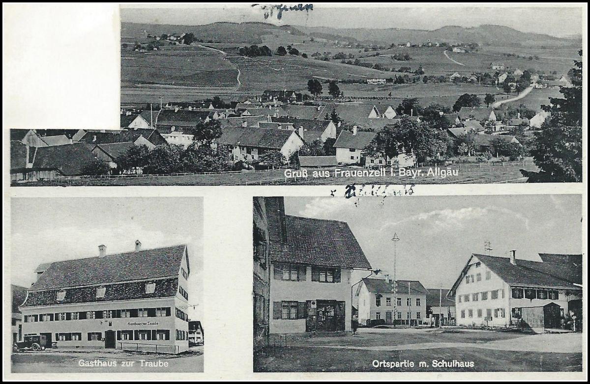 Beide Postkarten machen Werbung für die Handlung von Philipp Völk. Die erste Karte zeigt Frauenzell aus der Vogelschau, im Hintergrund der Vogelberg. Die Karte muss sehr alt sein, denn das Auto vor der Handlung Völk ist ein sehr altes Modell. Die zweite Karte zeigt als eingeschobenes Foto das Dreierensemble der heutigen Häuser Schwalbenweg 2 (Bäckerei Weber), Dorfstraße 18 (Wohnhaus Koch) und Dorfstraße 16 (ehemaliger unterer Wirt "Gasthaus Zur Traube") ; in das Bild hinein ragt das Wirtshausschild vom oberen Wirt "Gasthaus "Zum Löwen".