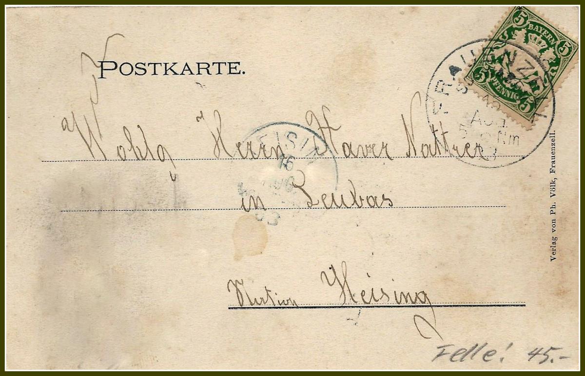 Die Karte geht am 15. August 1905 an den wohlgeborenen Herrn Xaver Natterer in Leubas, Station Heising. Freigemacht ist sie mit einer 5 Pf Bayern Briefmarke mit königlichem Wappen. Auf der Bildseite ist ein Gedicht vermerkt. Die erste Zeile heißt: "Gutes Wetter ganz vorzüglich ". Das idyllische Bild zeigt einen Baum,Weidevieh, das Dorf und den Vogelsberg.