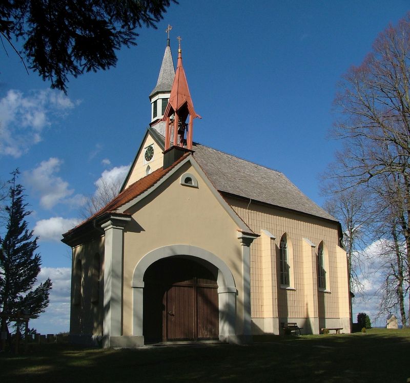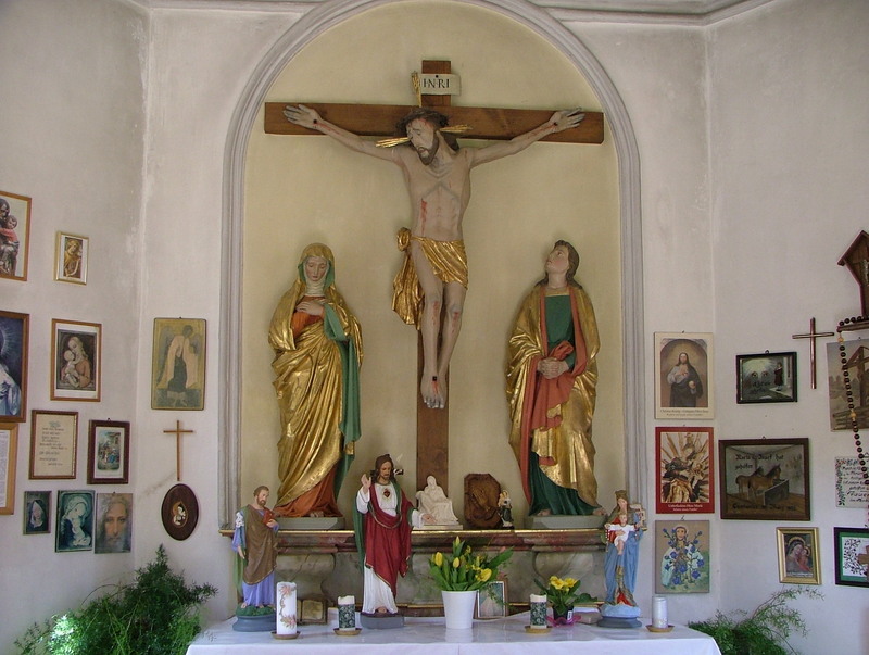Die kleine Kapelle wurde 1750 errichtet, wurde aber 1767 schon wieder abgebrochen. 1848 wurde sie neu erstellt durch J. A. Daibler, nun aber nach Norden ausgerichtet. Eine neue größere Kapelle im neugotischen Stil wurde 1859 von dem Baumeister Martin aus Grönenbach erstellt. Es ist ein dreiseitig geschlossener Saal mit Netzgewölbe, dazu ein geräumiger Vorraum, auch der neugotische Altar ist im Stile der Erbauungszeit. Ebenso stammen die Kreuzwestationen, die hinab zur Quelle führen, aus der Zeit um 1856. Eine Reihe großer Kreuze umgibt auf dem Foto die kleine Kapelle. Es sind Wallfahrtskreuze, die Wallfahrer mitgetragen und hier aufgestellt haben. Den Brauch Kreuze aufzustellen gibt es auch heute noch, jedoch in veränderter Form. Hölzerne Sterbekreuze finden hier eine letzte Stätte. Wohl mehr als tausend Kreuze umgeben heutzutage den Ort.