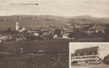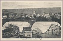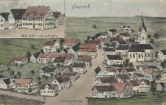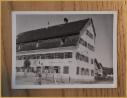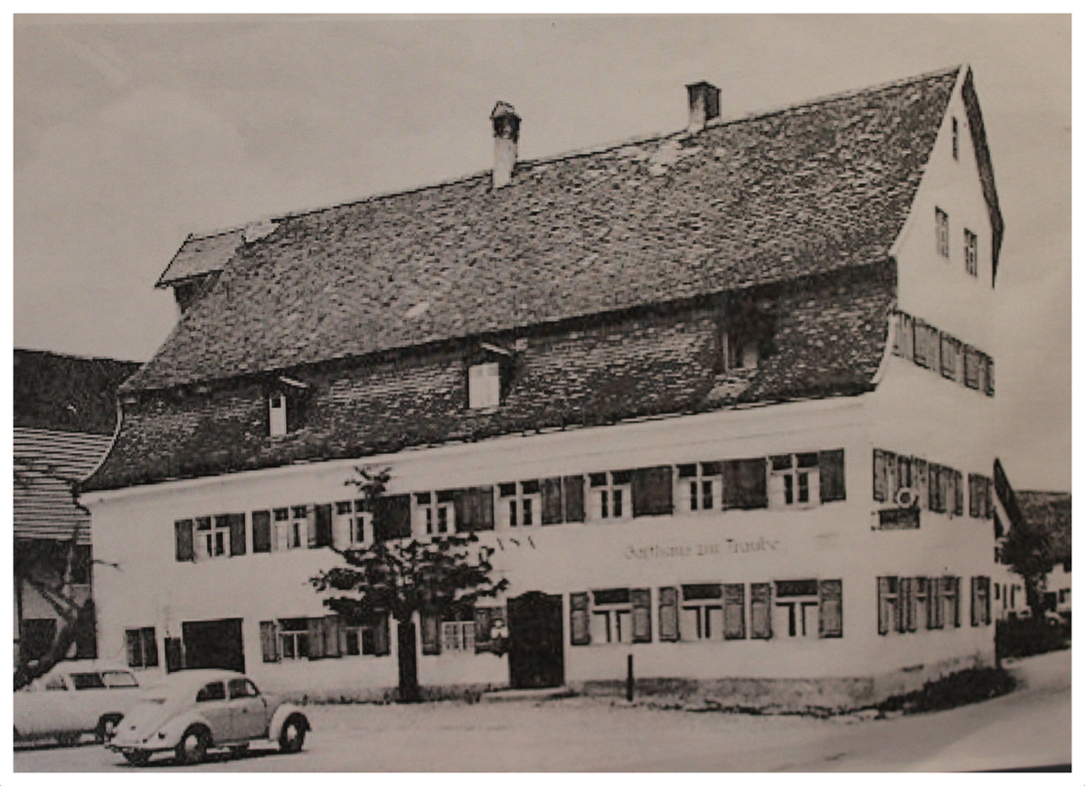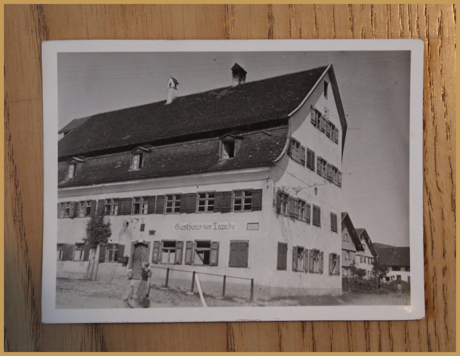 Das ganze Dorf Frauenzell ist aus der Vogelschau dargestellt. Besonders hervorgehoben ist " Johann Reisachers Gastwirtschaft ", die bereits 1593 als Wirtschaft erwähnt wird. Bis um 1770 hieß die Wirtschaft " Zum Hirsch " und seither bis zu ihrem Verkauf 1986 durch Otto Ochsenreiter " Zur Traube". Otto Ochsenreiters Vater Xaver Ochsenreiter hatte die Traube 1919 von Johann Reisacher übernommen; im Laufe der Jahre entstand daraus landläufig der Name " beim Ochsenreiter ". Besonders auffällig ist der Knick in der Ostfassade des Gasthofes, trotzdem fügt sich das Gebäude harmonisch in den Verlauf der Straße ein. - Auf Bild 1 und Bild 4 ist als oberstes, letztes Haus das gemeindeeigene, früher so genannte " Armenhaus " ( heute Haus Lindenbergstraße 2) zu sehen. Im " Armenhaus " fanden seit jeher Bedüftige der Gemeinde eine Bleibe, dies vor allem und in der Zeit nach 1945, als betagte Heimatvertriebene und Flüchtlinge aus dem Osten Deutschlands ( z.B. Schlesien, Sudetenland ) Zuflucht in Frauenzell fanden. Bild 5: Die Traube wie sie früher ausschaute. Vor allem das Dach unterscheidet sich. Das Dach war eingeteilt in zwei Hälften, zuerst ein steiles Dach mit mansardenmäßigen Fenstern, sodann die etwas flachere zweite Hälfte.