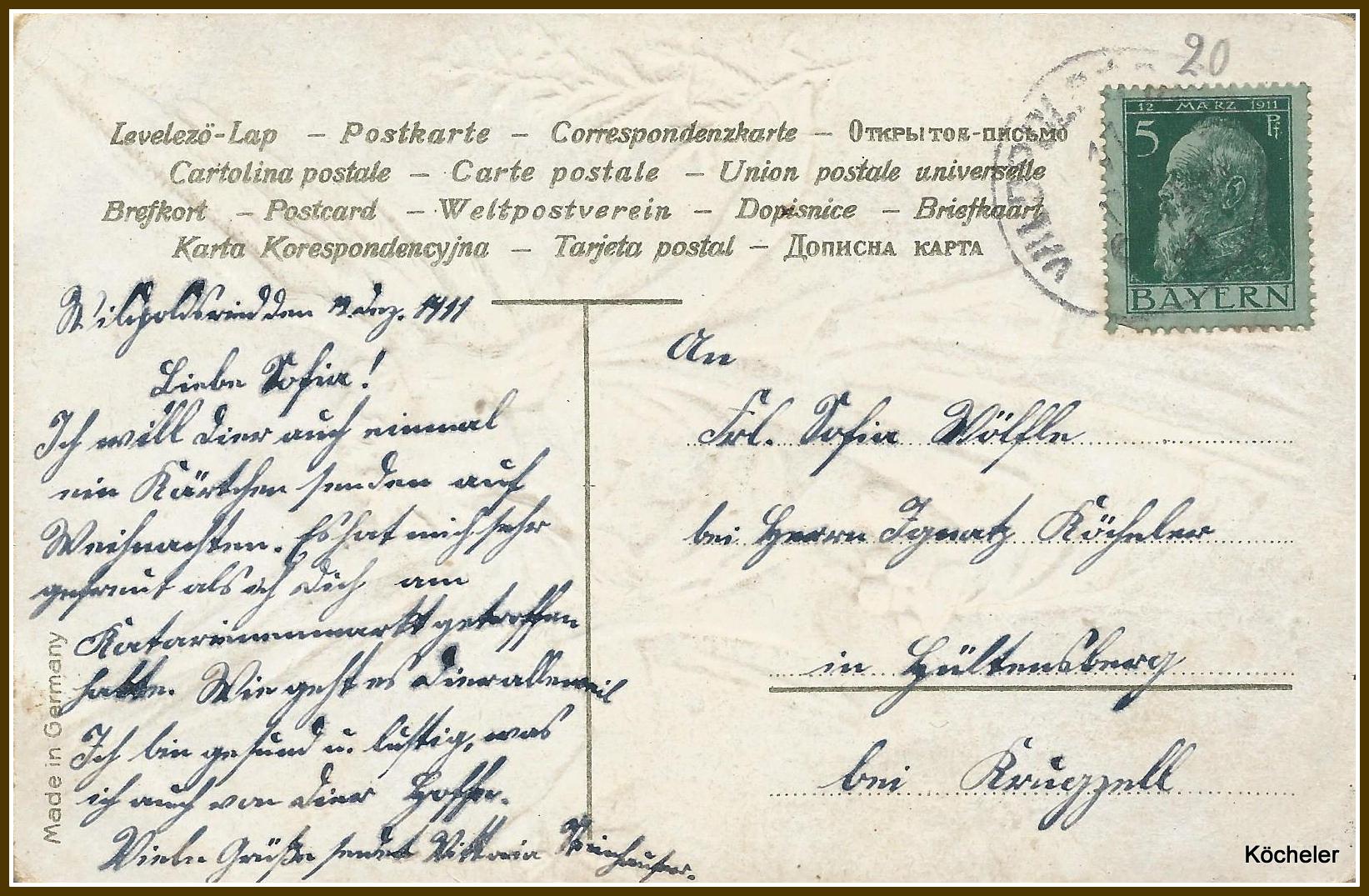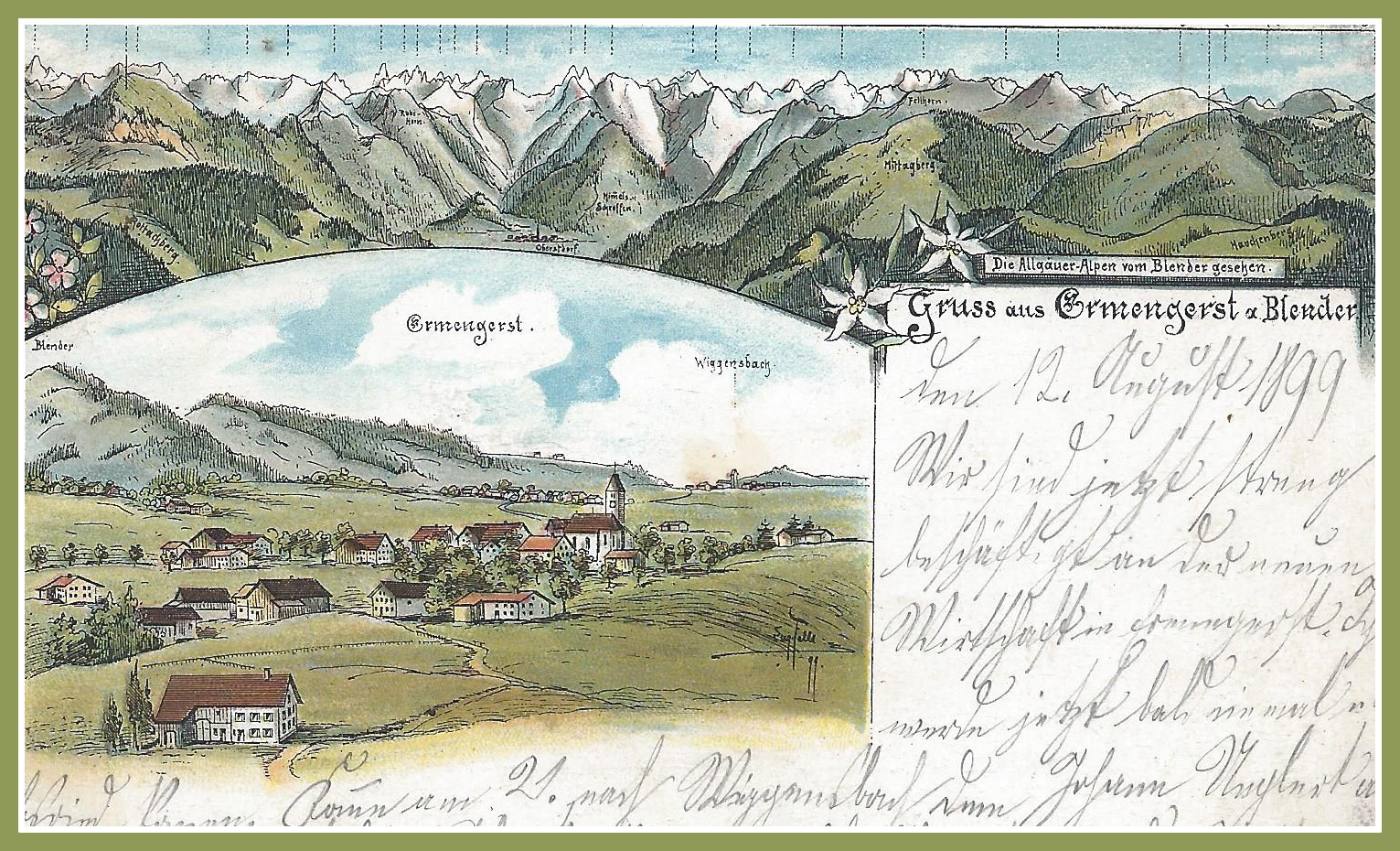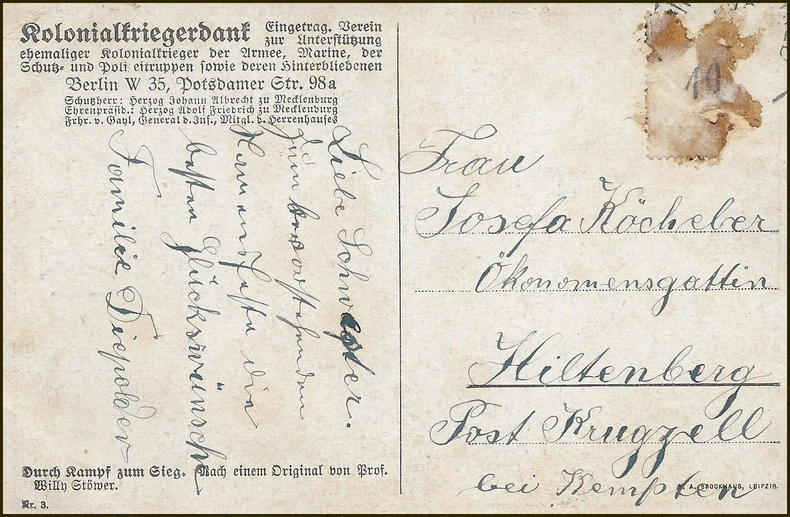 Seit jeher haben die Menschen eine große Sehnsucht nach Bildern und Nachrichten aus der Ferne. Noch aber war das Fernsehen nicht erfunden. Es war die Zeit der Postkarte. Damit konnte man Nachrichten in die weite Welt schicken und empfangen. Das ging zwar nicht blitzschnell, war aber zuverlässig. Fleißige Schreiber und Sammler waren die Köchelers in Hiltensberg bei Krugzell. Gewissenhaft sammelten sie ihre Korrespondenz in Alben. Die Alben spiegeln auch die Reisefreudigkeit der Familie wieder.  So kamen in den Jahren 1910 bis 1930 mehrere hundert Bildpostkarten zusammen. Die Kartenbilder mit den Texten waren auch eine Art Familienchronik und für die Kinder Bilderbücher, die man immer wieder anschaute.  Heute sind die Karten im Besitz von S. Albrecht, geborene Köcheler.