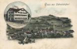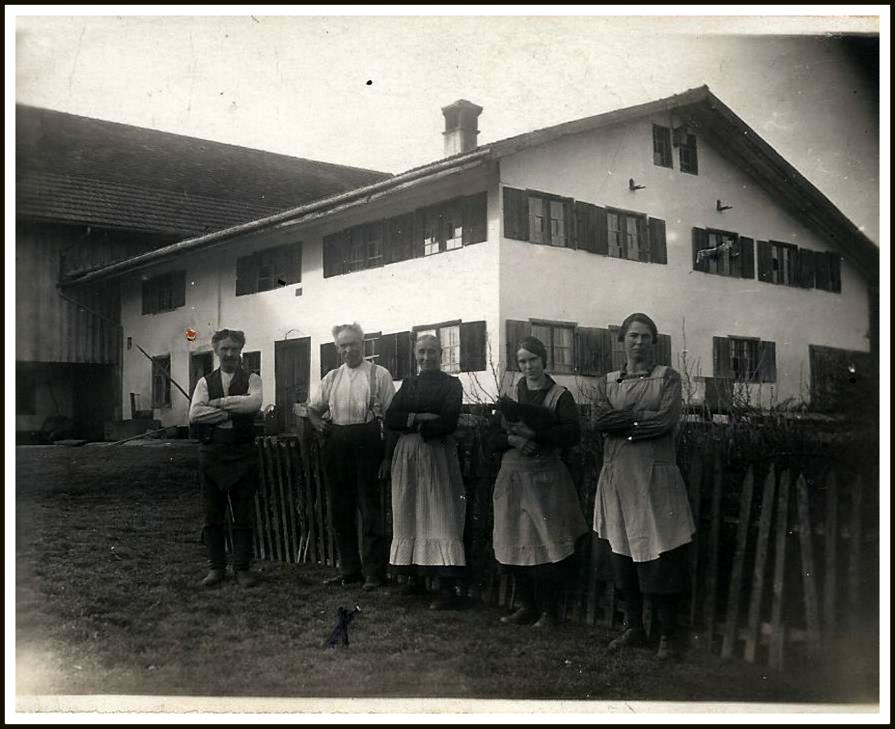 1.  Anblick des Köcheler Hofes Hiltensberg Nr. 188 um 1900. Der ursprüngliche Hakenschopf ist schon ersetzt durch einen Widerkehr, der mit Steinen aufgemauert ist. Vor dem Hof haben sich aufgestellt: Joseph , Viktoria , Sophie , Maria , Josefa , Ignatz  und Lorenz Köcheler .