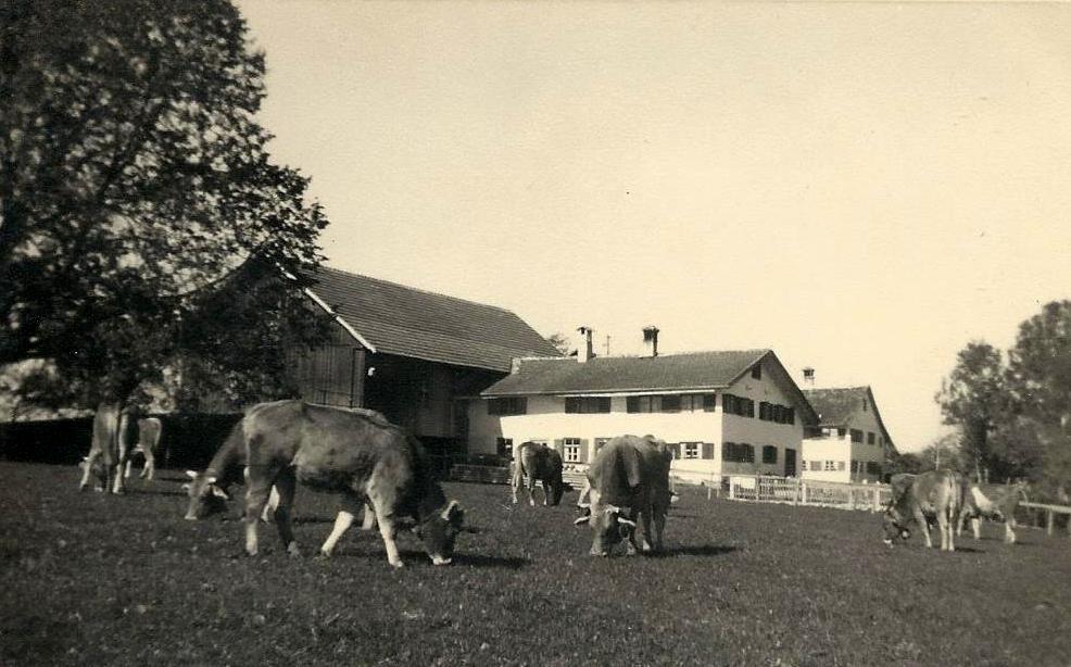 3.  1950  Jungvieh weidet vor dem Hof. Vor dem Hof steht eine stattliche Linde, die 1862  gepflanzt wurde. Anlass war die Primiz von Briechle aus Hiltensberg.