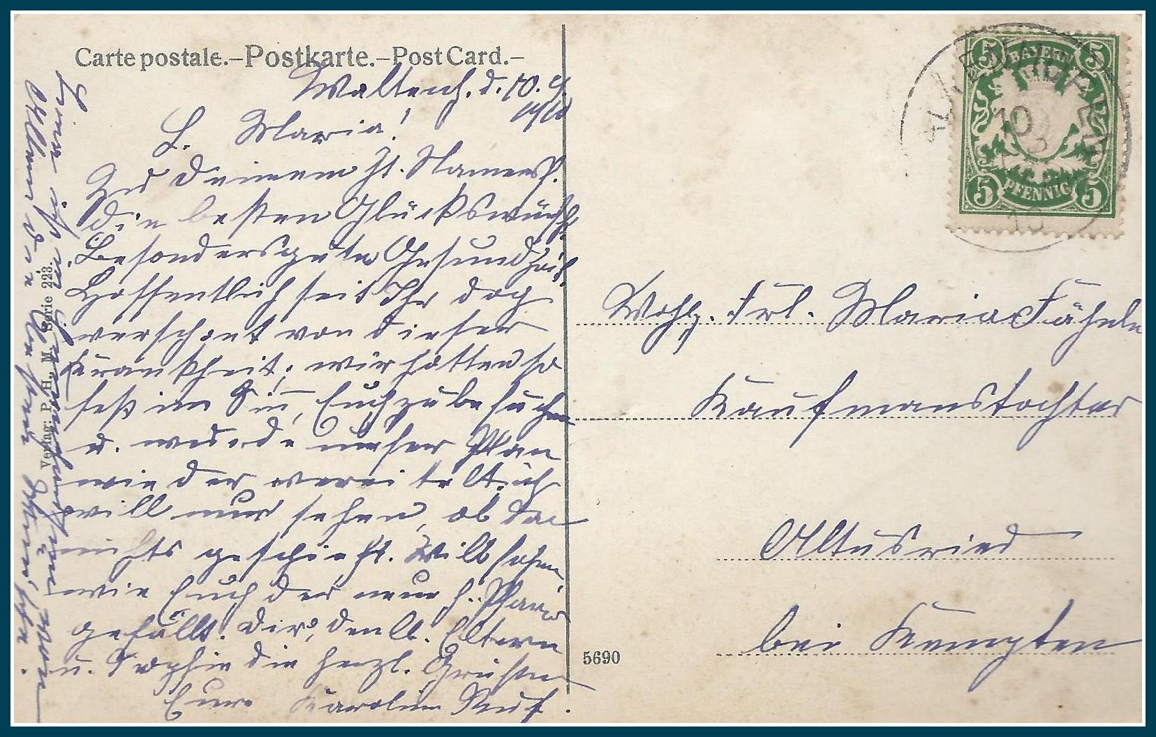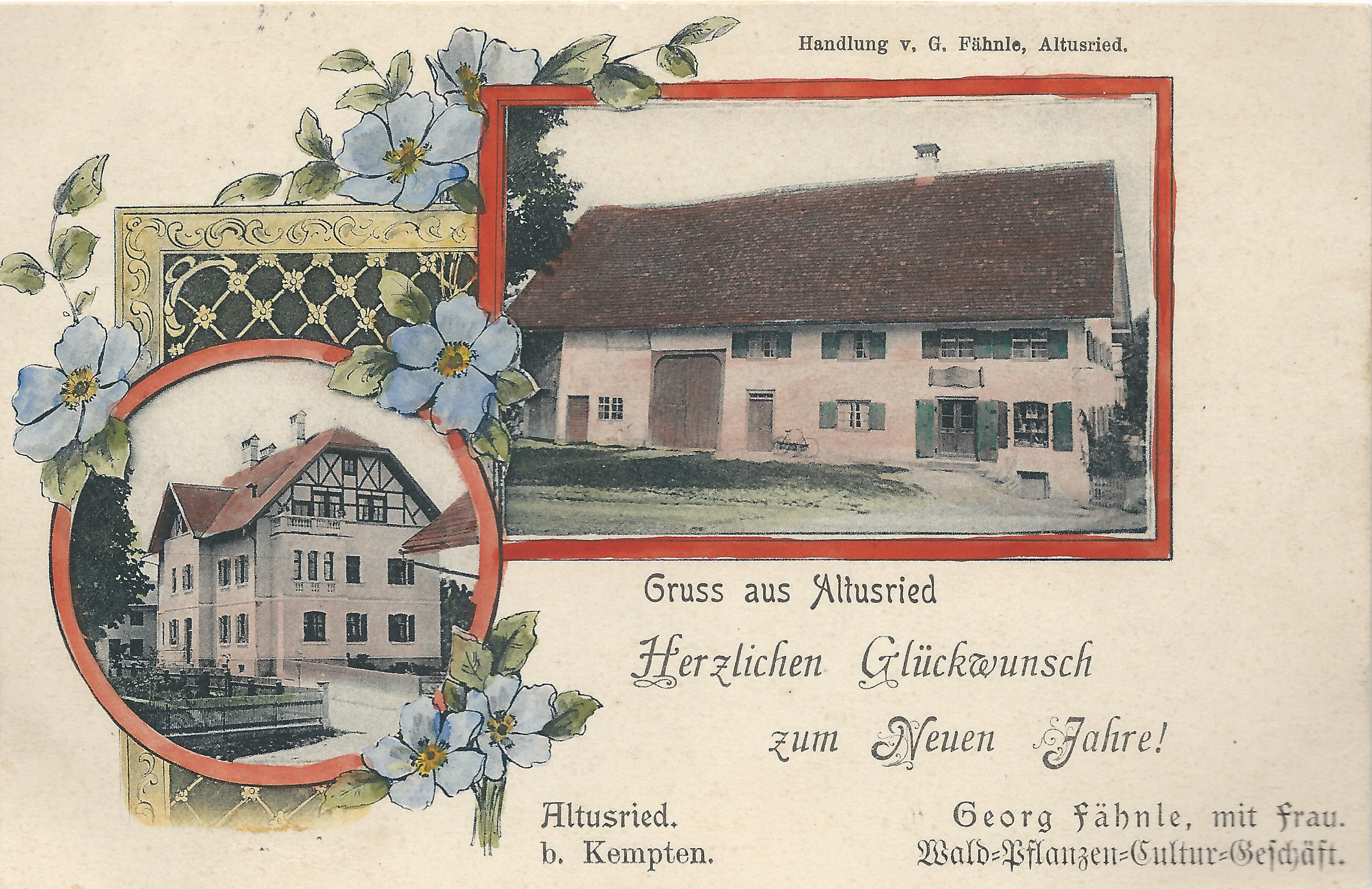 Gabriele Hiemer war Nachbarin von Maria Fähnle. Sie erinnert sich noch an das Austragsstüble, in dem M. Fähnle wohnte. Wichtigstes Möbelstück war ein prächtiger Sekretär mit vielen Schubladen zur Aufbewahrung von allerlei Utensilien. Nur die Postkarten und ein Buch haben die Zeiten überdauert . Bei dem Buch handelt es sich um eine gebundene Beilage zum Allgäuer Volksfreund, Jahrgang 1899. Auf der Innenseite des Einbandes hat Fähnle vermerkt: Eigentum von Maria Fähnle Altusried, 1901. - Darunter mit Bleistift: 30.9. 90 Fridolin Daiser, nicht verkaufen, könnte sehr wertvoll sein, aber noch warten.