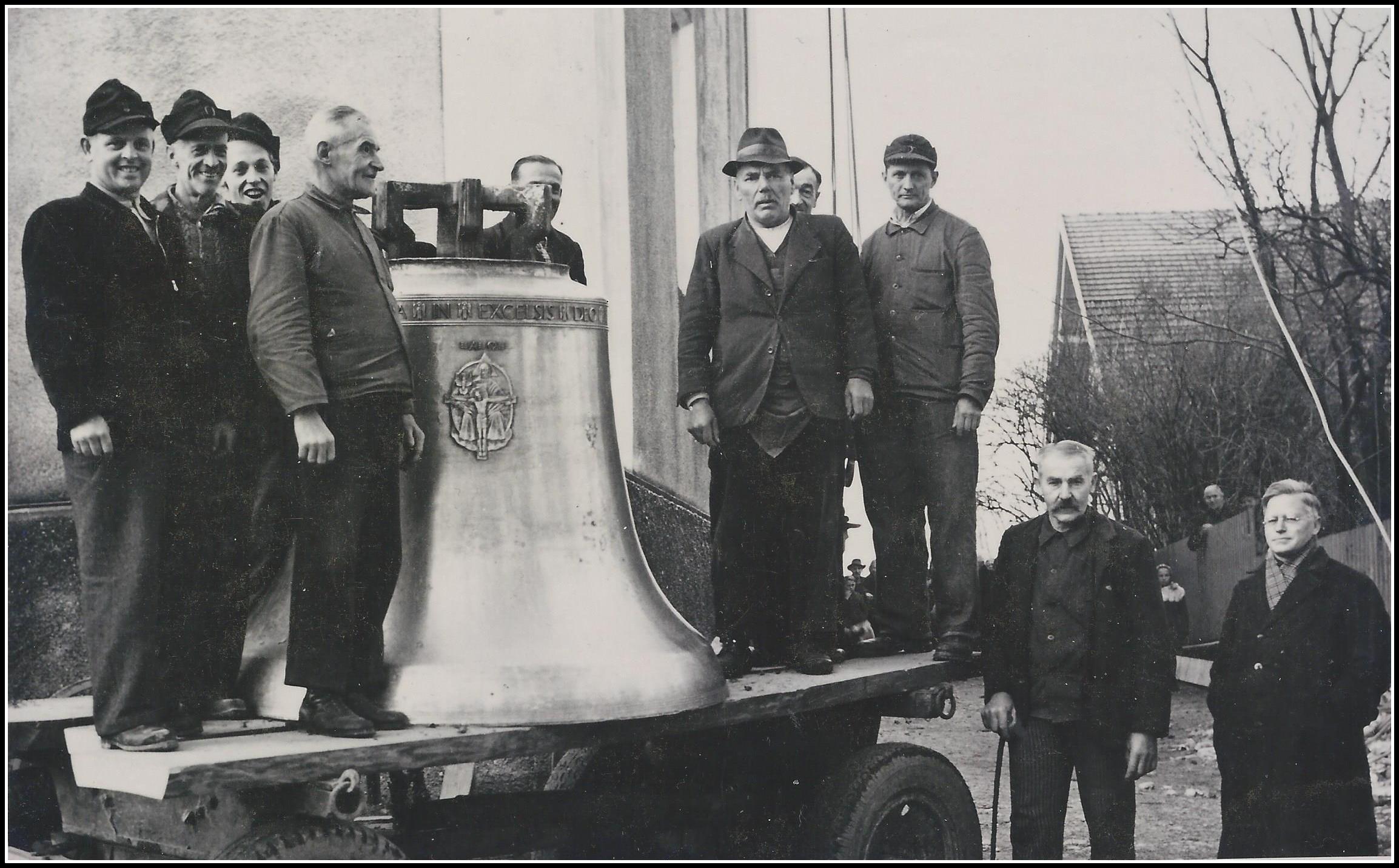 1952 Glockenweihe. Ganz links Fridolin Daiser, 1913-1990. Ganz rechts Pfarrer Miller.