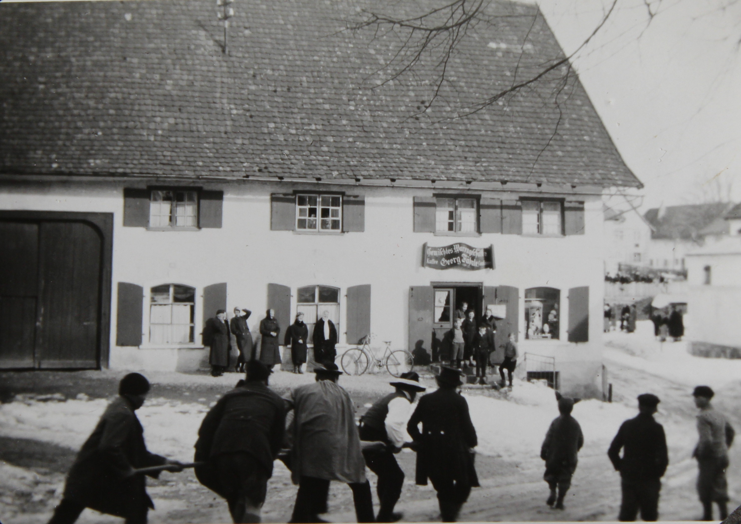 Pferd vor dem Fähnle Haus, rechts Blick in Richtung Brändle Haus und zum sogenannten Schlössle